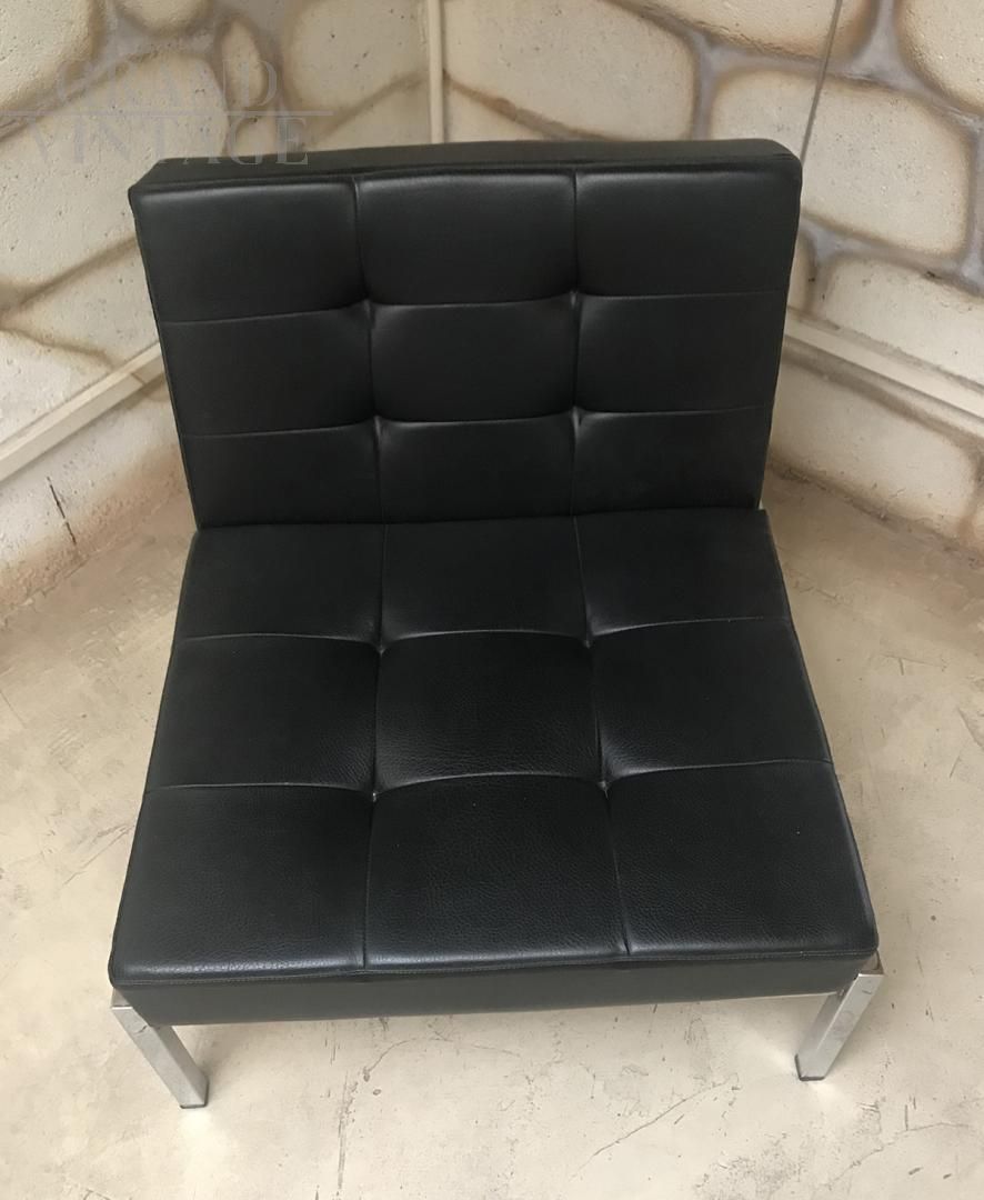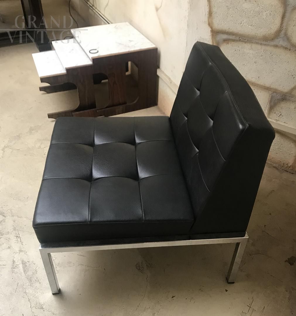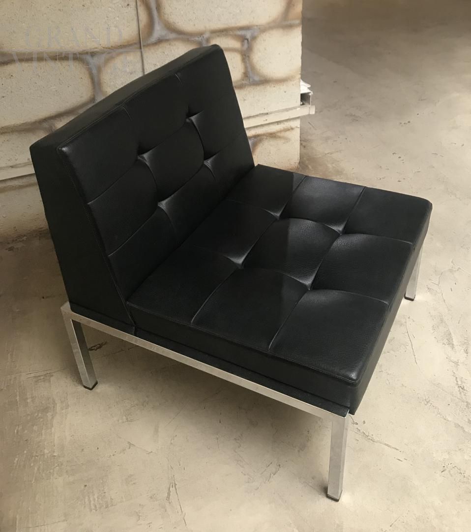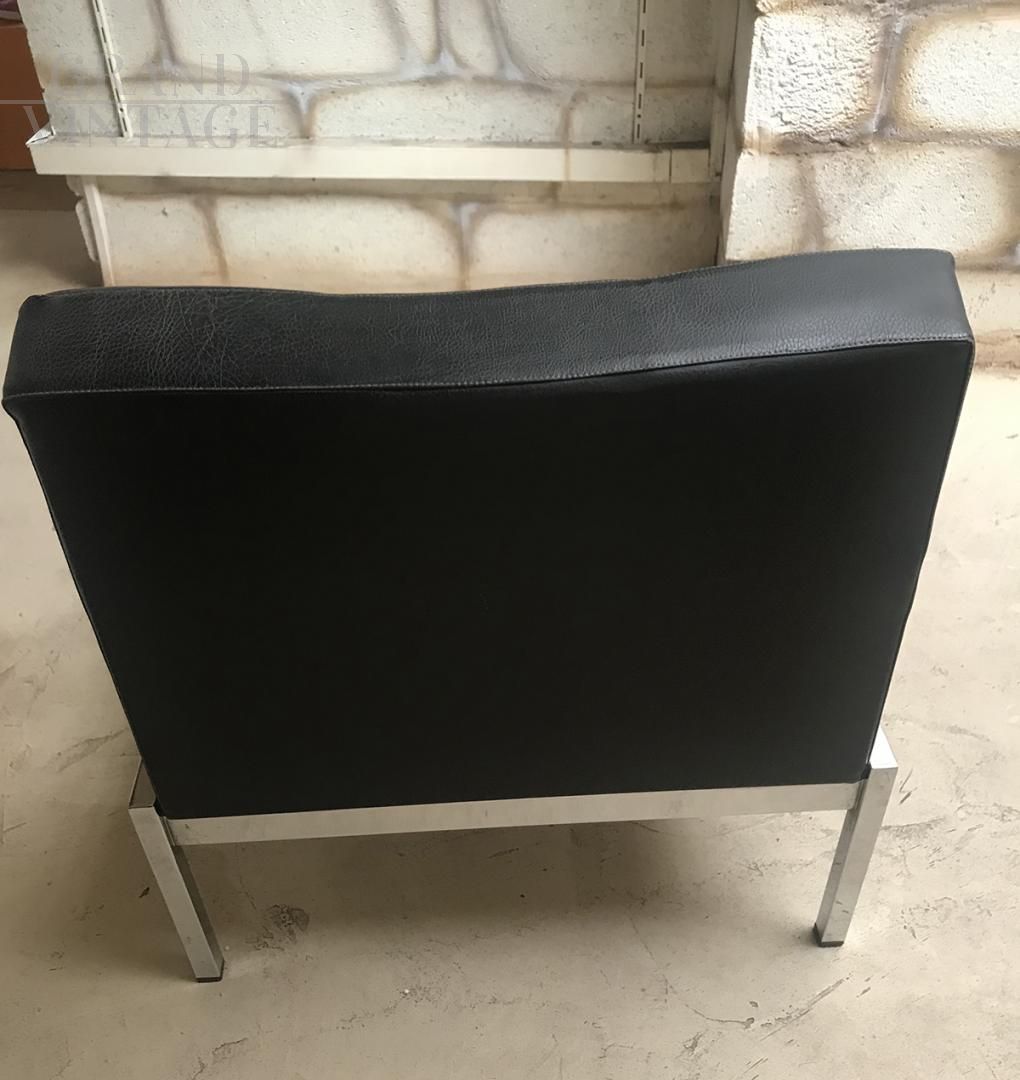 Samurai - Samouraï chauffeuse low armchair by Joseph André Motte for Airborne. Model from the 1970s, designed for Orly airport, Airborne label under the seat. Seat and back upholstered and covered in black skai, chromed structure. In perfect condition.