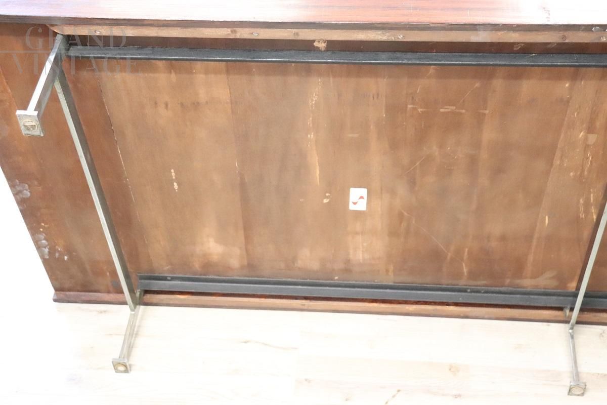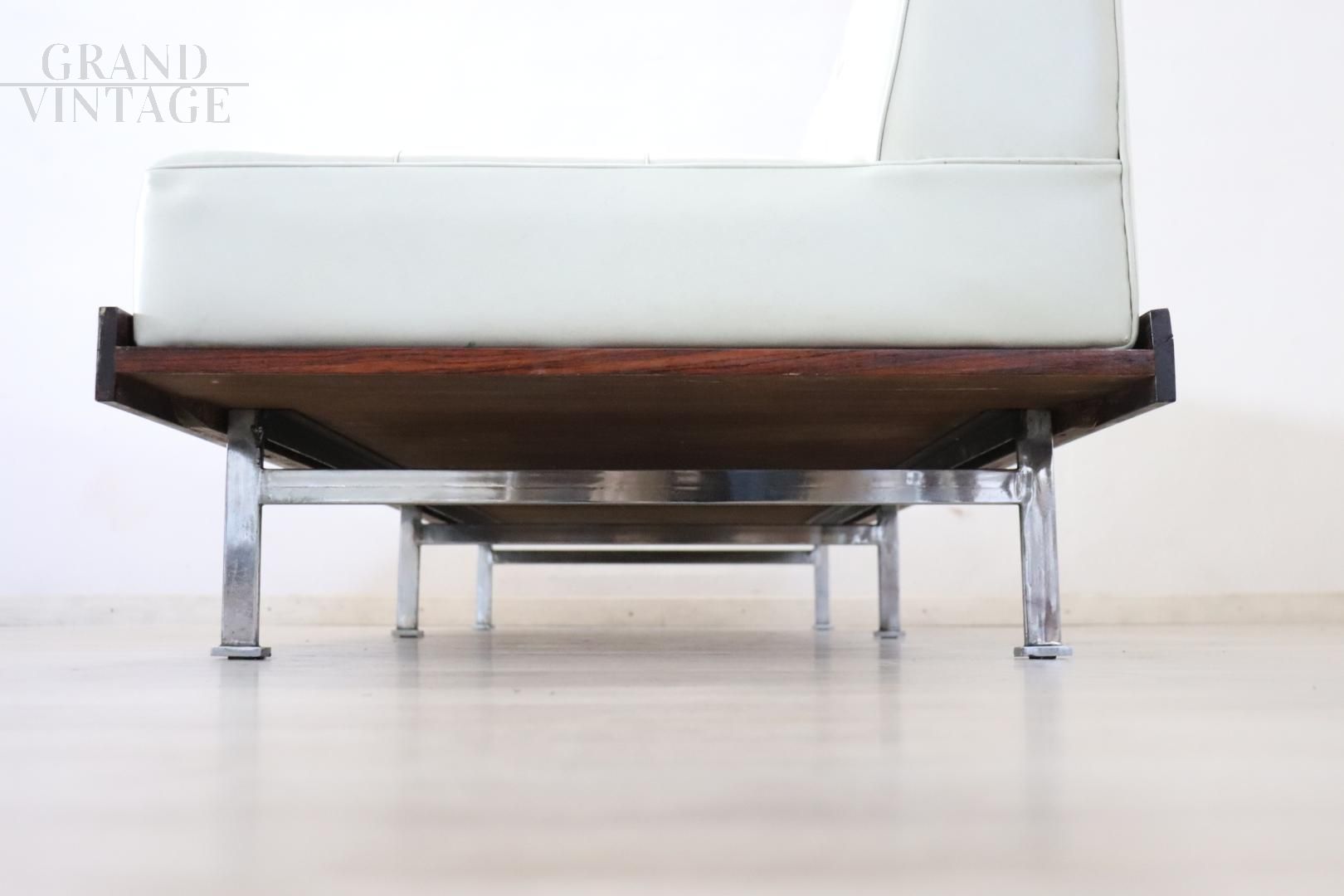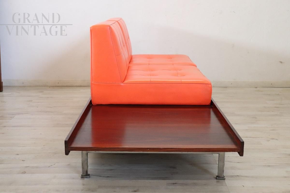 This stunning mid-century set embodies the distinctive aesthetic of 1960s Italian design, epitomizing sophistication and style. The sofa set, consisting of two beautifully padded sofas upholstered in high-quality faux leather, boasts a rosewood veneer base, all supported by elegant chrome-plated metal legs that add a touch of modernity. One of the sofas proudly features the original Saporiti label, a testament to its authentic heritage. What sets this sofa set apart is its innovative design; the two-seater sofa includes a unique wooden base that doubles as a practical storage surface or a built-in coffee table, enhancing both functionality and style. Price negotiable. Same dimensions.