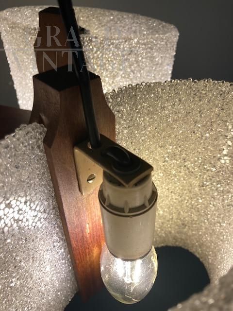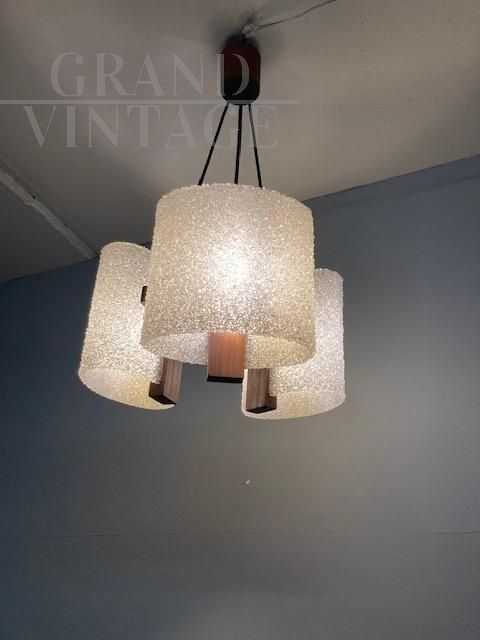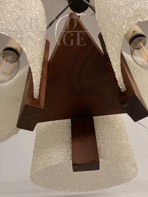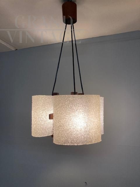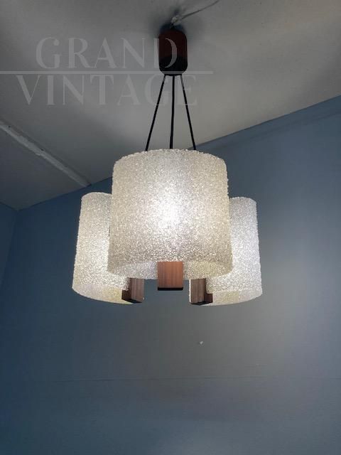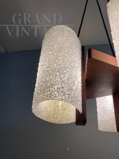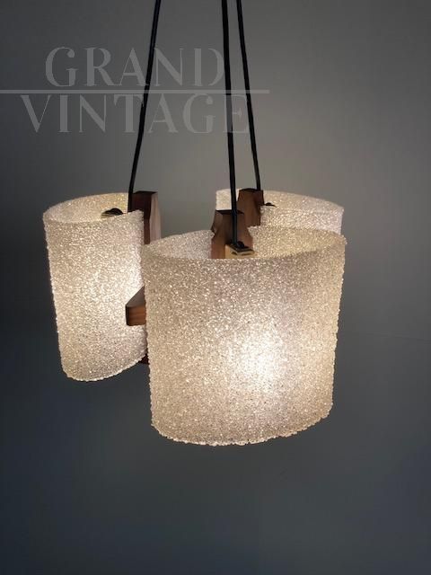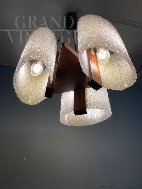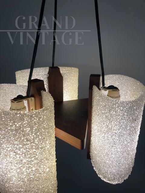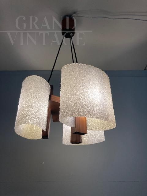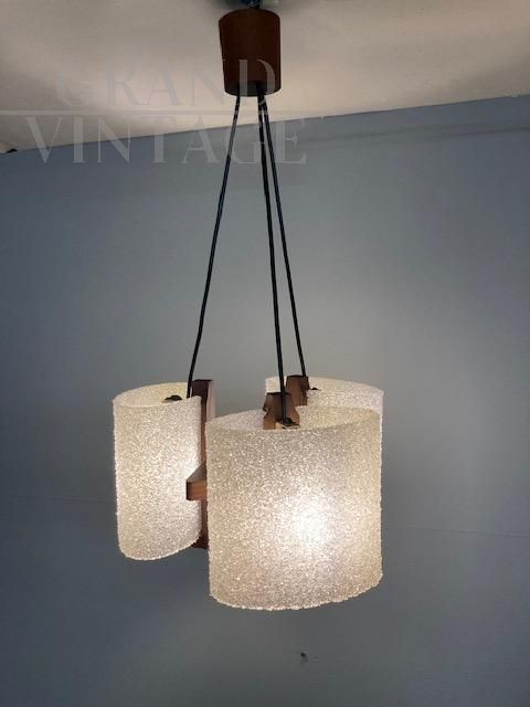 Scandinavian style mid-century chandelier, vintage from the 70s, with three light points, solid teak structure and glass lampshades, restored and overhauled, in perfect condition.
