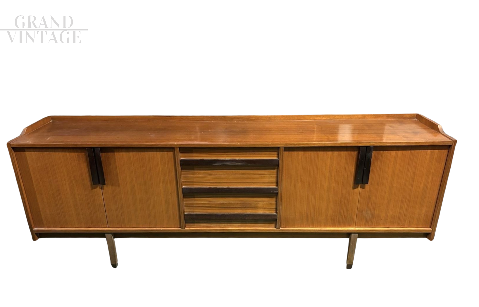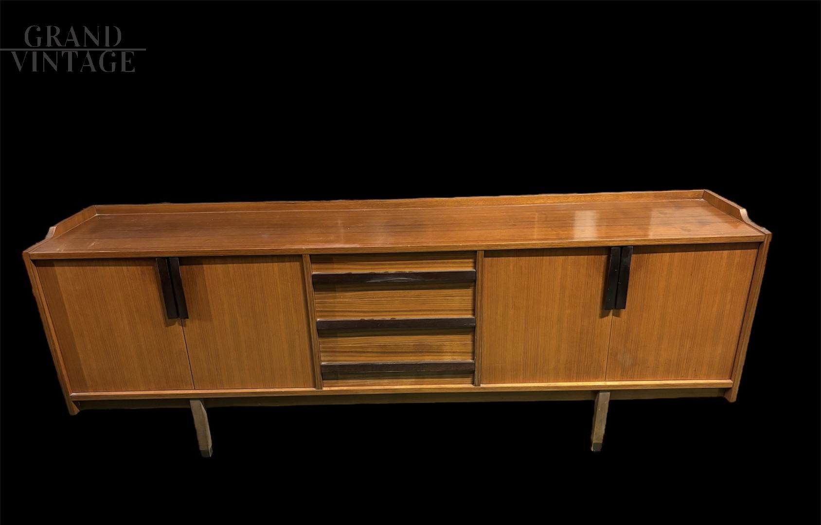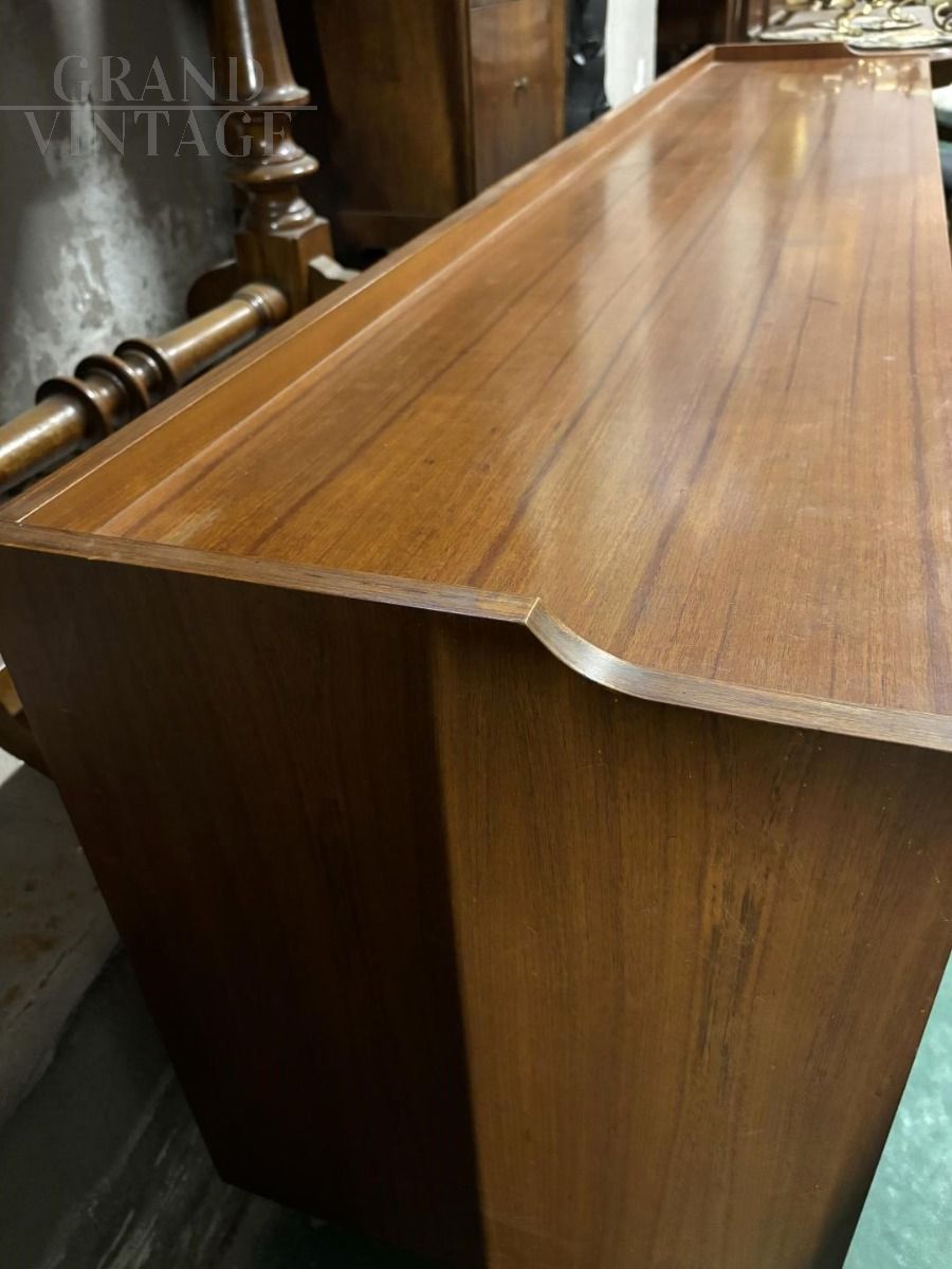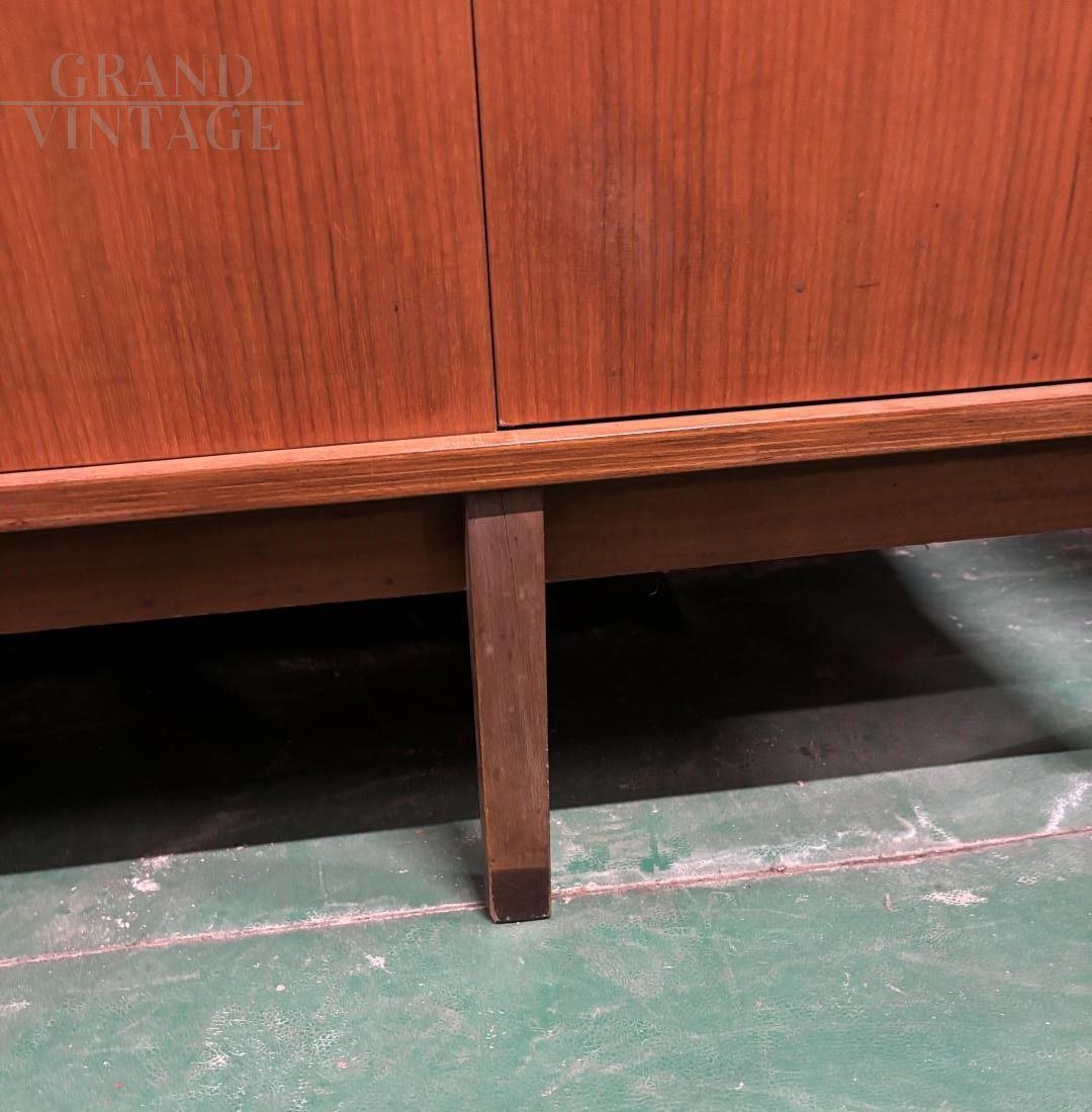 Vintage Scandinavian sideboard in teak wood with 4 doors and 3 drawers, with dark wood elements.