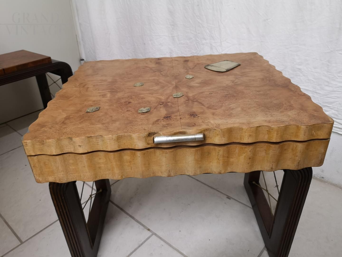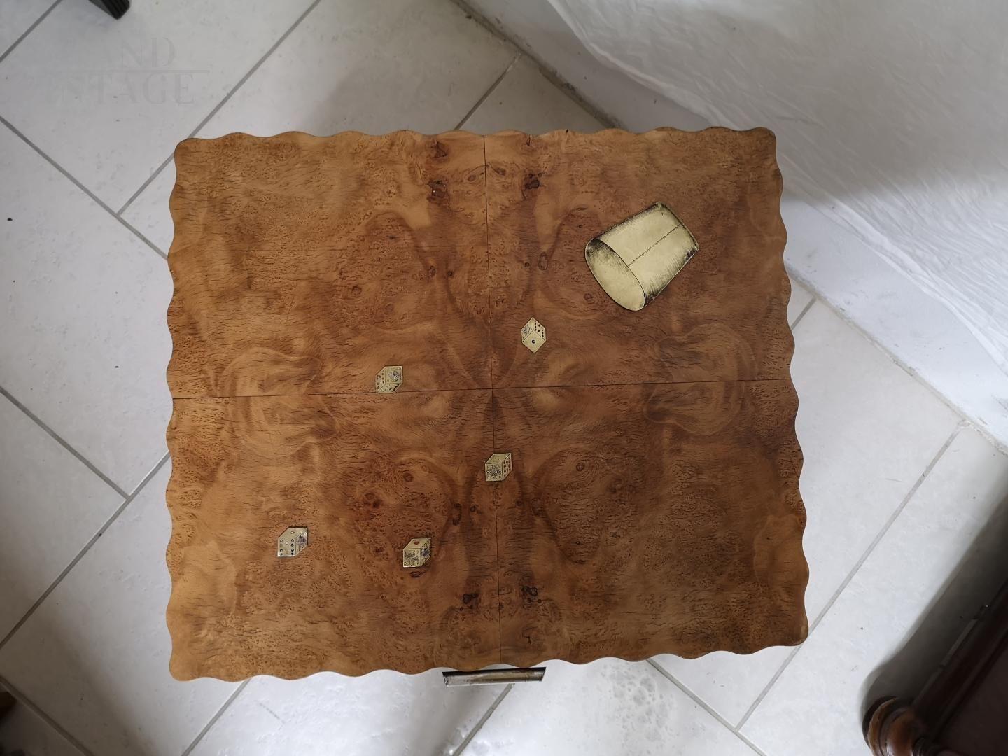 Beautiful Art Deco game box in tuja briar, complete with all components: roulette with chips, dice, dominoes and pieces for the chessboard placed under the lid.
