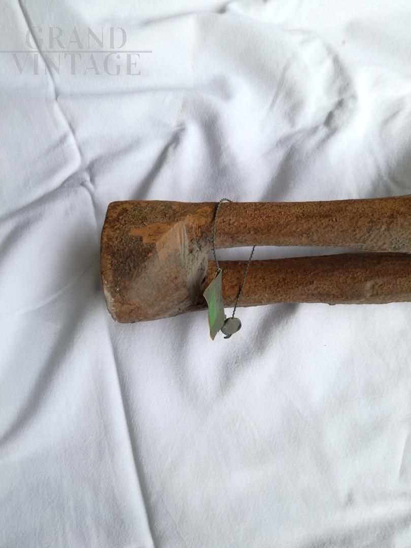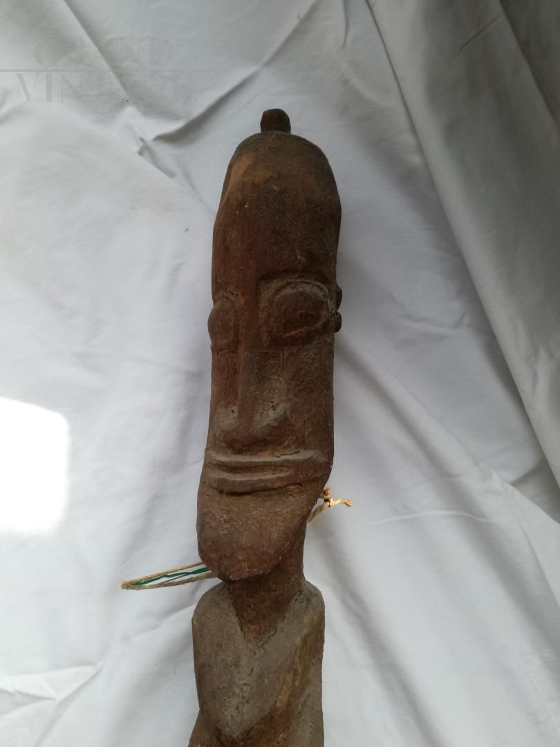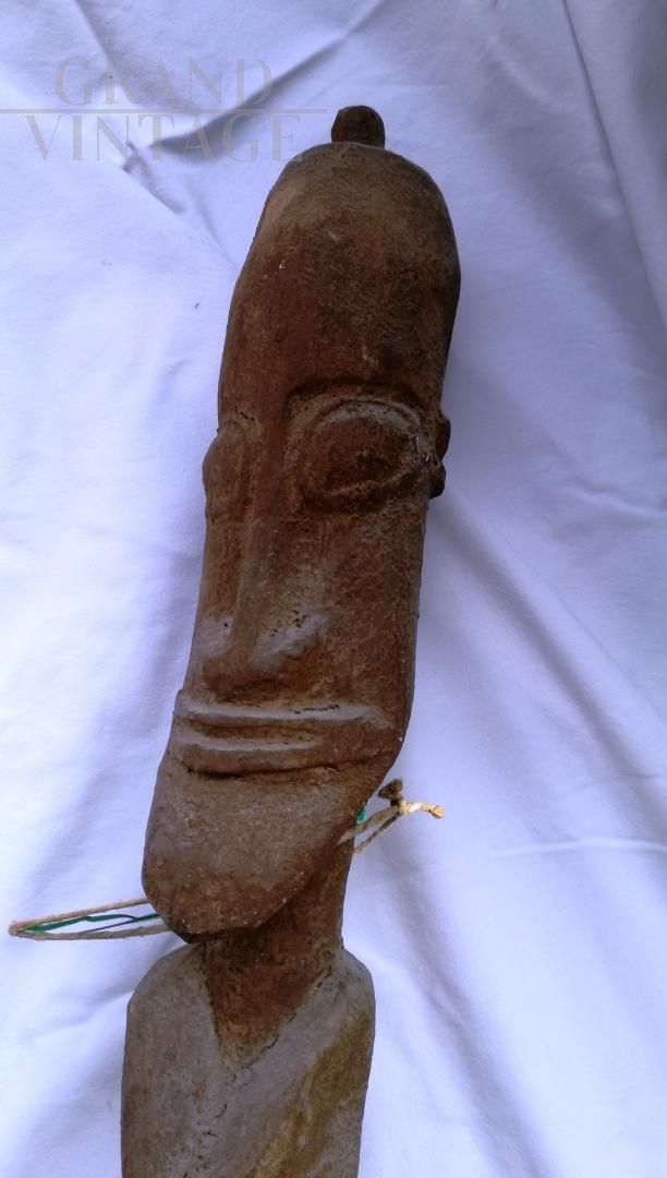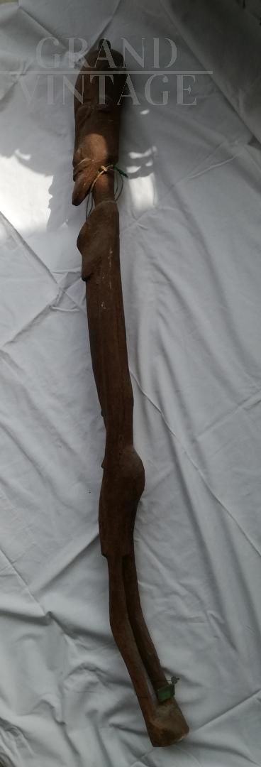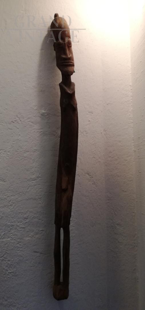 Wooden sculpture with a long-limbed figure, African art from the 70s, portrait of an ancestor in light and porous wood. The sculpture is accompanied by a leaded tag with the words: Auracana - ethnological work n ° 017 / b. It dates back to the 1970s.