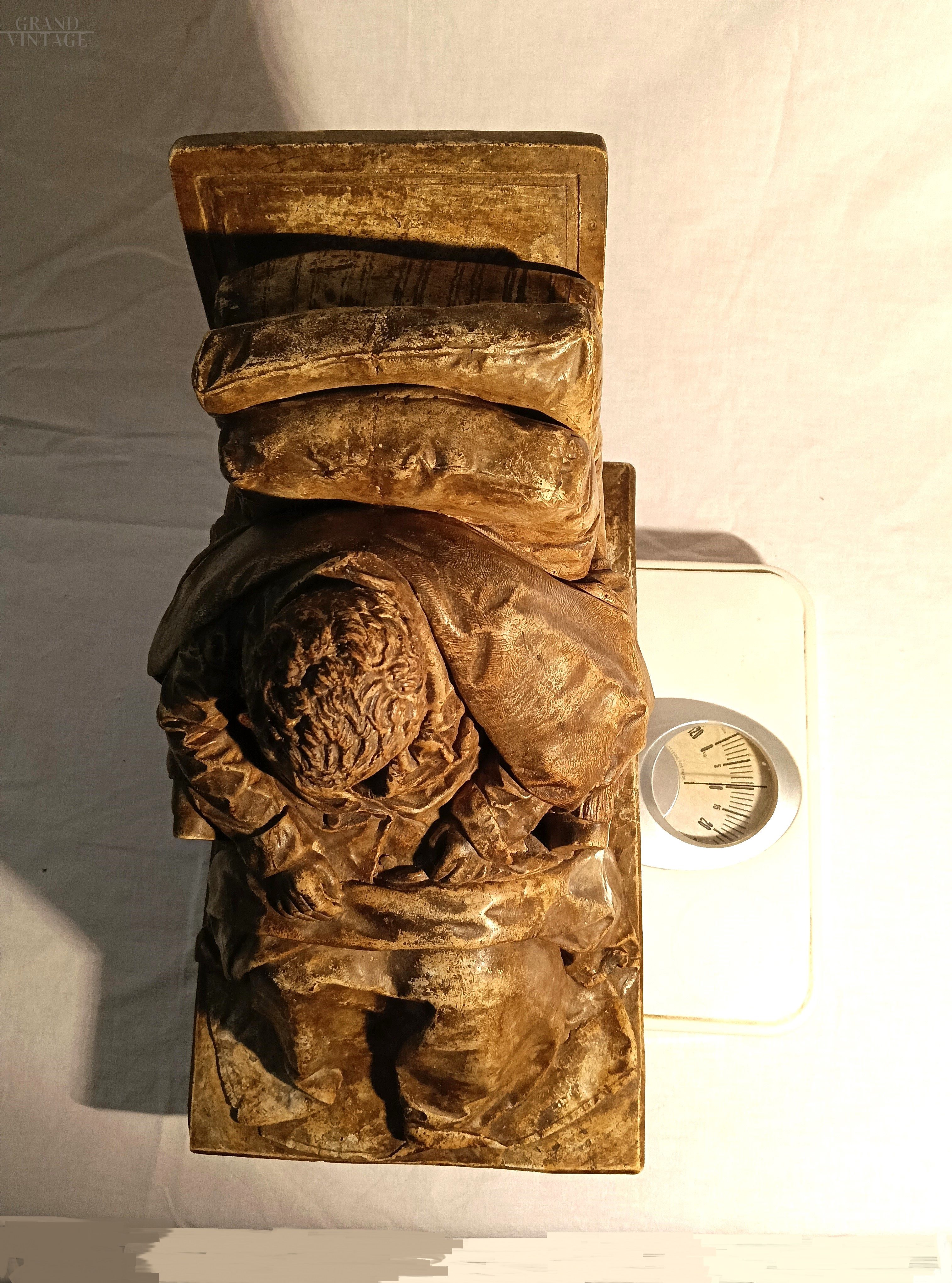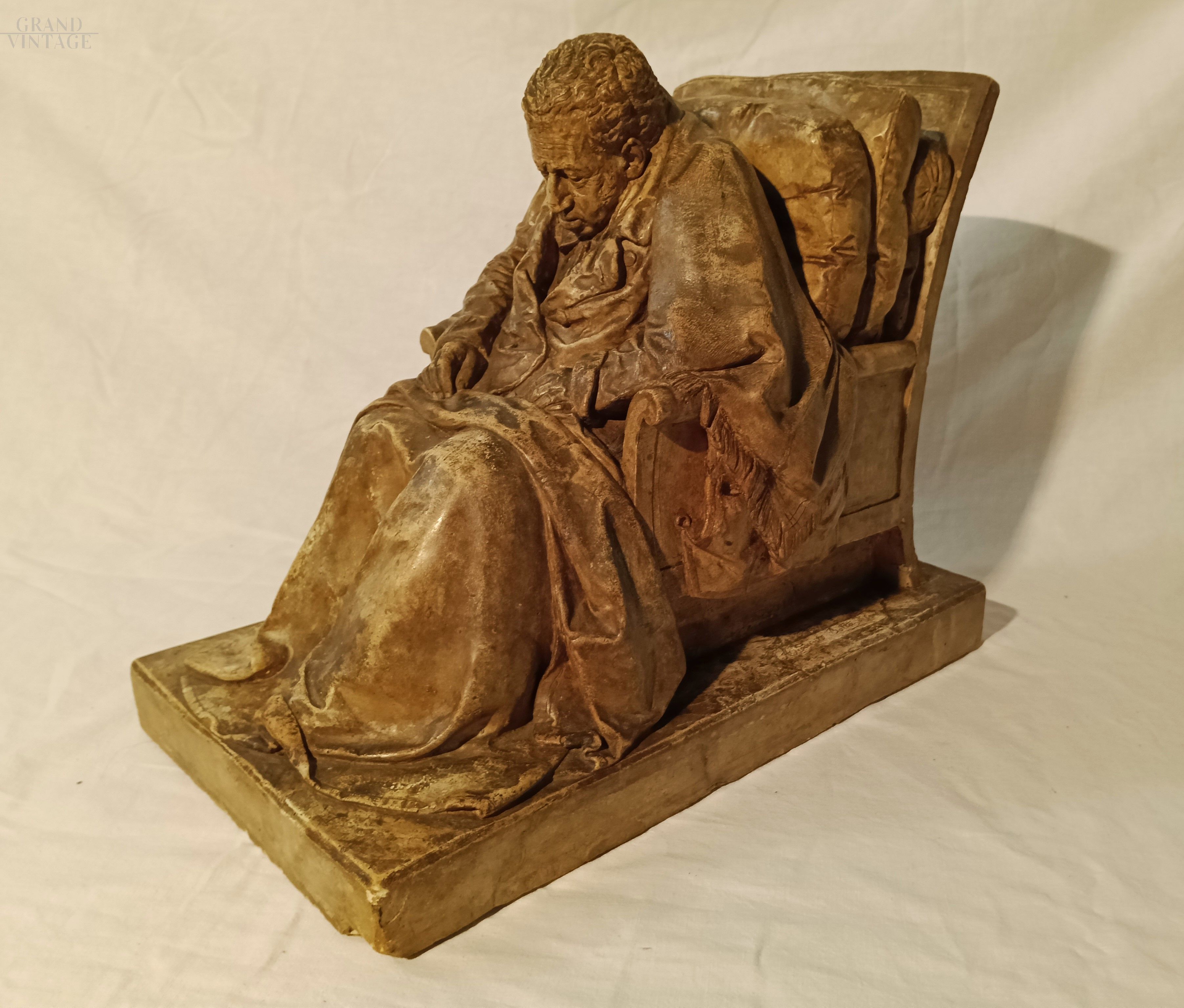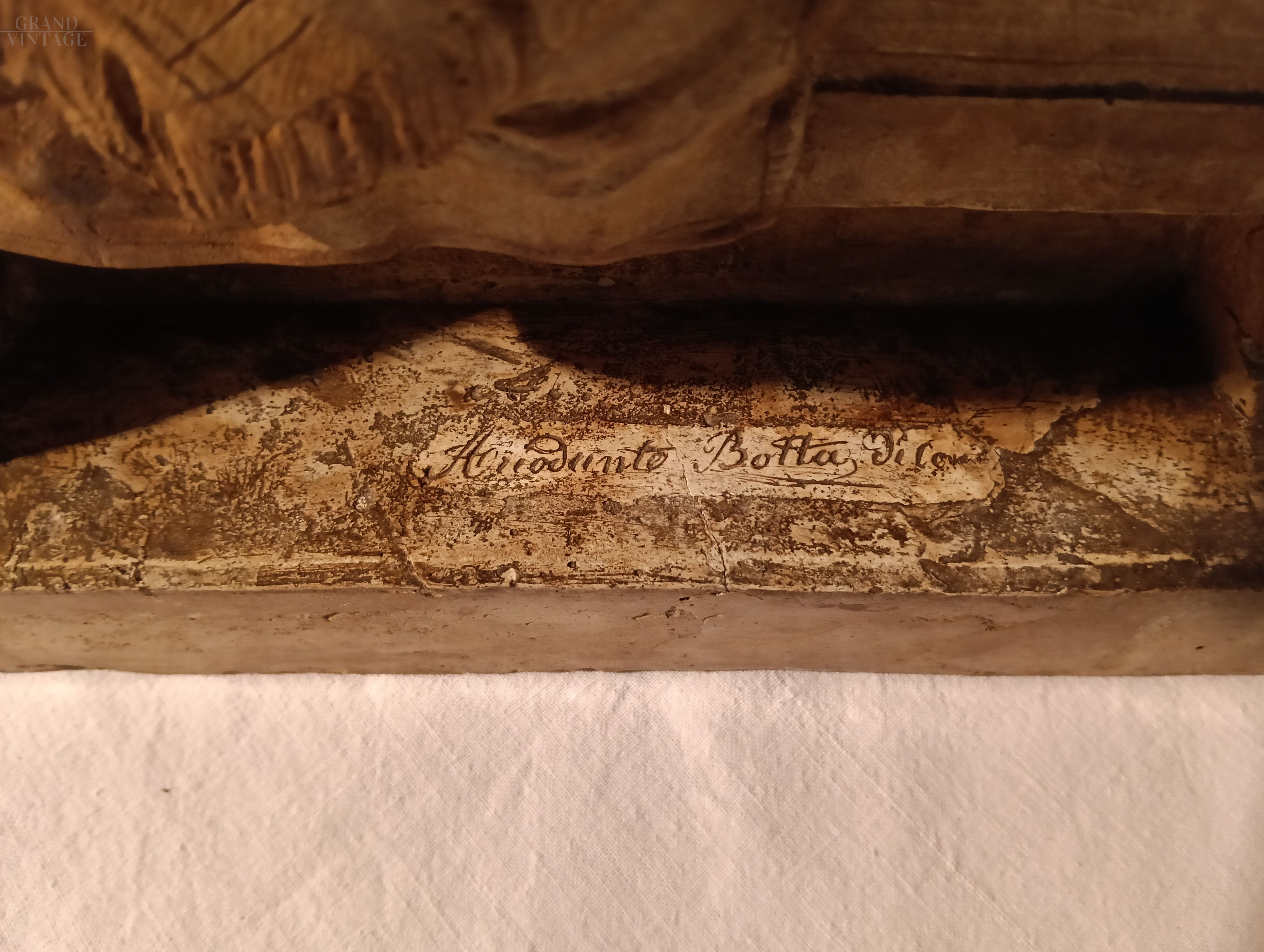 Sculptural reproduction in glazed stone and reinforced plaster, copy of the Seated Male Portrait of Vittorio Alfieri, created by Pompeo Marchesi (circa 1840). Signature on the base "Ariodante Botta di ce...". It has a repaired edge in gold leaf as shown in the photo. Very heavy sculpture.
