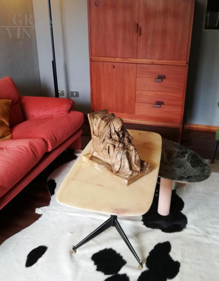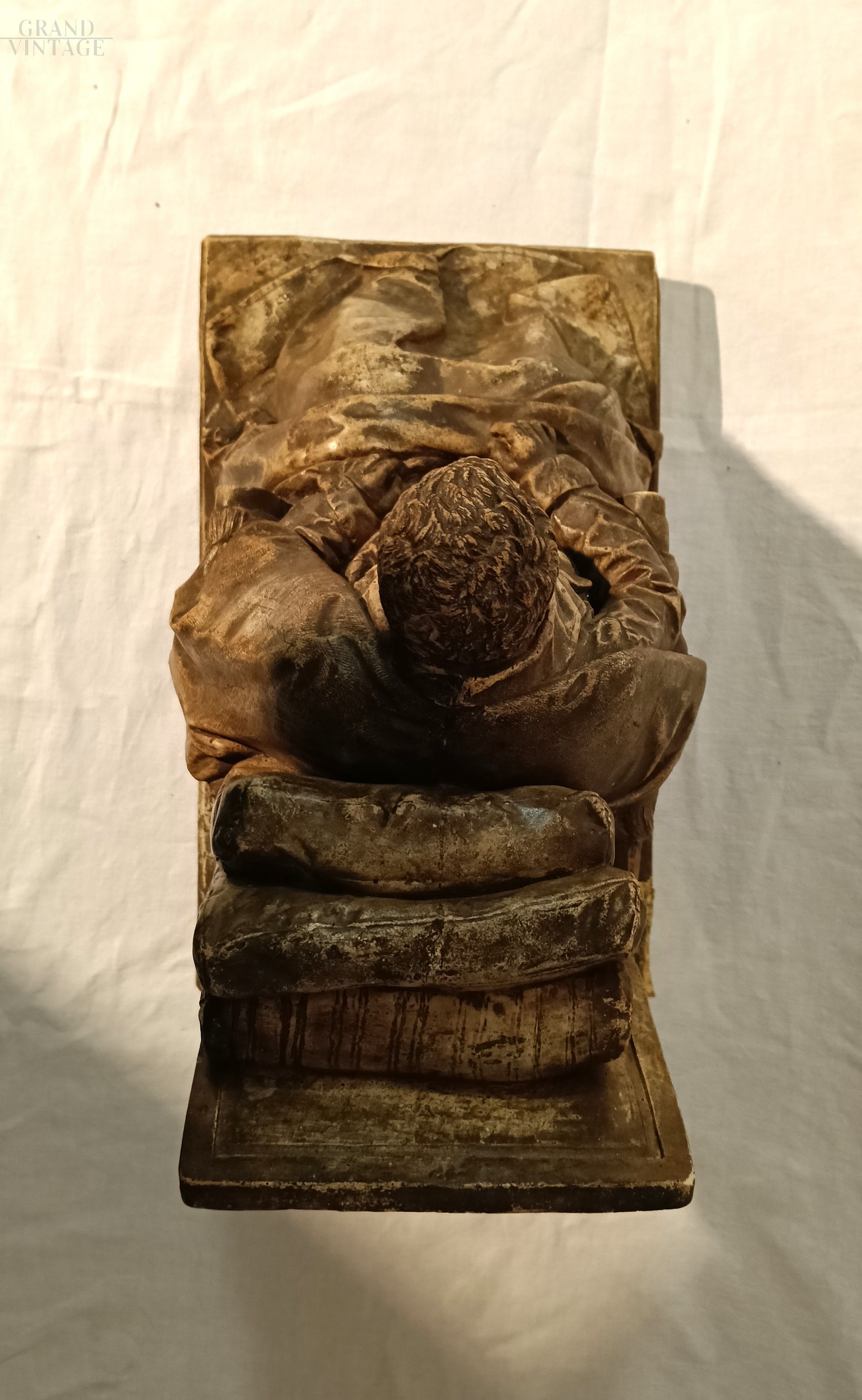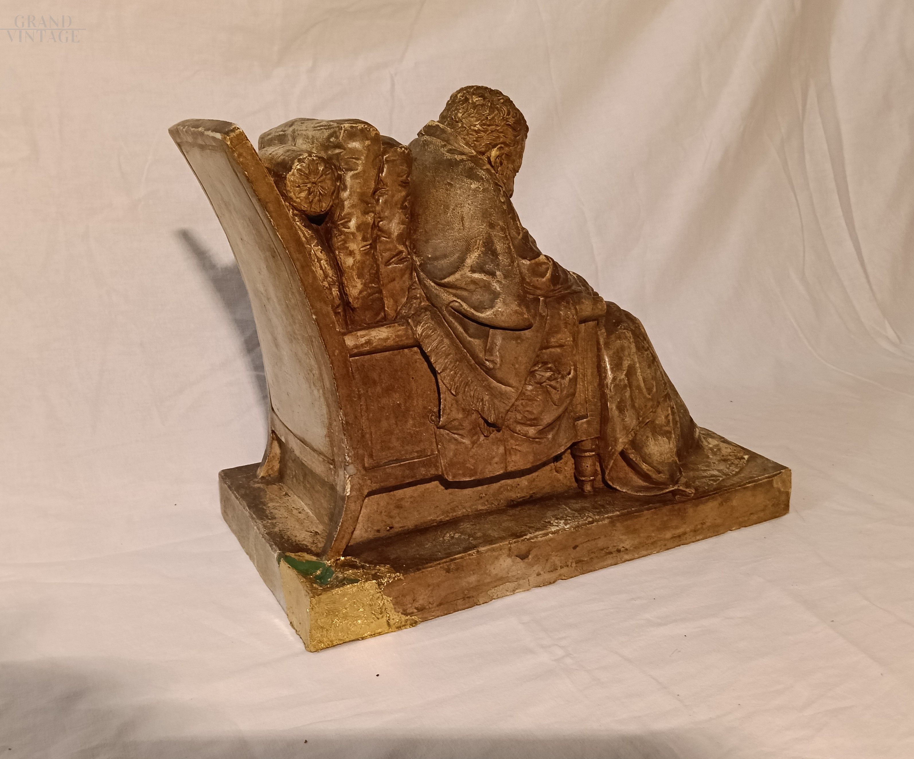 Sculptural reproduction in glazed stone and reinforced plaster, copy of the Seated Male Portrait of Vittorio Alfieri, created by Pompeo Marchesi (circa 1840). Signature on the base "Ariodante Botta di ce...". It has a repaired edge in gold leaf as shown in the photo. Very heavy sculpture.