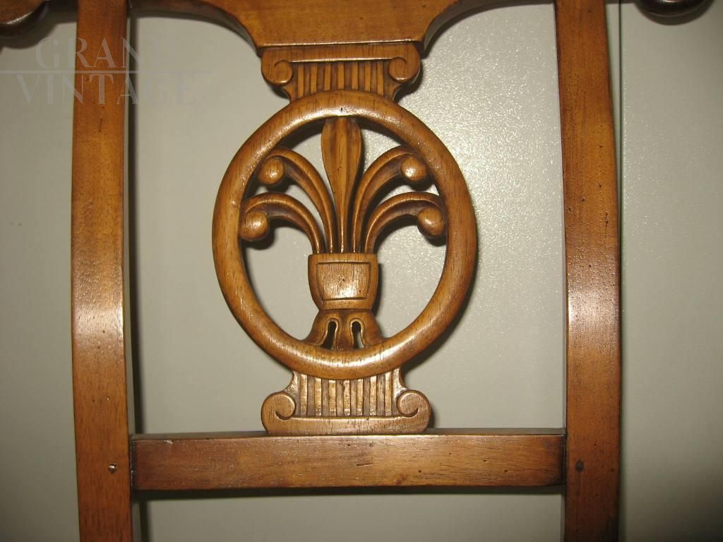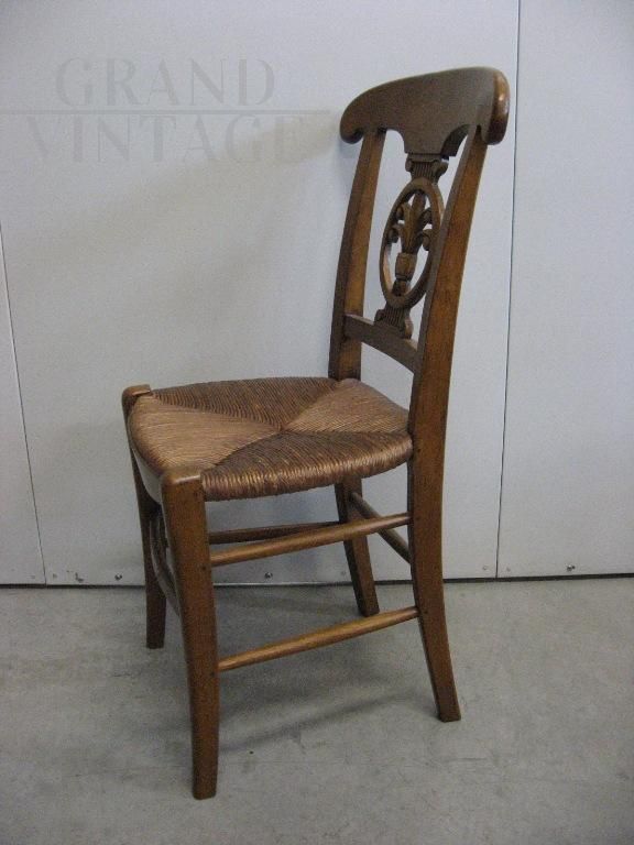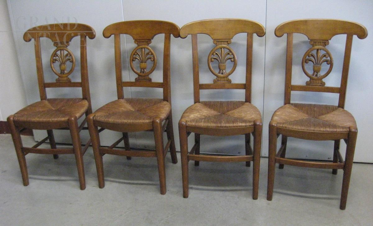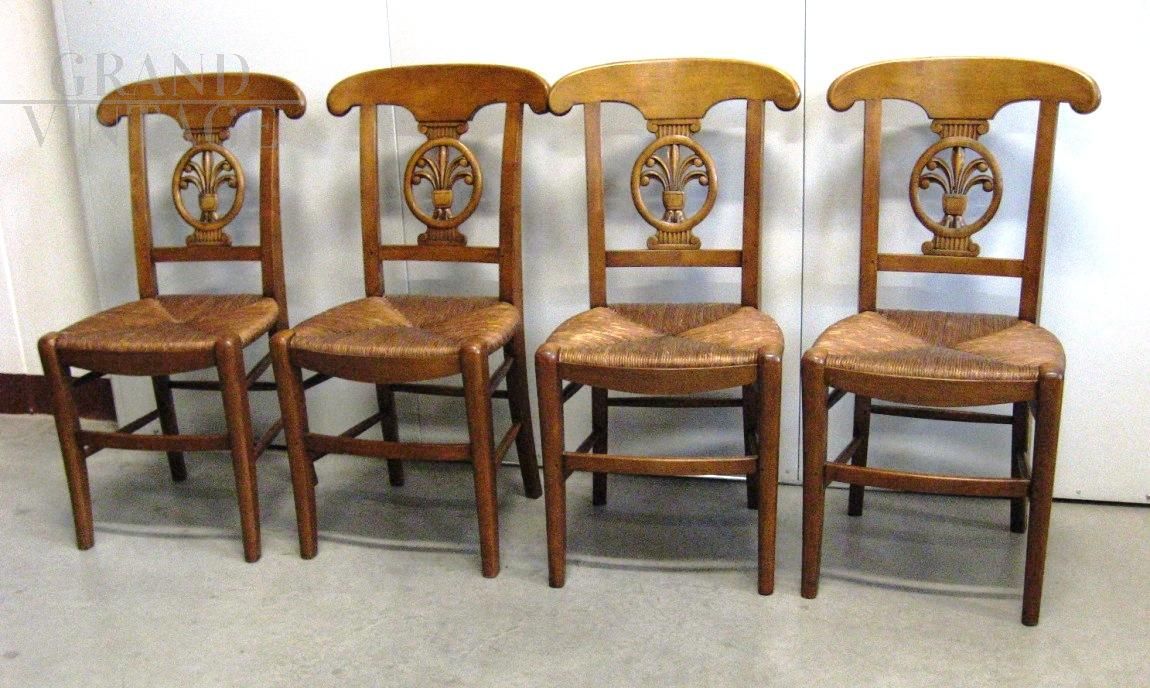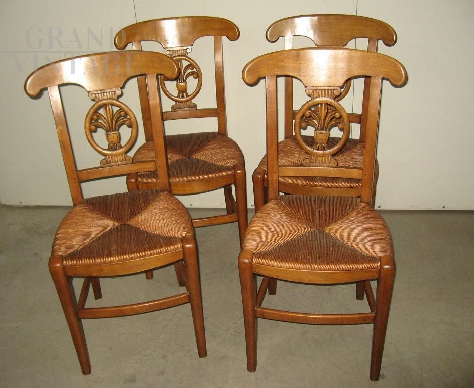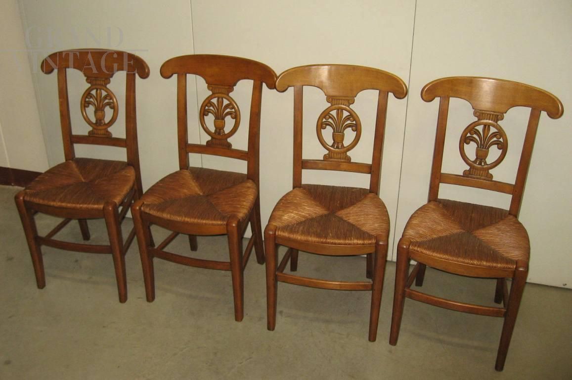Set of 4 vintage walnut chairs with straw seat, never used, beautiful back with carved decoration in the center. The chairs are in excellent condition, never used, coming from a former furniture exhibition.