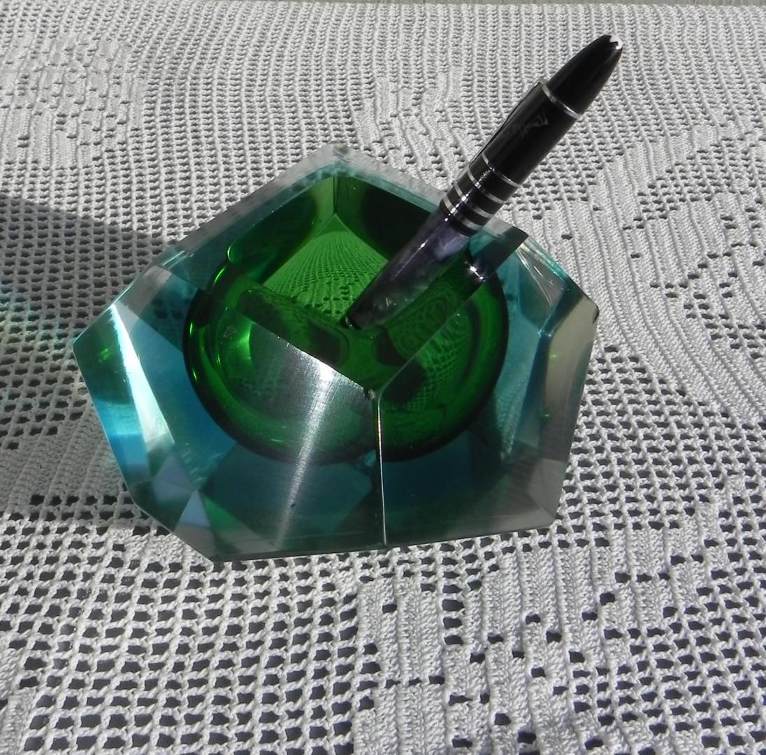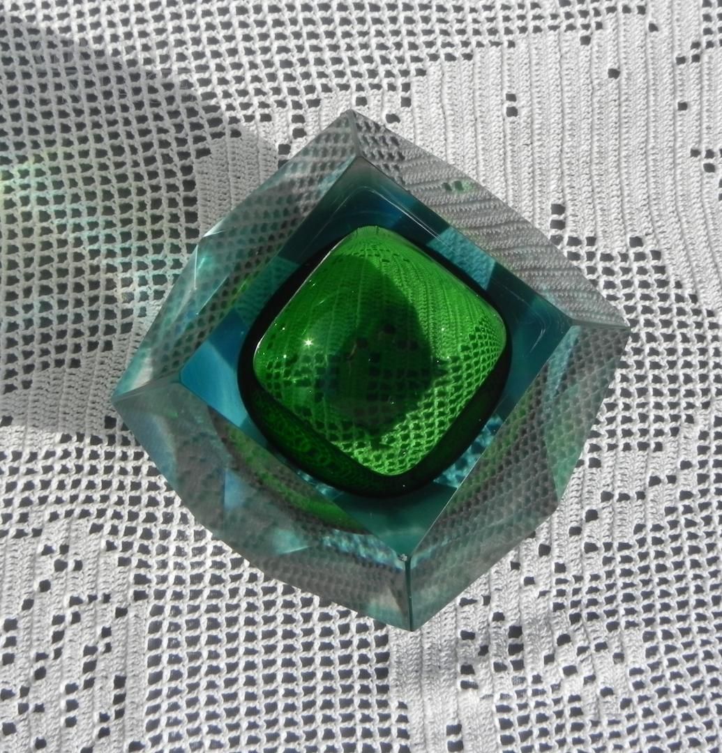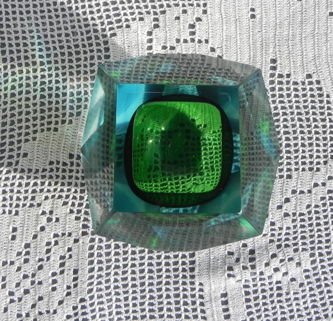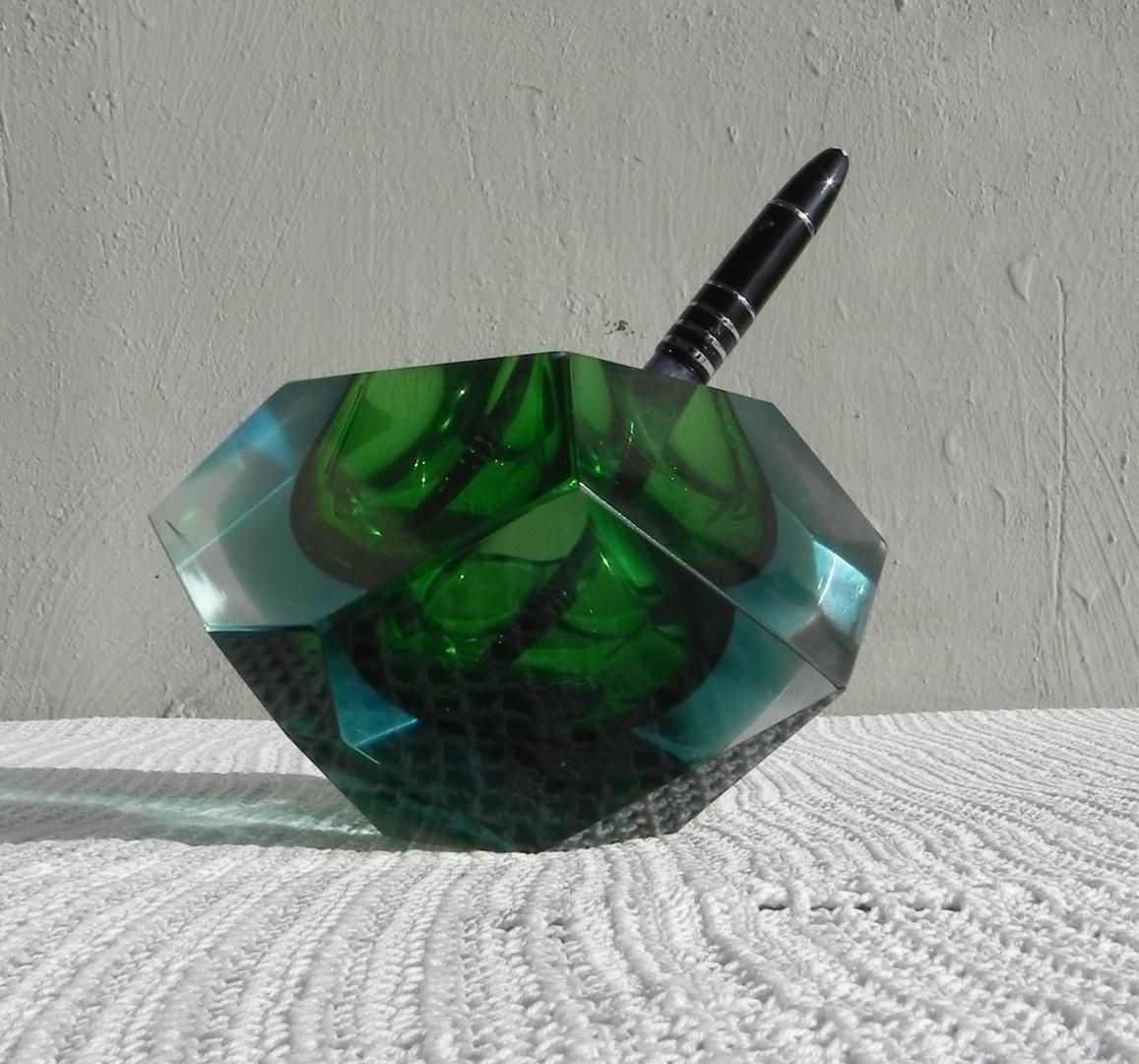 Pocket emptier bowl or ashtray designed by Flavio Poli for Seguso in faceted Murano glass with green and blue shades, depending on exposure to light, made in Italy in 1970s. The ashtray was made of solid melted glass, it is in good condition, it has some small defects on some edges, as shown in the photo.