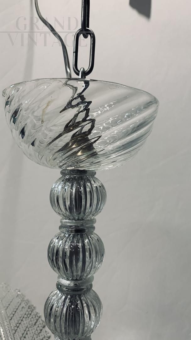 Beautiful chandelier with 3 lights attributable to the Seguso company, with fantastic handmade transparent glass with leaf and bell motifs, on an iron supporting structure and wooden base, original glass from around the 1950s. The entire chandelier is a work of art. In good condition, the glass is intact, but the final cup has the classic signs of aging which, thanks to the closing finish, are not very noticeable. The electrical system has been redone, with 3 light points with connections for E27 type bulbs, suitable for LED bulbs. The price of the object also includes the restoration carried out by competent and qualified personnel for over 40 years. Excellent piece for decorating different rooms, kitchen or even tables; It does not dazzle if you use milky white bulbs.