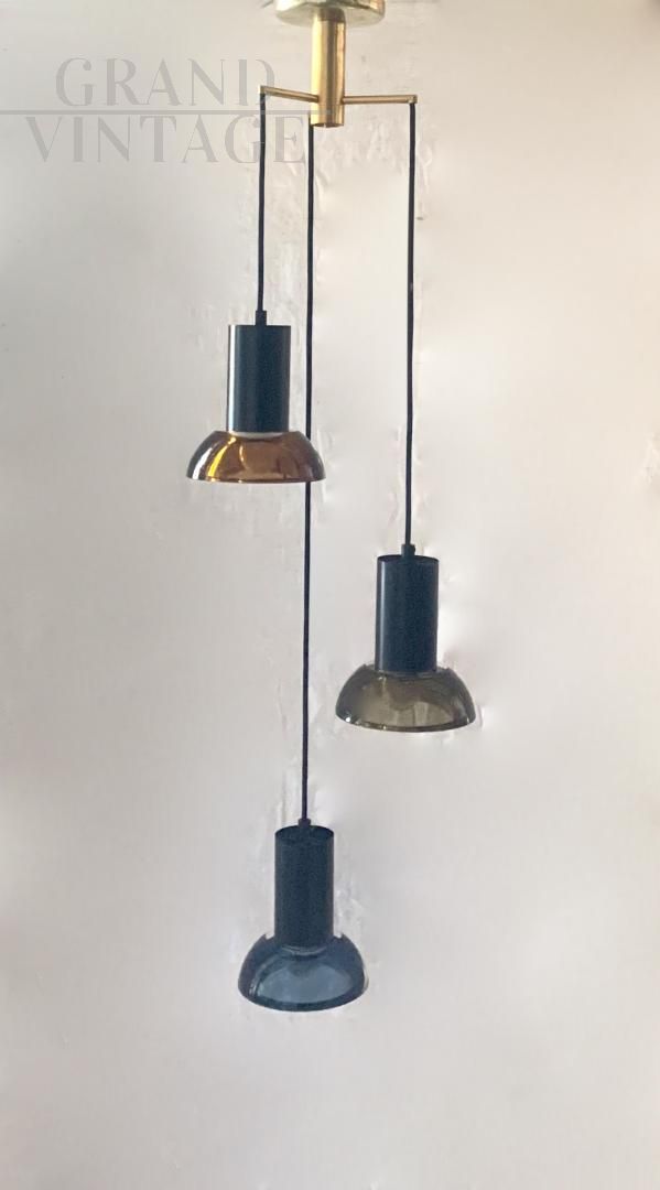 Seguso 50s chandelier with three submerged glass pendants in different colors, orange blue and green tending to yellow, on a brass structure. The 3 glass light points have an E14 bulb socket, while in the brass part there is an E27 bulb socket.