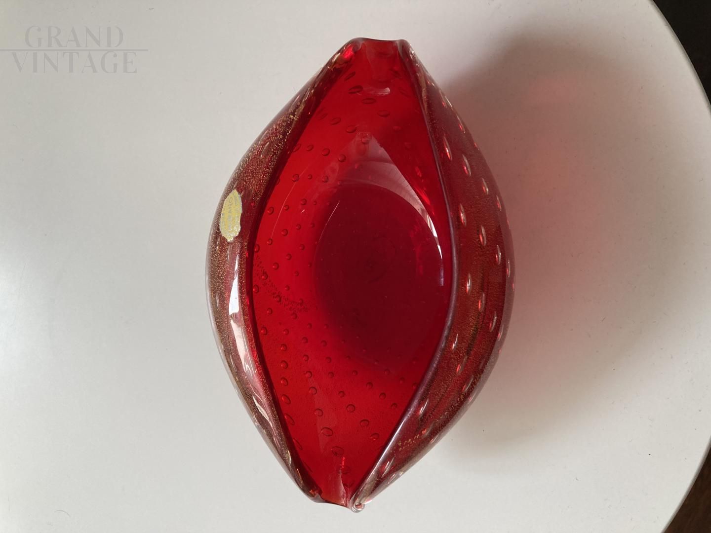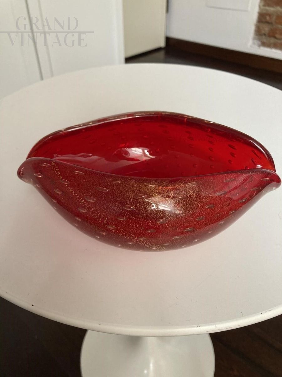 Elegant Seguso shell centerpiece bowl in hand-blown red Murano glass with decorations of golden pigments and bubbles.