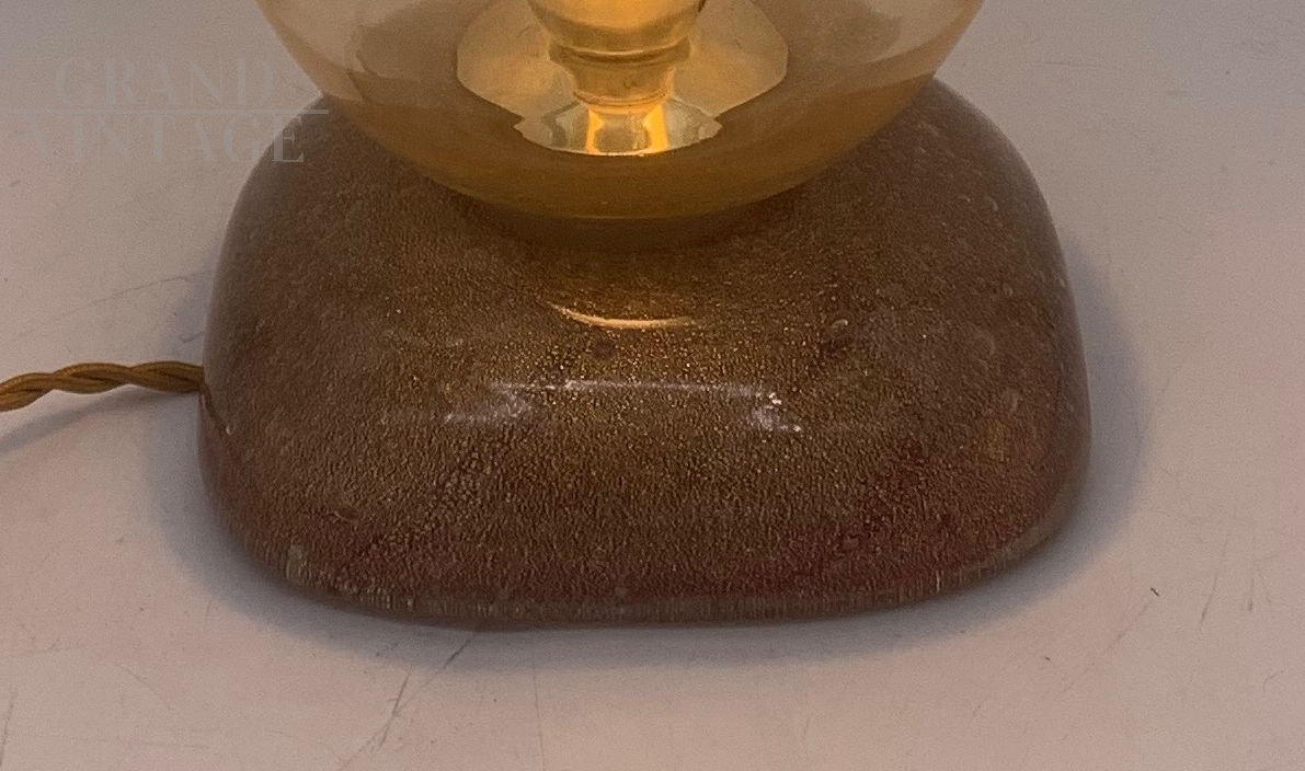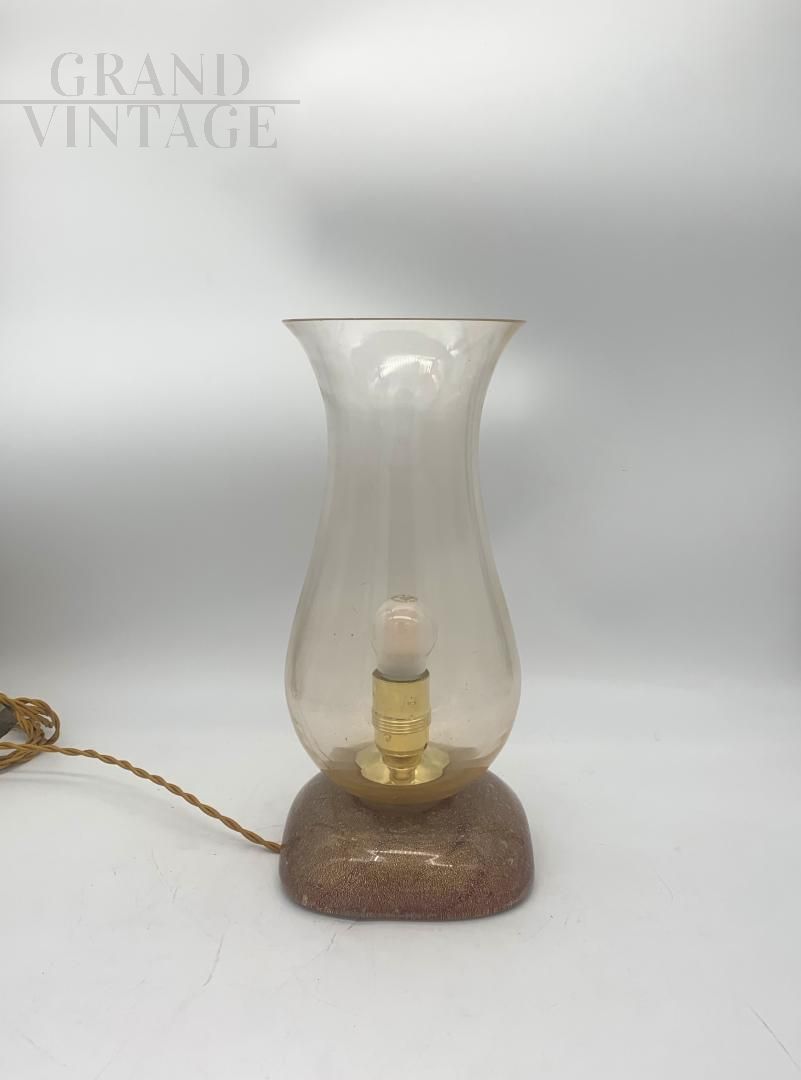 Table lamp attributable to Seguso in the shape of a vase in transparent Murano glass with gold with base in red Murano glass with gold. New electrical system with socket for E27 type bulb, suitable for LED bulbs. The lamp does not have a grommet, a hole for passing the electric wire, so it passes under the red base, for this reason the lamp wobbles minimally due to the minimum thickness of the braided wire, but this does not affect its stability.