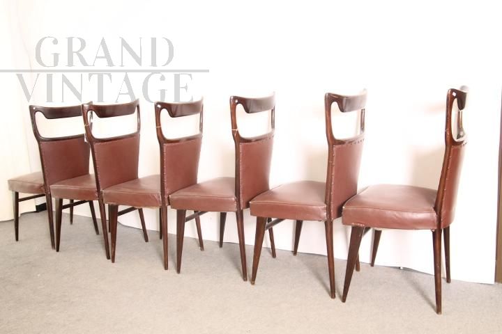 Six unique Vittorio Dassi 1950s chairs in wood and Skai