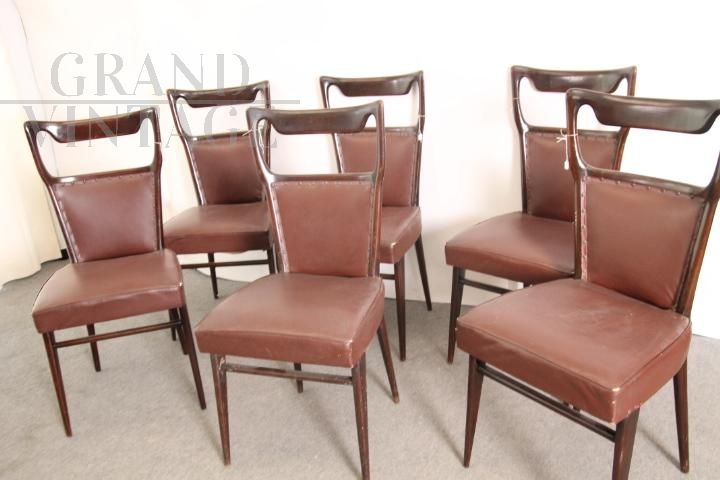 Group of six modern design chairs by the Italian mid-century designer Vittorio Dassi from the 1950s, in rosewood and upholstered in dark brown skai.