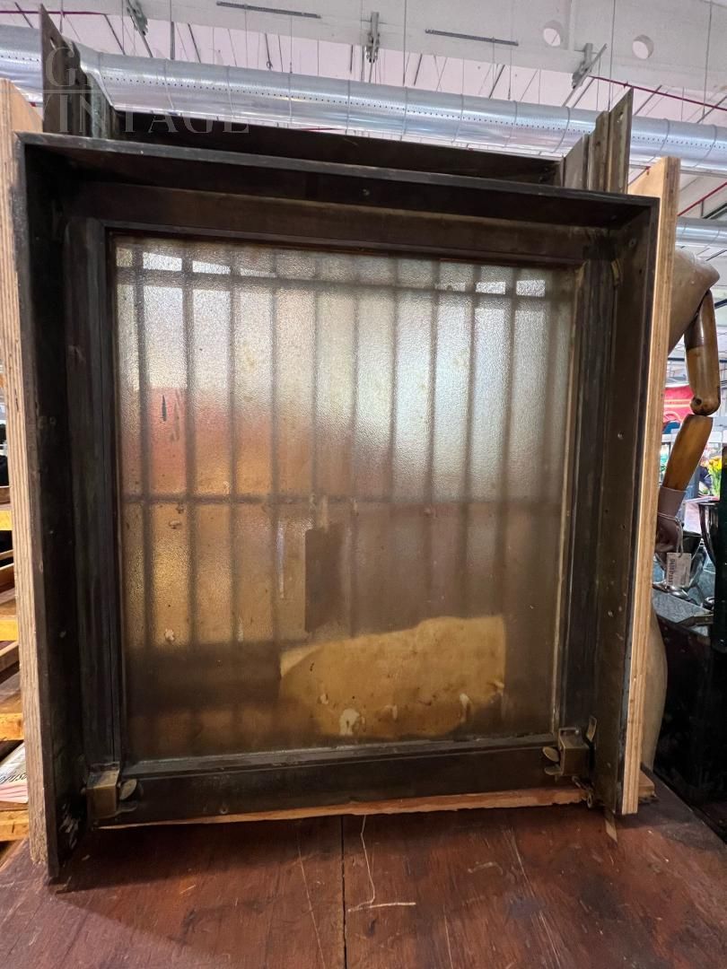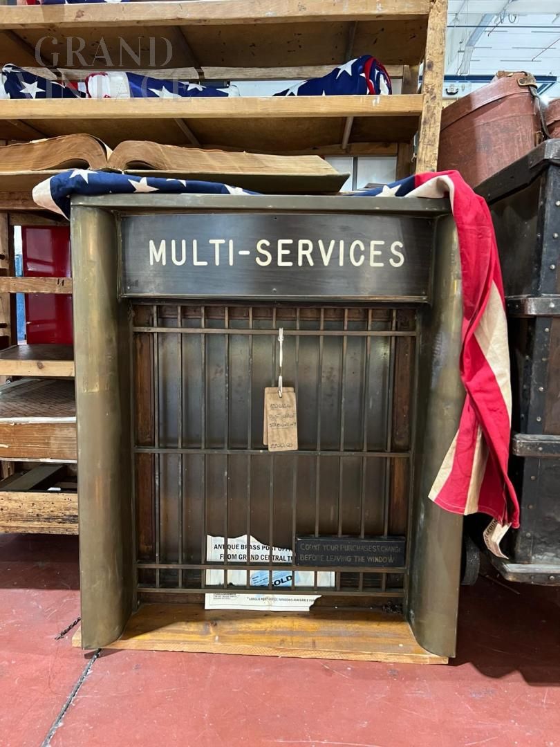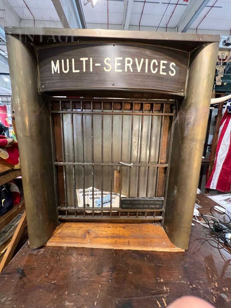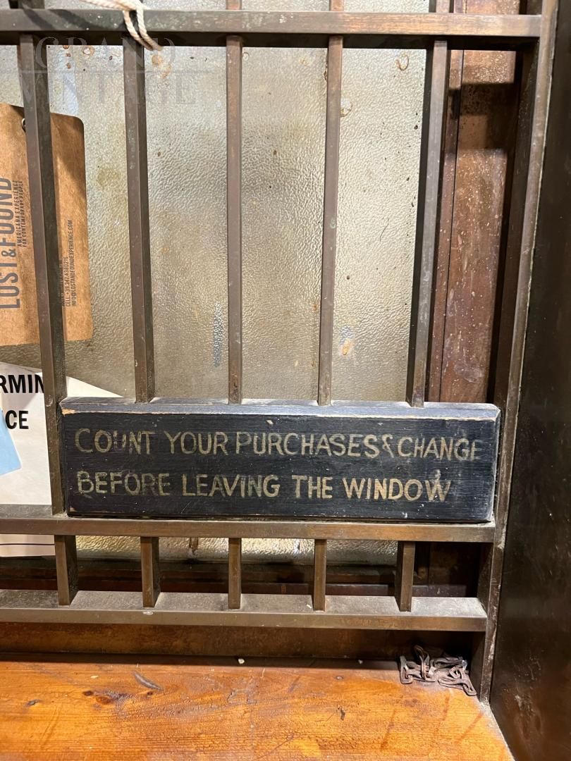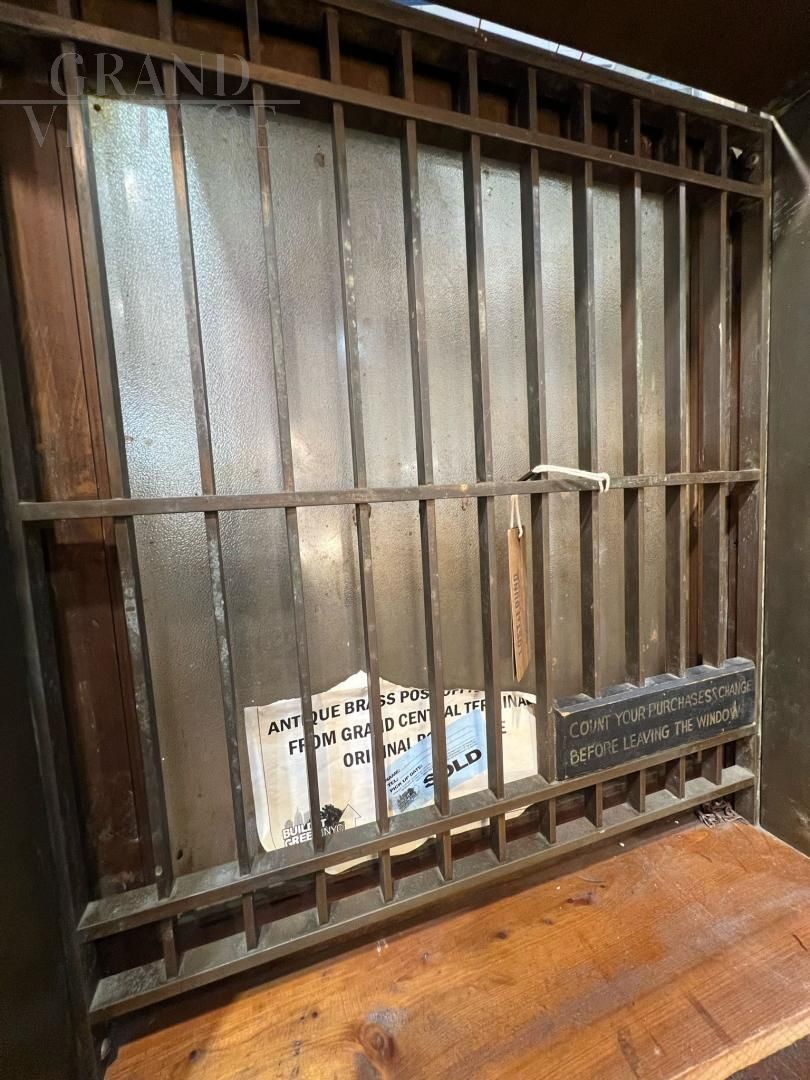 Old vintage ticket service window from New York Central Station - Grand Central Terminal. Made of brass and wood, it still has the plaque that reads "count your purchases and change before leaving the window". The object is original and well preserved in its patina.
