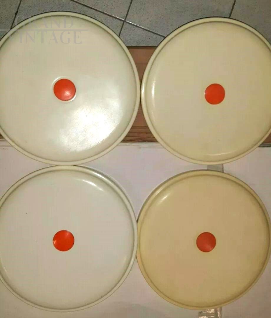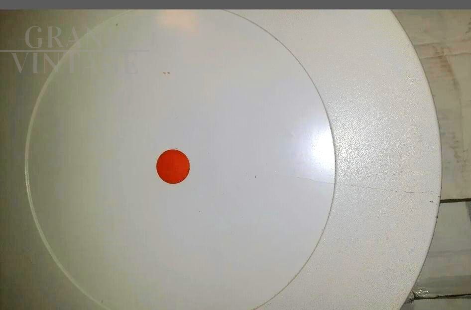 Beautiful and rare living room set with 4 round vintage stools and coffee table in orange and white abs plastic. Completely disassembling, in good condition, the set shows the natural signs of aging, to report a small crack on the surface of little importance, visible in the photos.