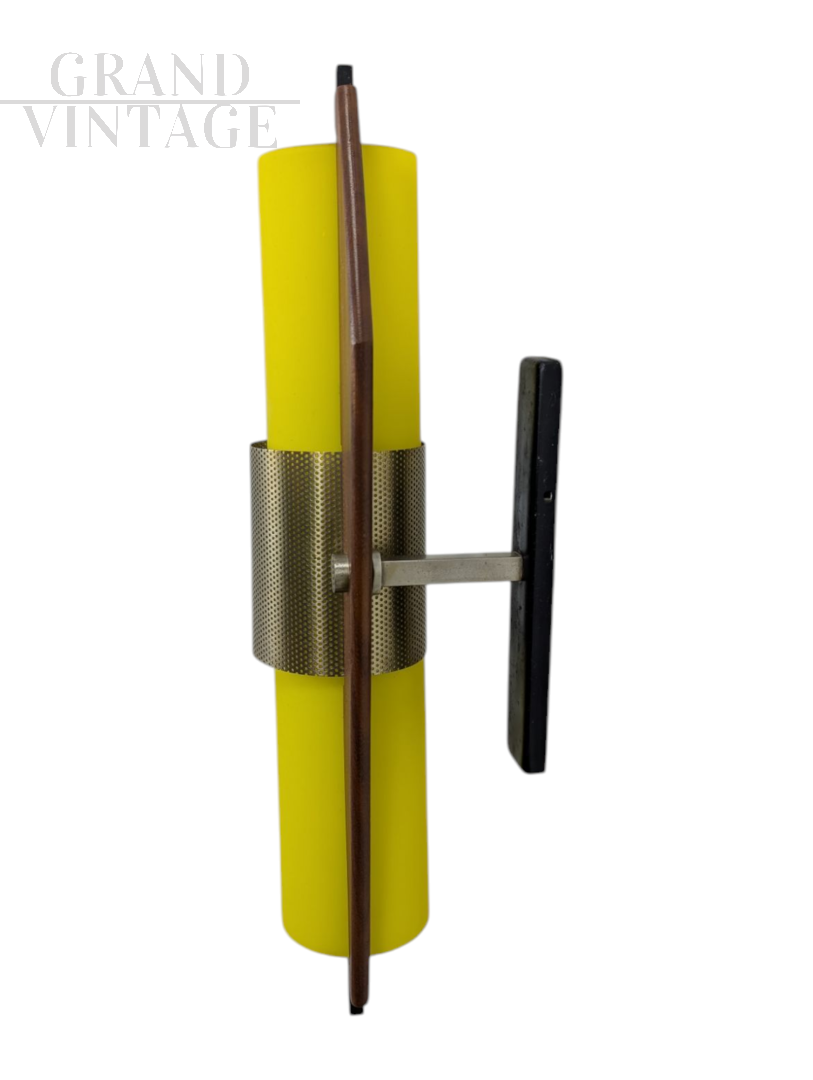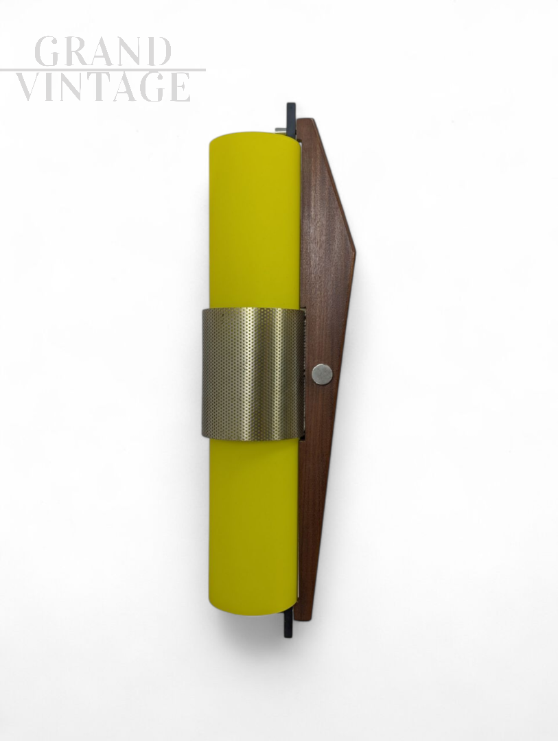 Set di 5 applique di Oma Padova in vetro satinato giallo con sezione geometrica in legno, modernariato italiano anni '60 - '70. Le lampade sono tutte in ottimo stato di conservazione, ogni singola applique ospita due lampadine con attacco E14.