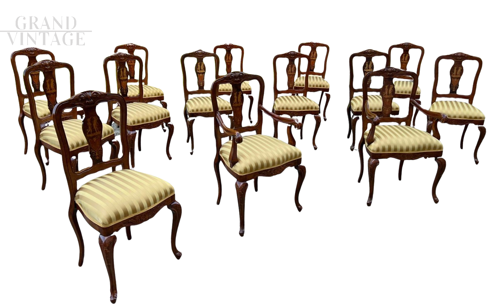 Set of 12 chairs + 2 head chairs in Palladian style inlaid with allegorical cherubs