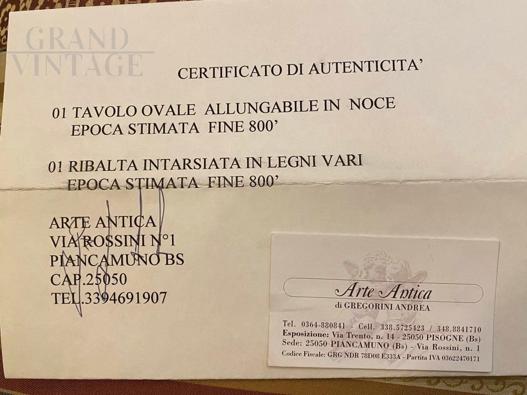 Late 19th century lounge set with extendable oval table with inlays + 4 chairs.The table has inlays on the top with a compass rose motif. The set is in excellent condition and comes with a certificate of authenticity.