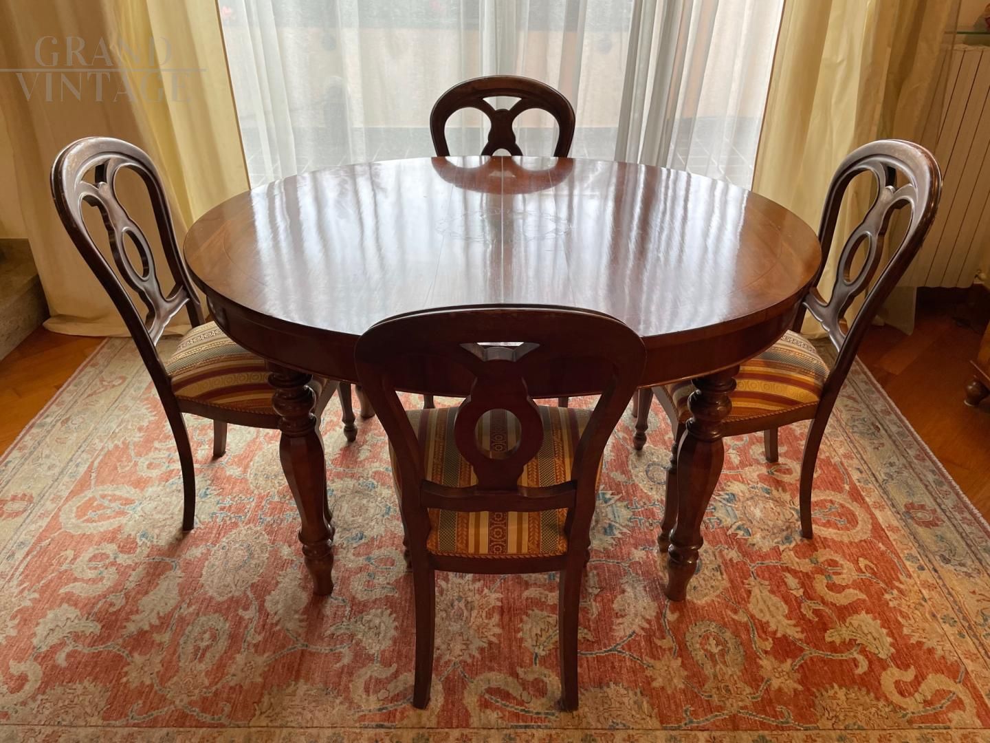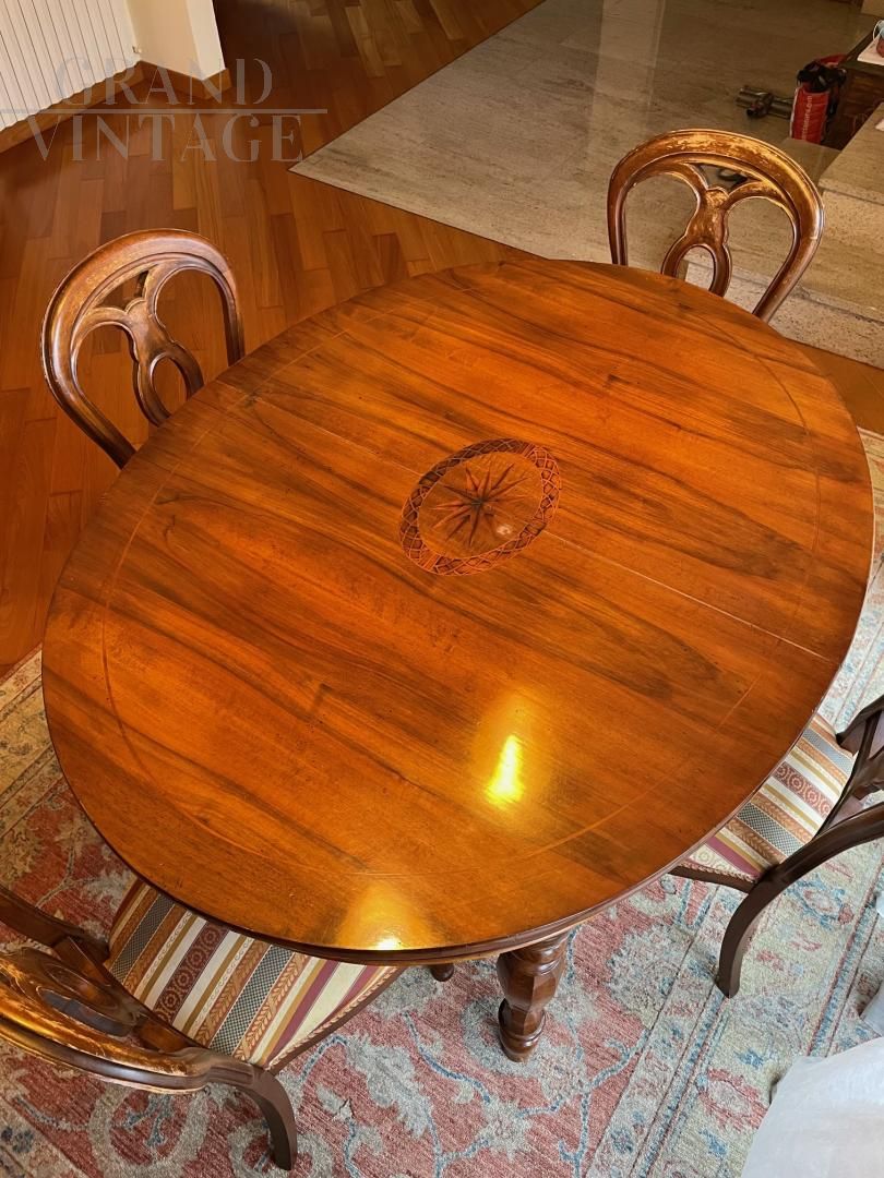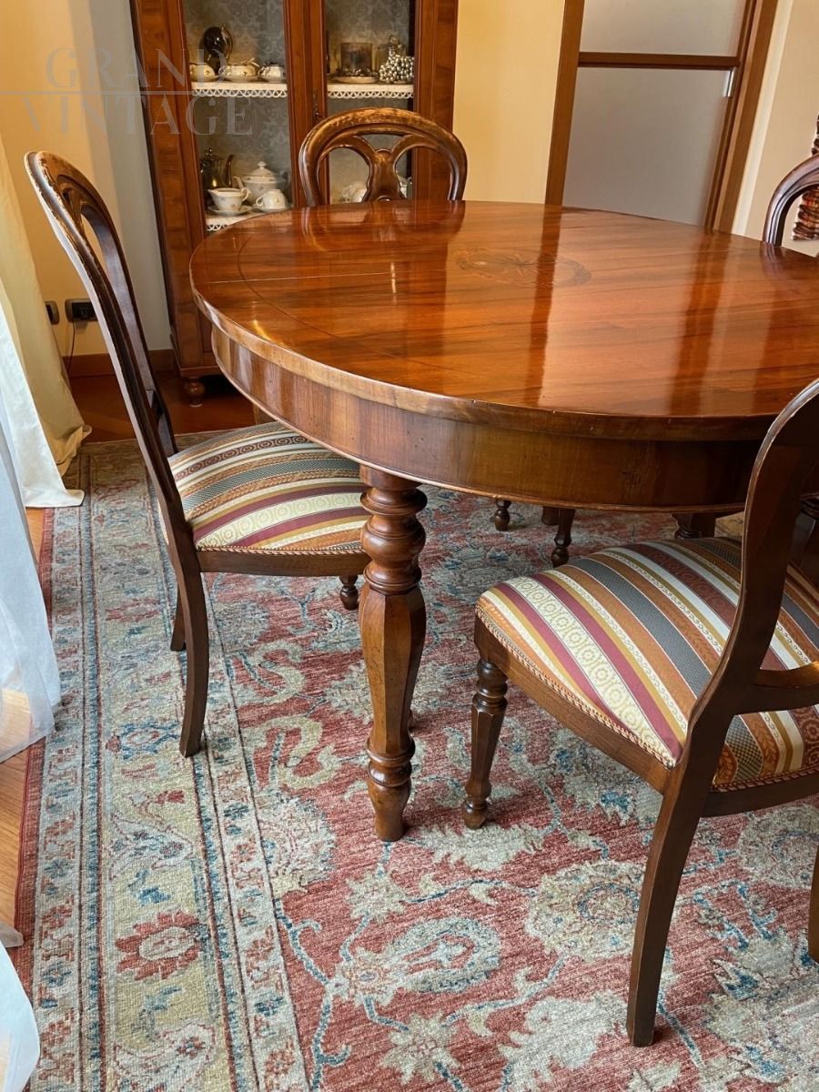 Set of 19th century extendable oval table with inlays + 4 chairs
