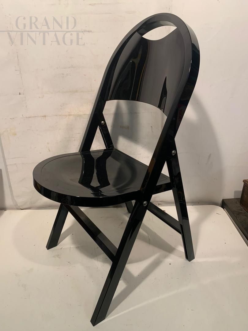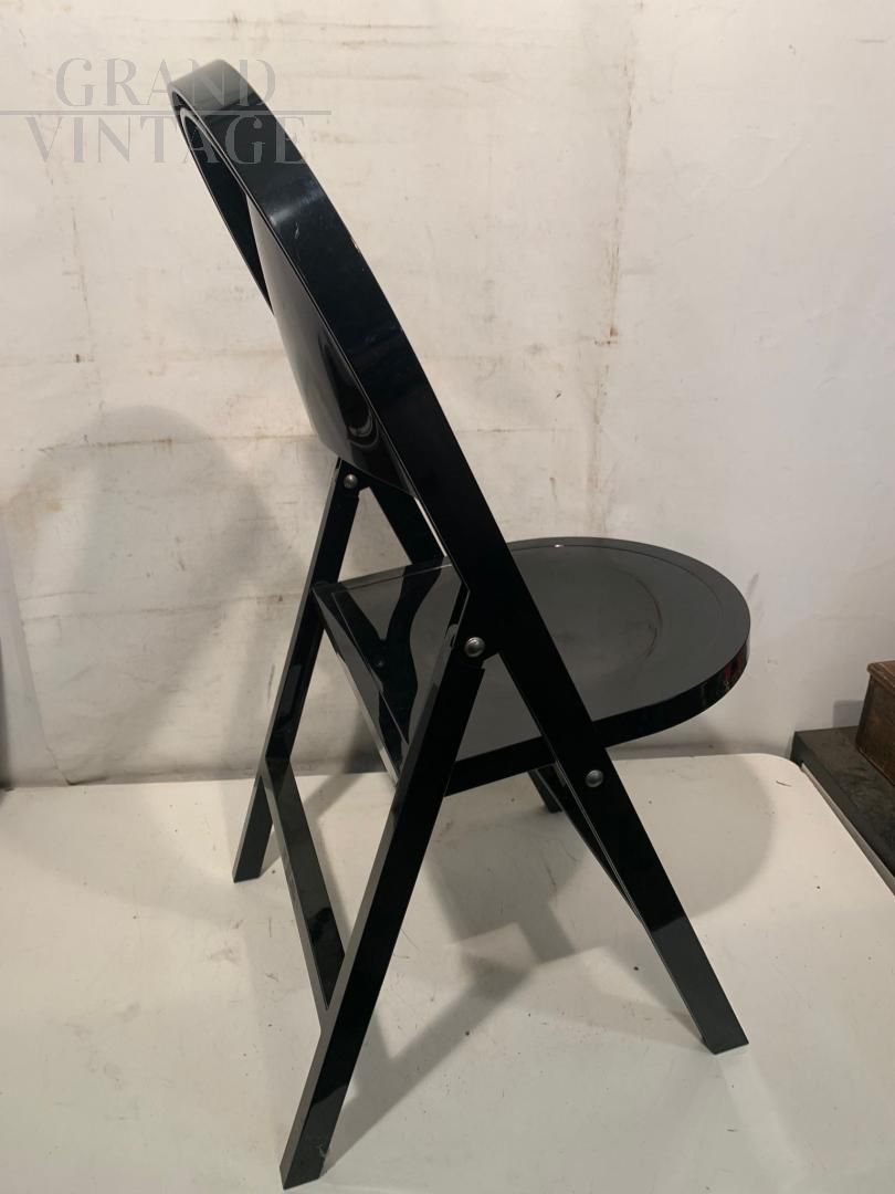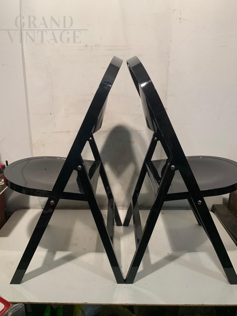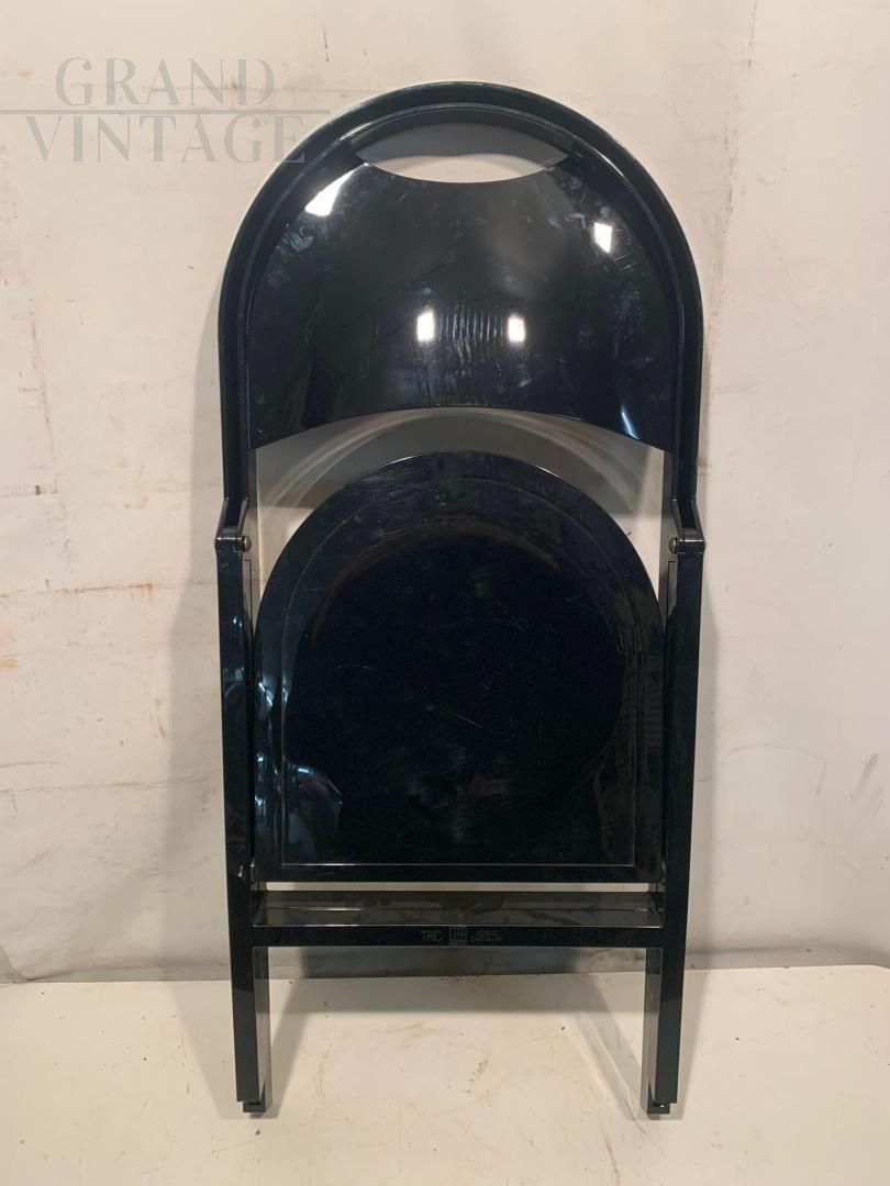 Block of 28 folding chairs model Tric by Achille and Pier Giacomo Castiglioni for BBB Emmebonacina with glossy black plastic resin structure. Perfect and with their original cardboard containing 2 pieces each (these are in fact warehouse funds, impossible to find in this perfect state). A shining example of functional design, Tric is part chair and part armchair. Tric was created for the home but is also perfect for any environment.