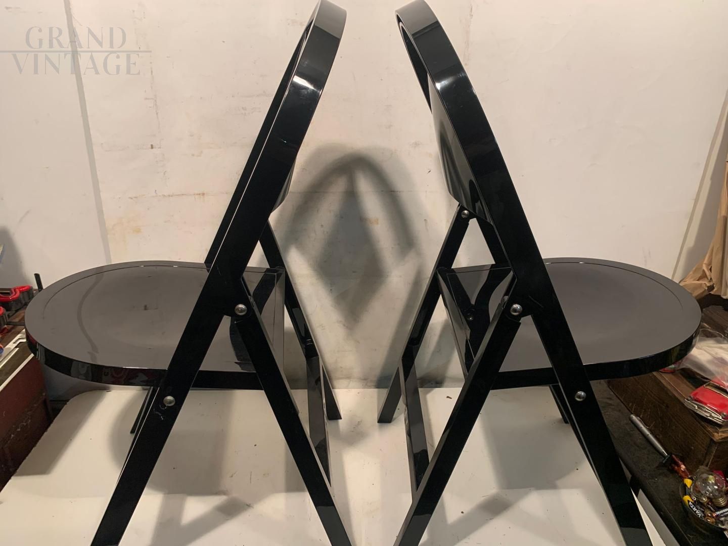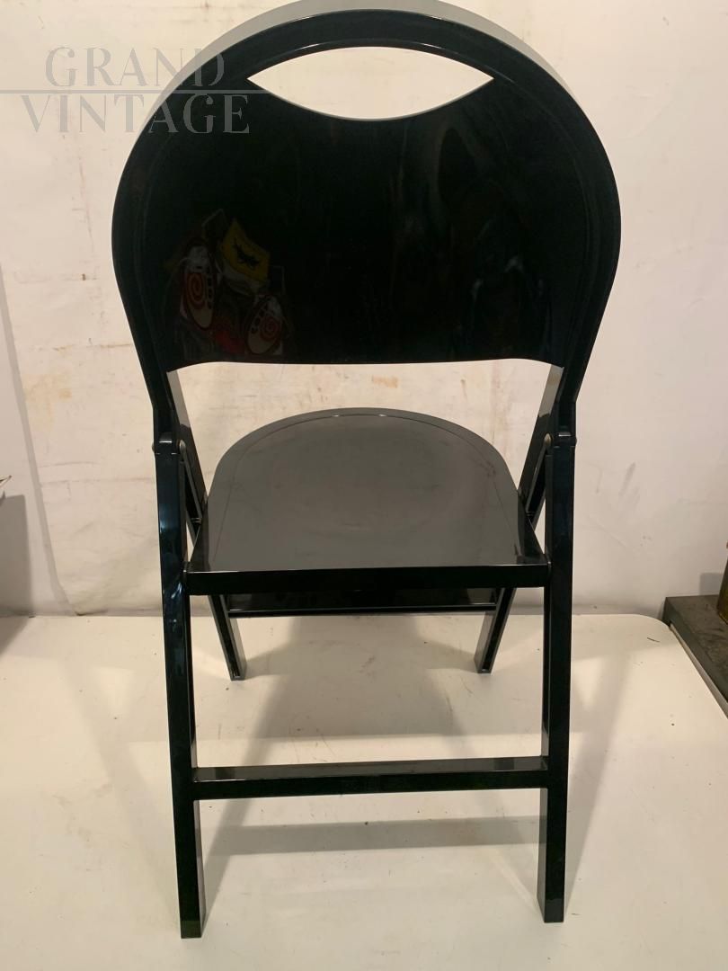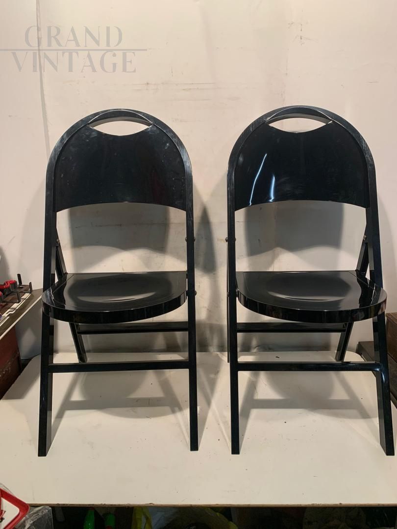 Block of 28 folding chairs model Tric by Achille and Pier Giacomo Castiglioni for BBB Emmebonacina with glossy black plastic resin structure. Perfect and with their original cardboard containing 2 pieces each (these are in fact warehouse funds, impossible to find in this perfect state). A shining example of functional design, Tric is part chair and part armchair. Tric was created for the home but is also perfect for any environment.