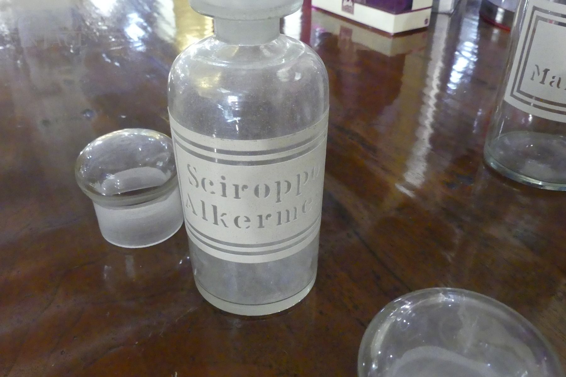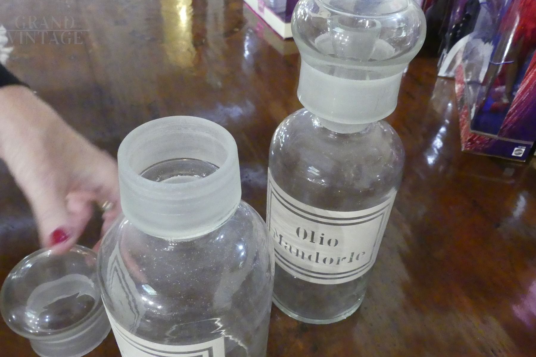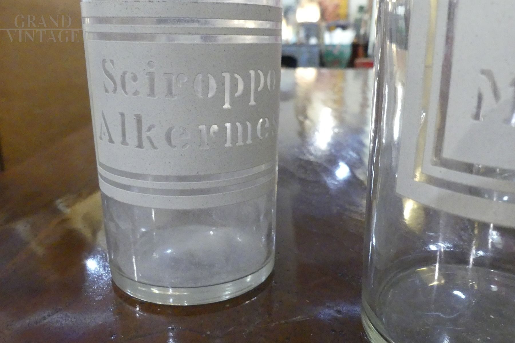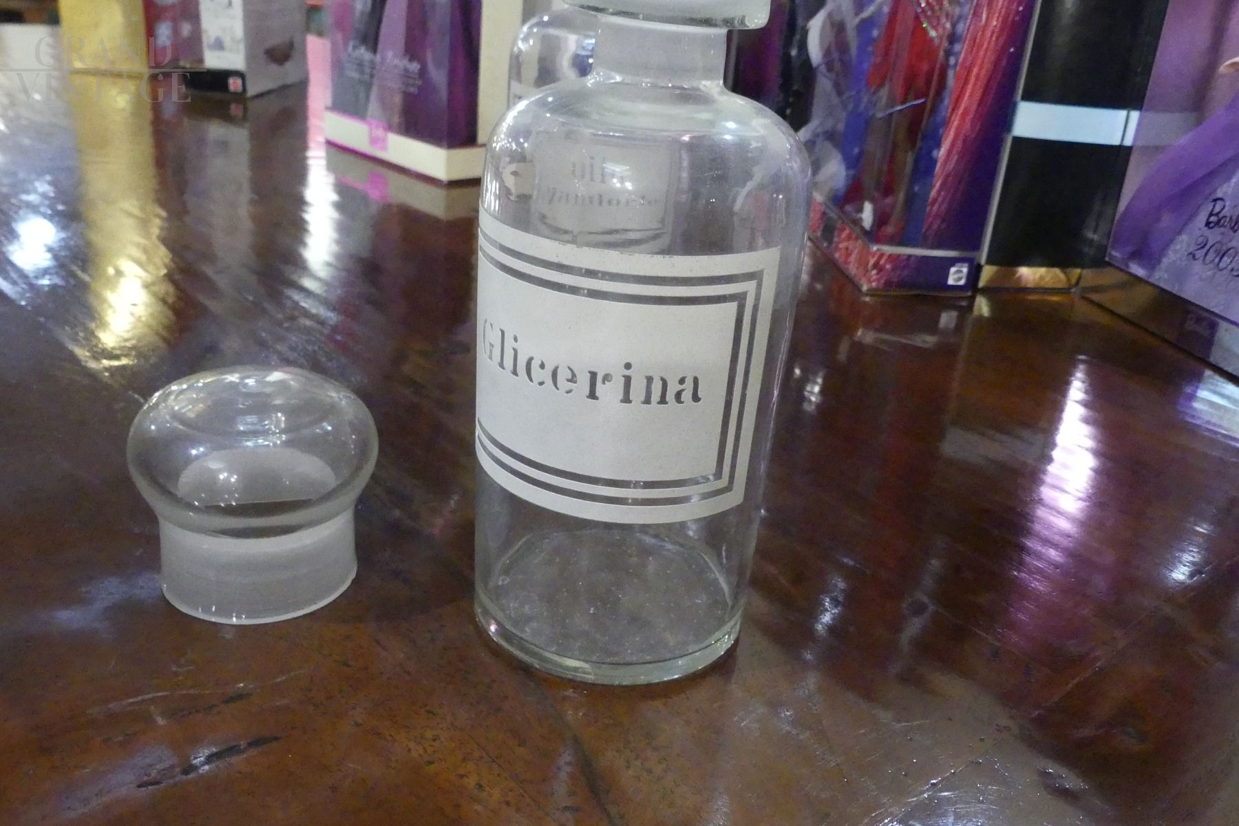 Set of 3 glass pharmacy bottles with glass caps, silk-screened glass glasses inserted into the cap, and labels indicating the contents: almond oil, glycerin and alkermes syrup. Italy, circa 1850, in excellent condition.