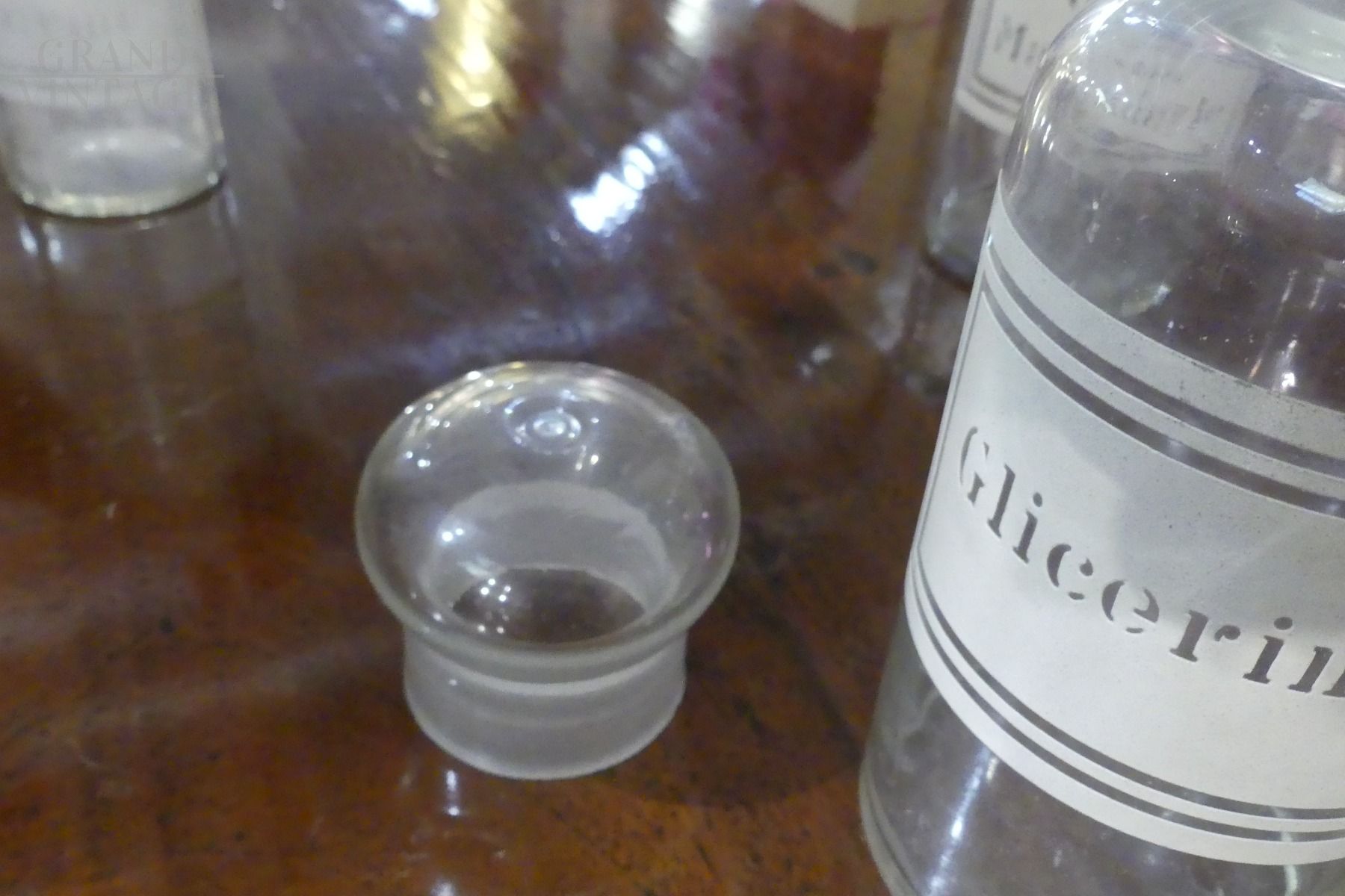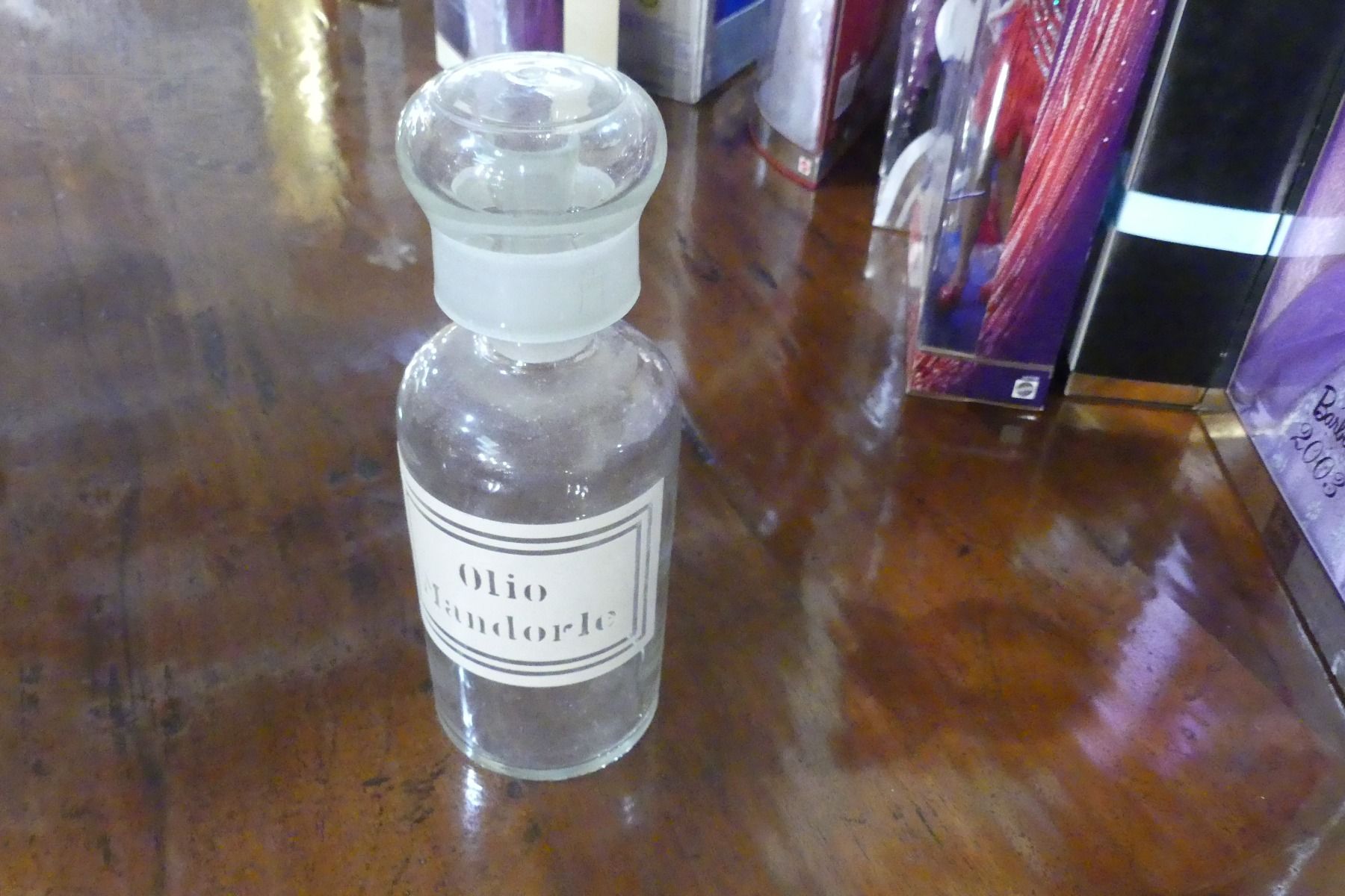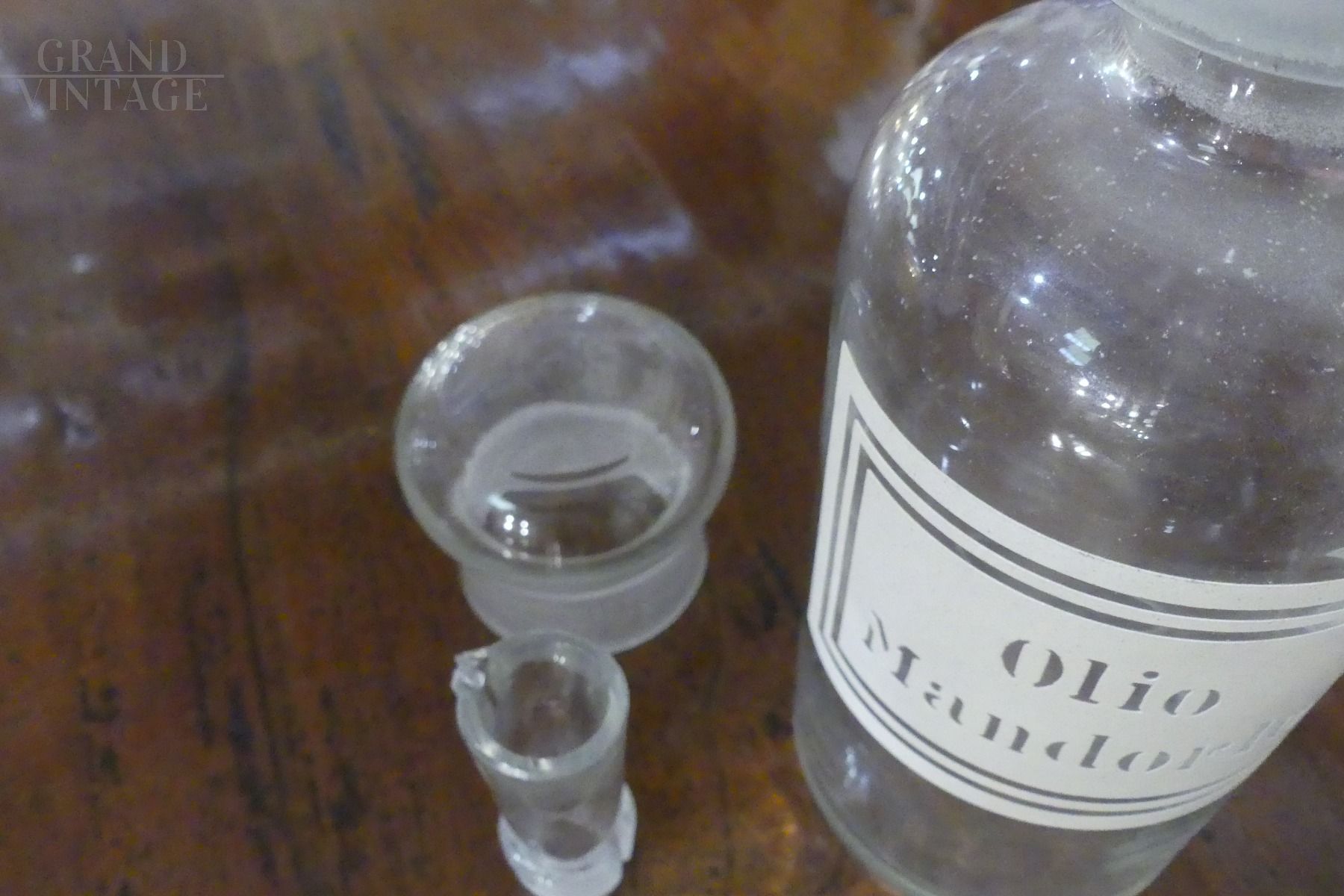 Set of 3 glass pharmacy bottles with glass caps, silk-screened glass glasses inserted into the cap, and labels indicating the contents: almond oil, glycerin and alkermes syrup. Italy, circa 1850, in excellent condition.