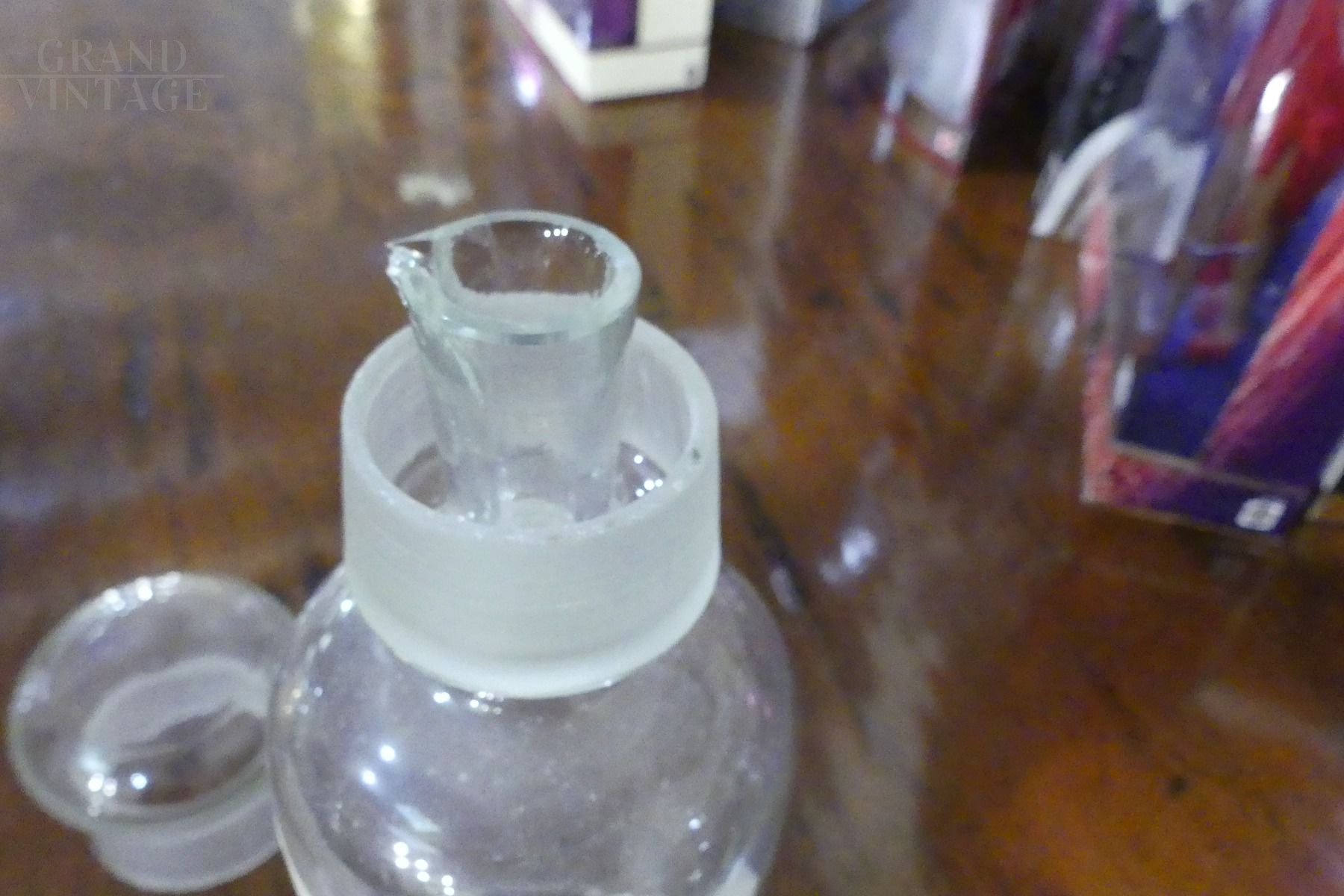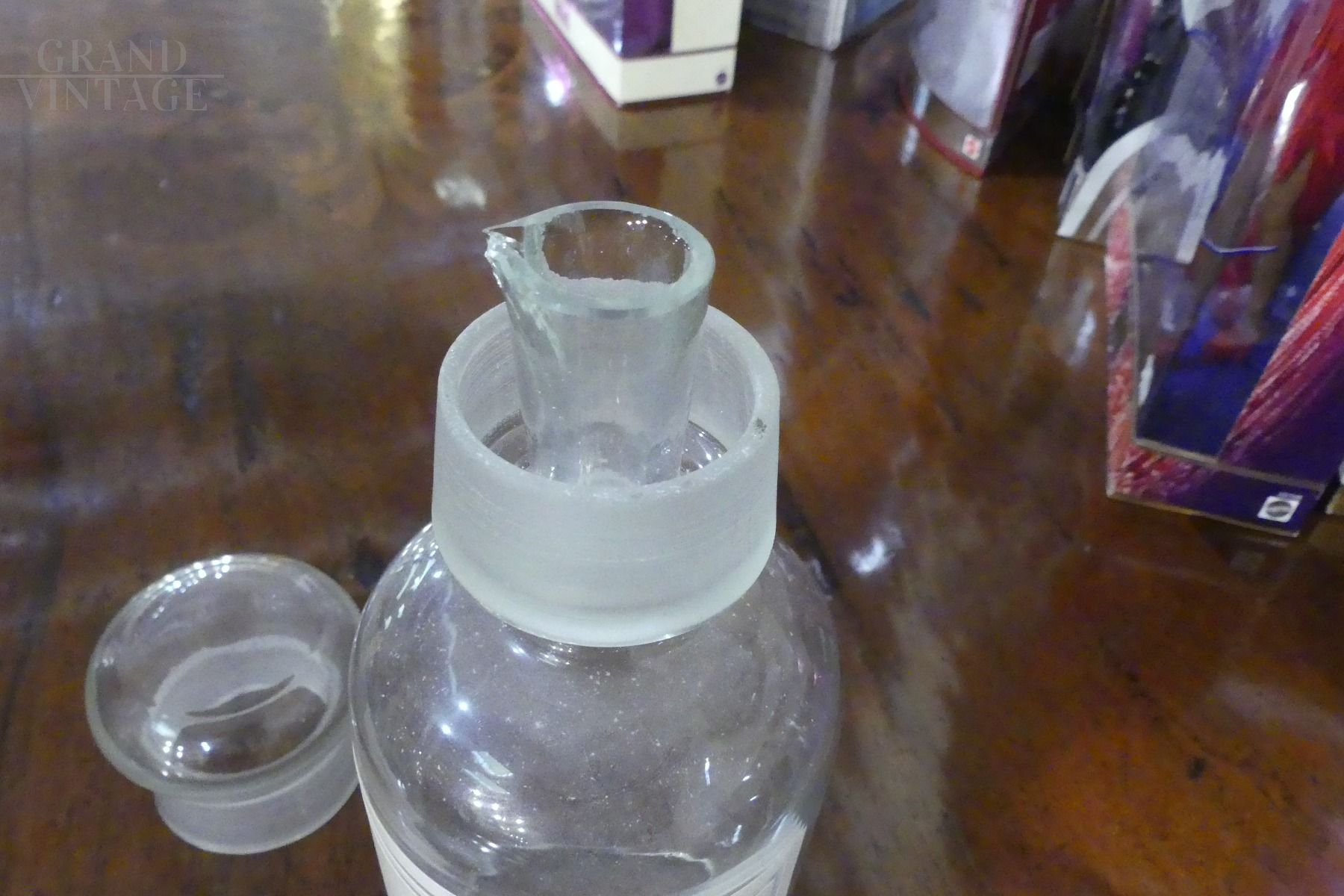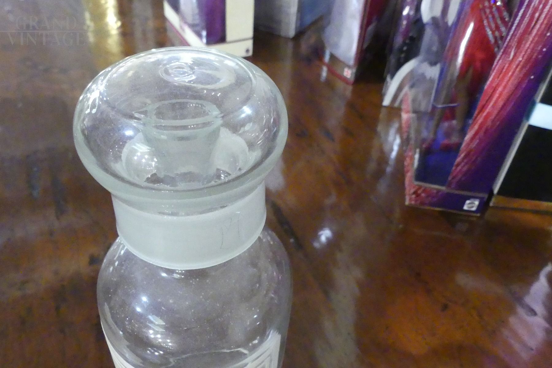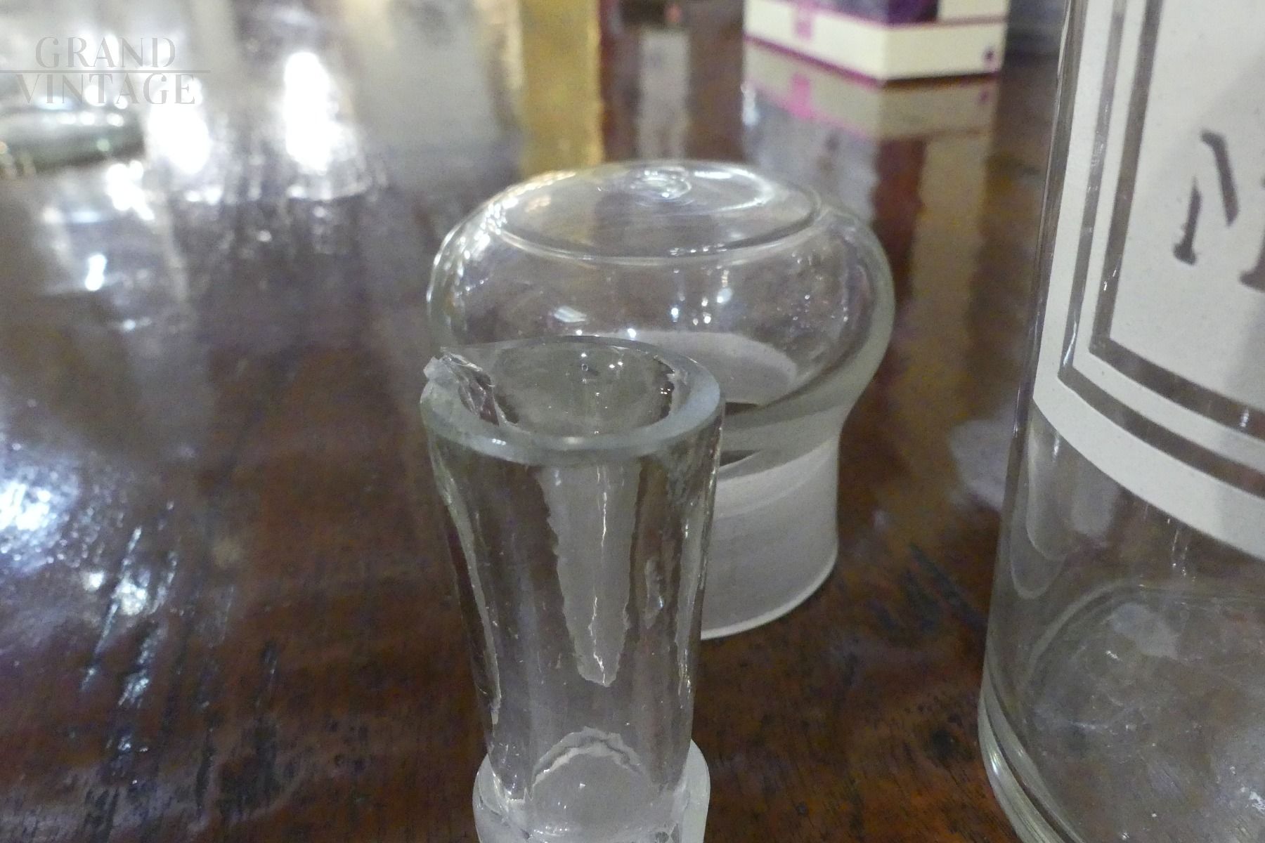 Set of 3 glass pharmacy bottles with glass caps, silk-screened glass glasses inserted into the cap, and labels indicating the contents: almond oil, glycerin and alkermes syrup. Italy, circa 1850, in excellent condition.