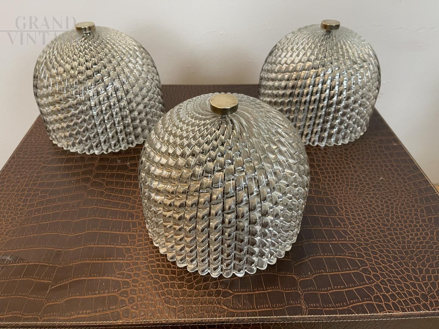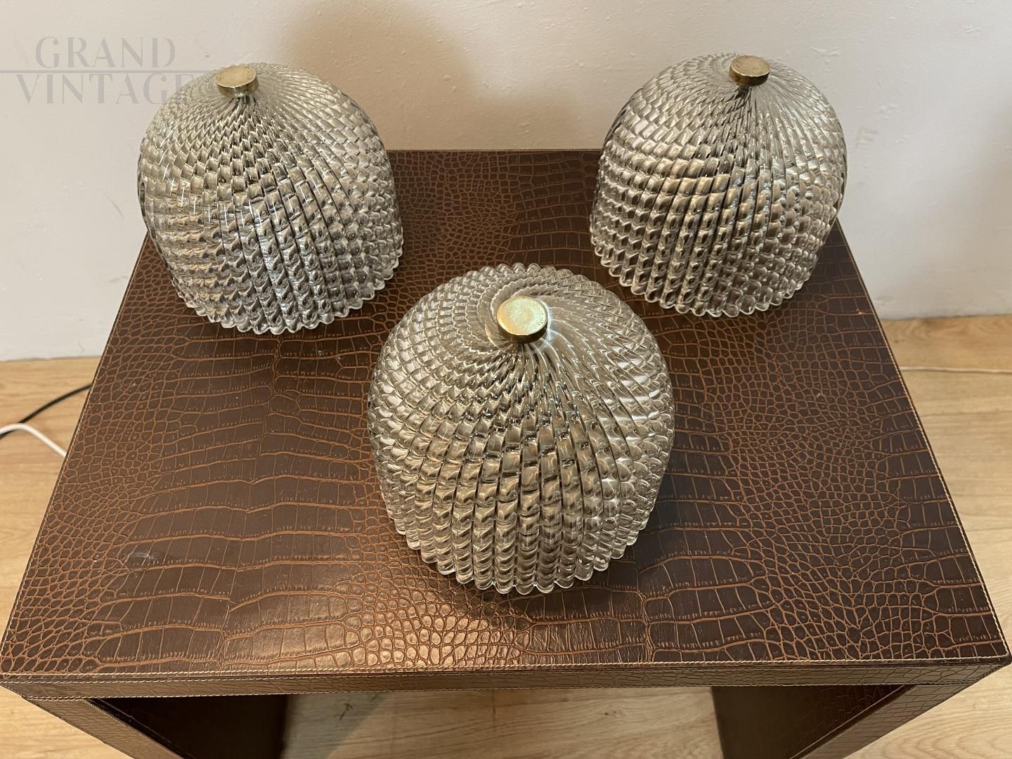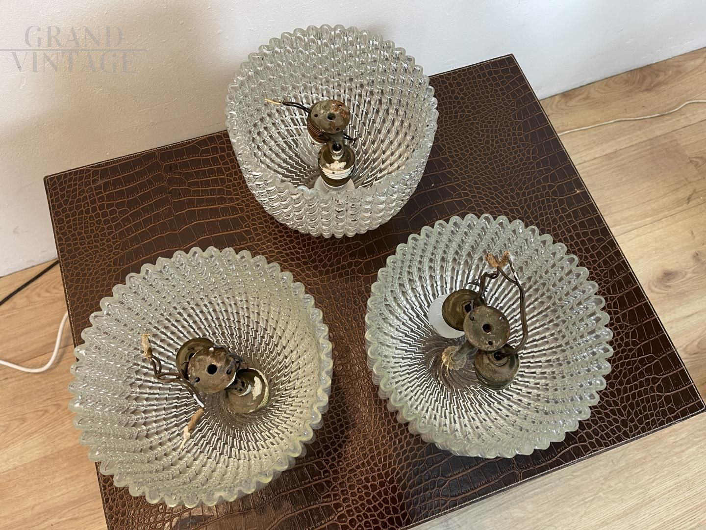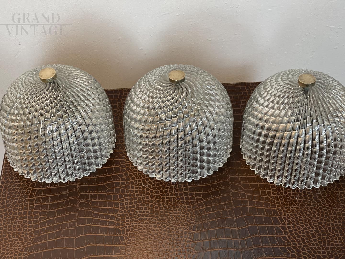 Set of 3 ceiling lights in Murano glass and brass with 2 bulbs each, in perfect condition. The ceiling lights are attributable to the Barovier company for style and construction quality.
