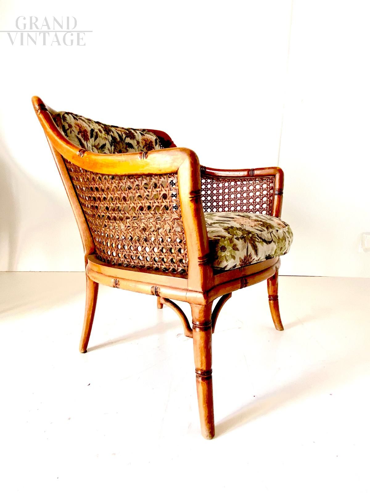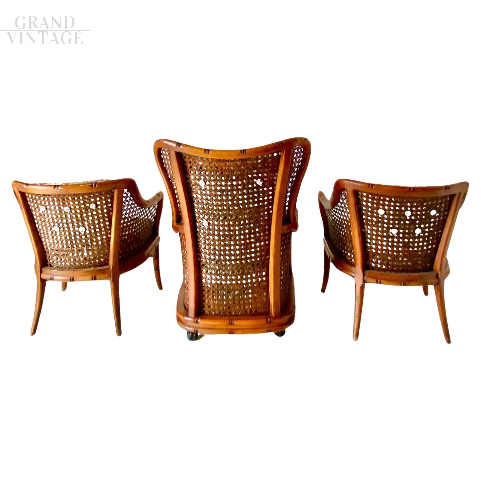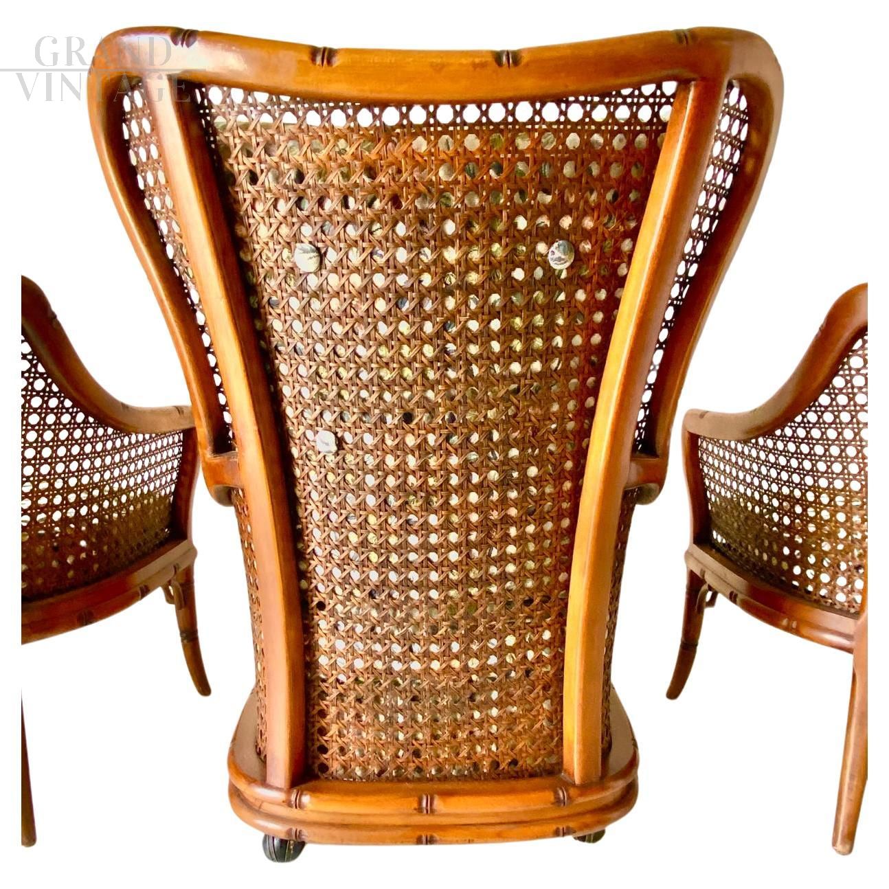 Set of 3 Giorgetti design armchairs in faux bamboo and wicker, Italy 1970s