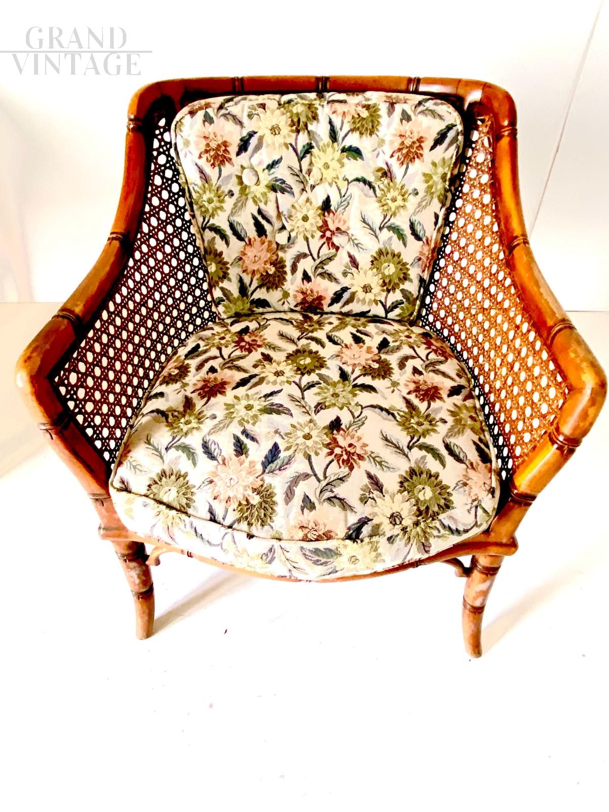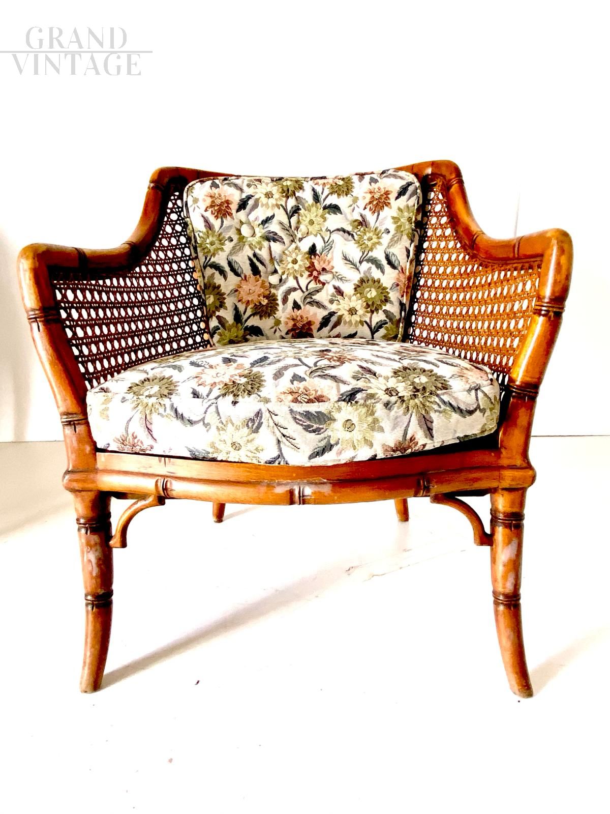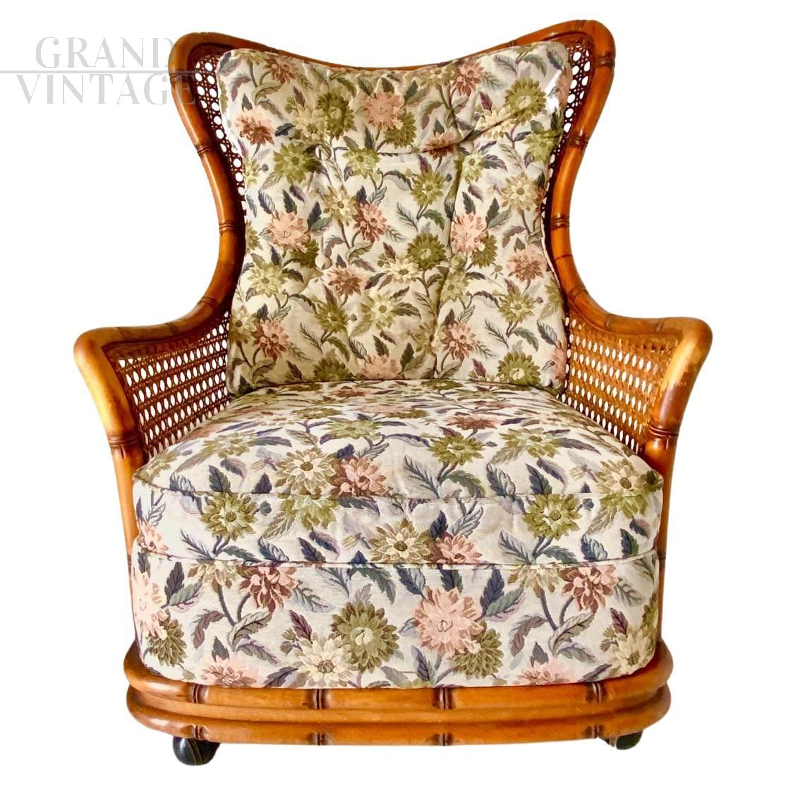 Lounge set consisting of a large armchair and two small armchairs with floral fabric seats, produced by Giorgetti in the 1970s. Structure made of faux bamboo and rattan. Large armchair equipped with casters. In very good condition with beautiful signs of aging. No structural damage, the fabric of the seats is intact and the padding is in good condition.