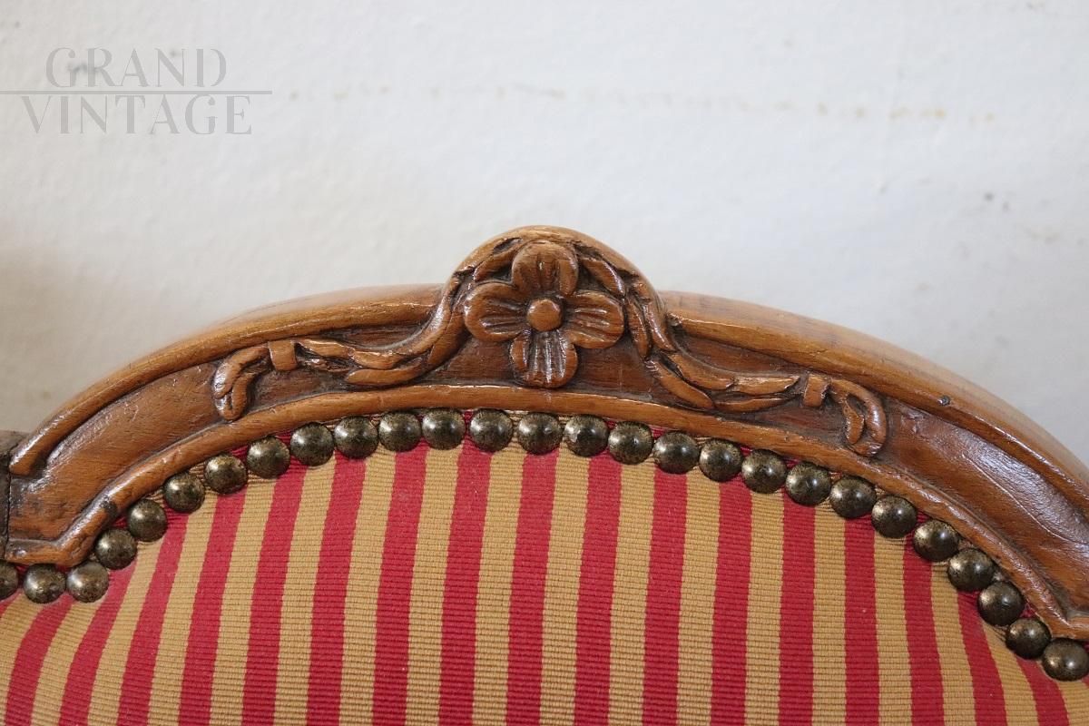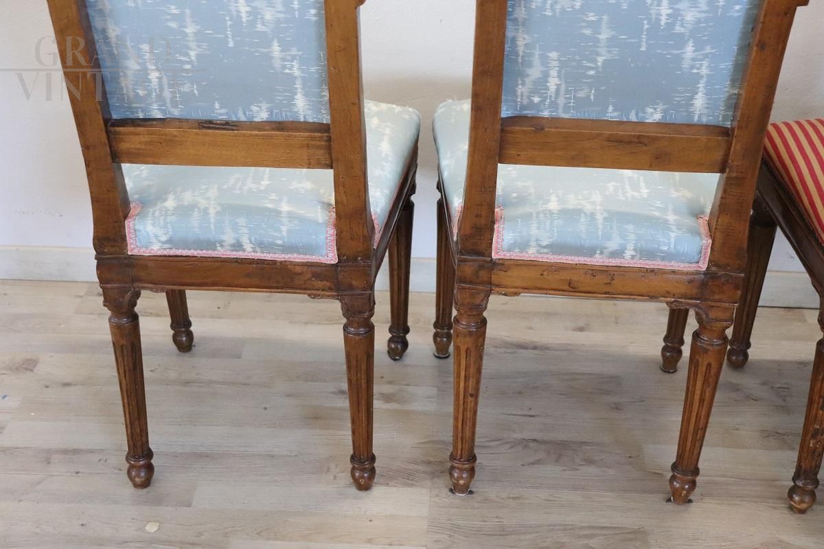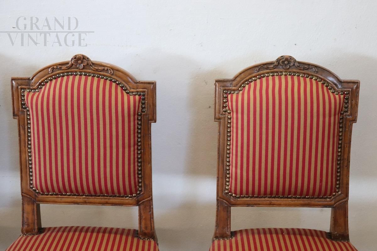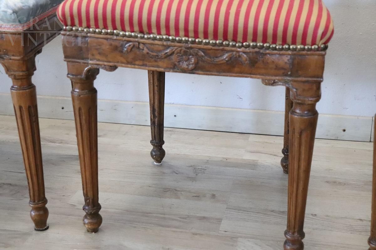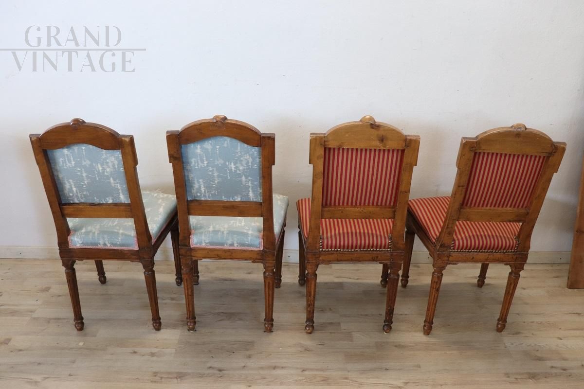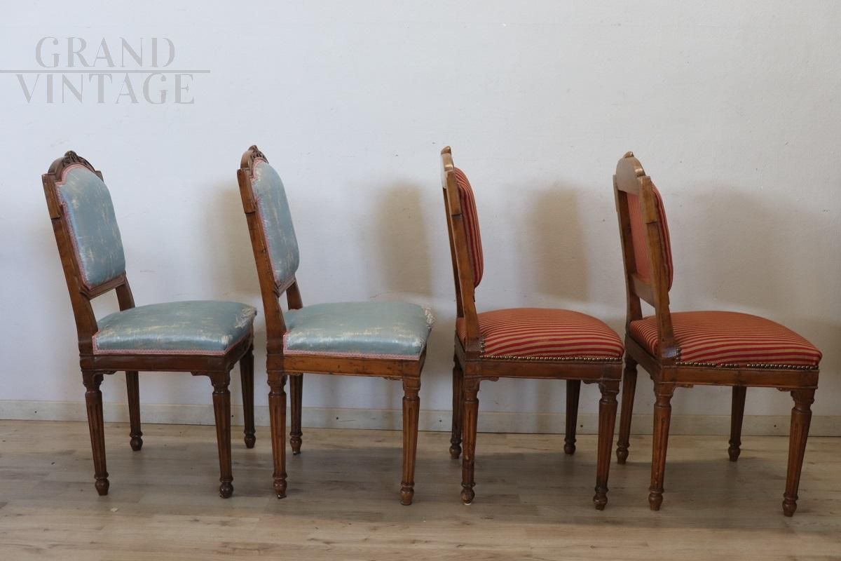 Set of 4 antique dining chairs from the Louis XVI period - 18th century, in finely carved solid walnut wood. The chairs are characterized by a padded seat and back which make them very comfortable. Very linear with small and refined decorations carved into the wood. The wood and padding are in perfect condition, but the fabric needs to be replaced, especially for a pair of chairs. Perfect for an important dining table. Price negotiable.
