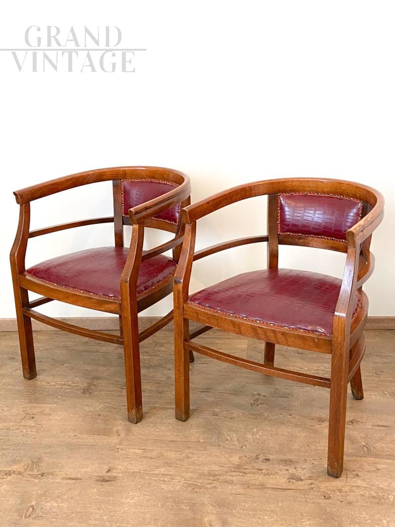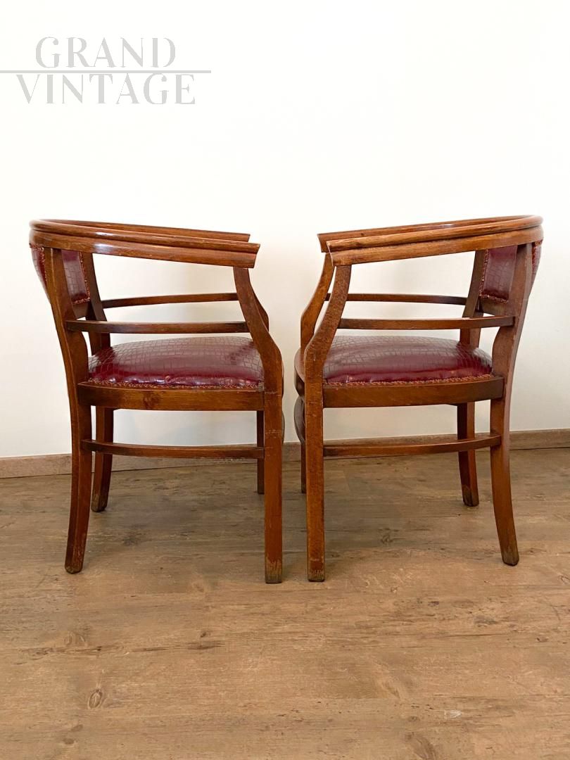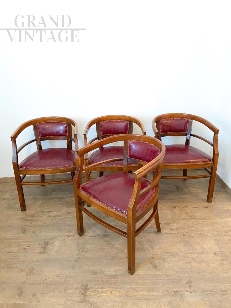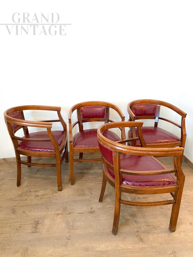 Set of 4 Art Deco wooden tub chairs with seat and back in burgundy python-effect eco-leather, Italy 1940s. The chairs are in excellent condition, coming from a historic bar in the city of Verona, the upholstery is intact in imitation leather, very comfortable.