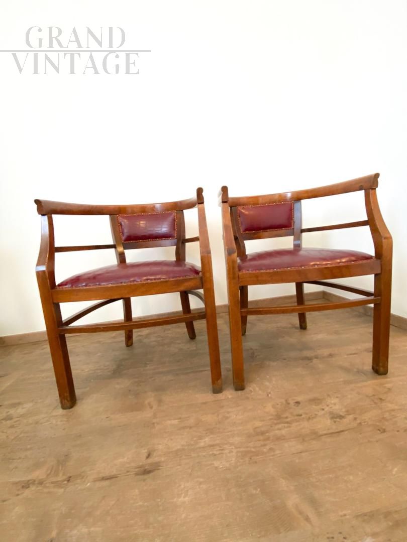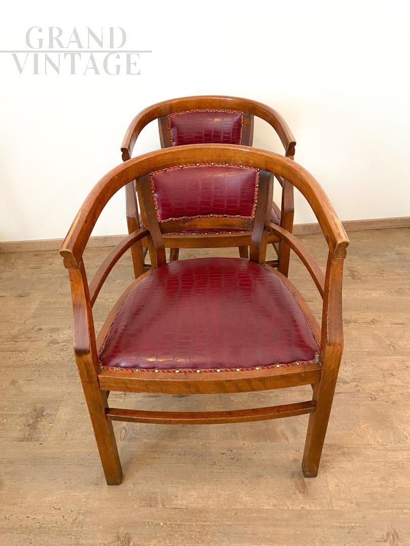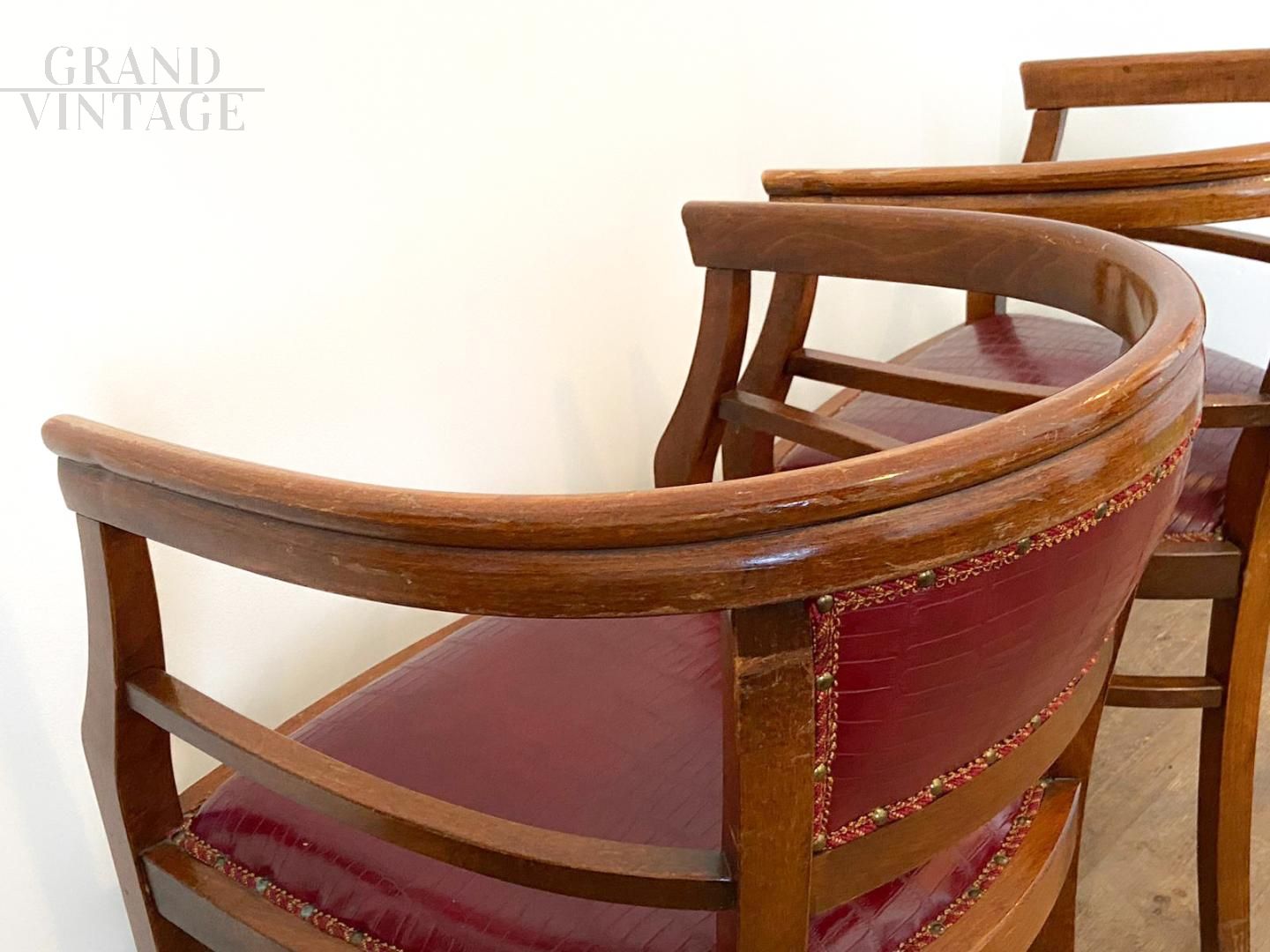 Set of 4 Art Deco tub chairs in wood and burgundy skai, Italy 1940s