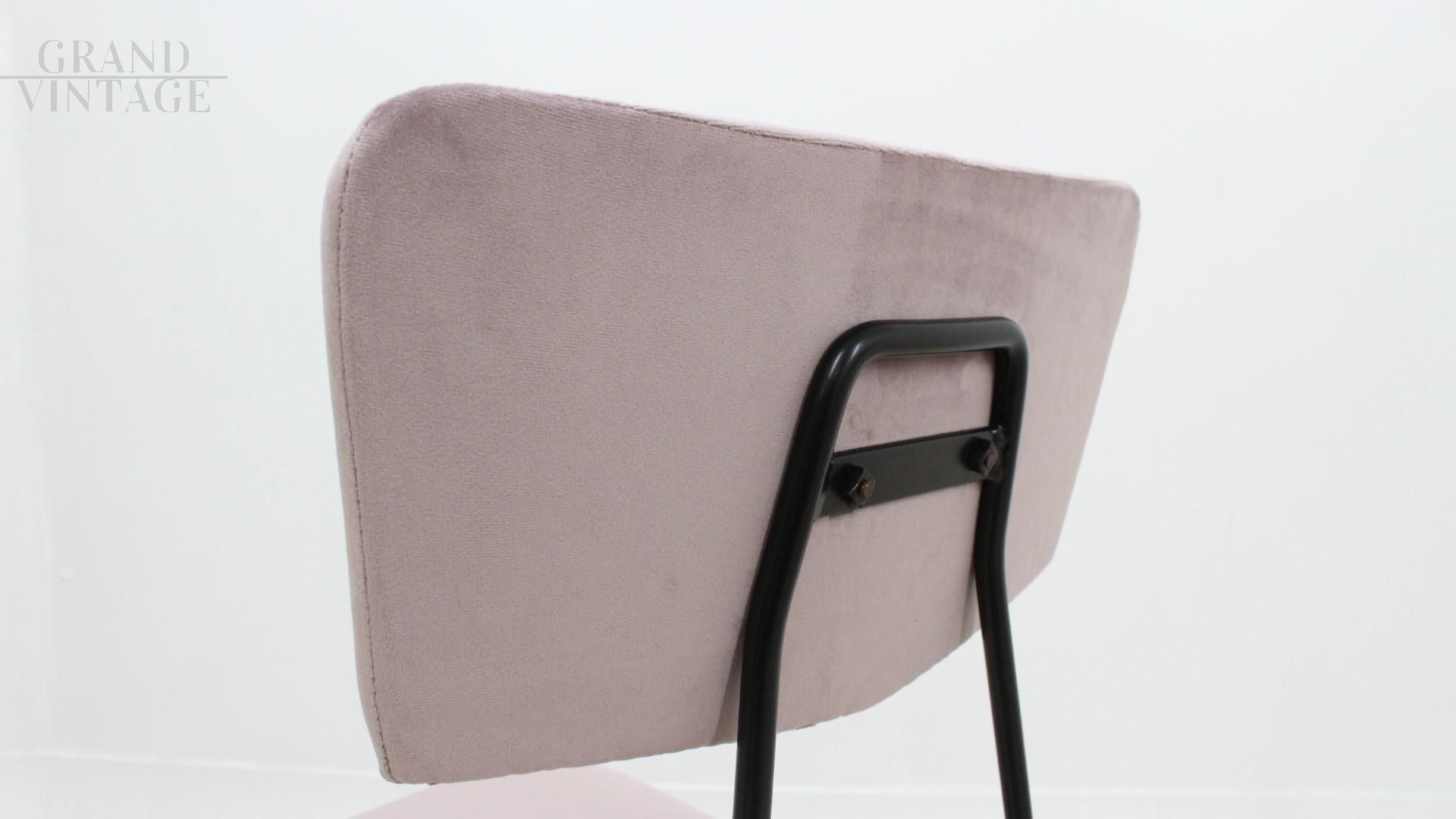 Set of 4 dining chairs with a minimal design in the BBPR style, with black lacquered tubular iron structure and padded seat and backrest newly upholstered in powder pink velvet. In excellent condition, the chairs have been totally restored and are ready to furnish your living room!