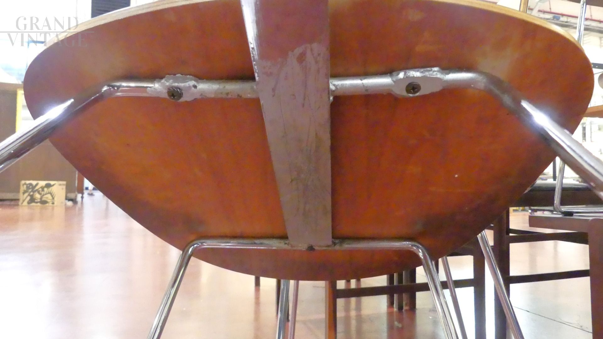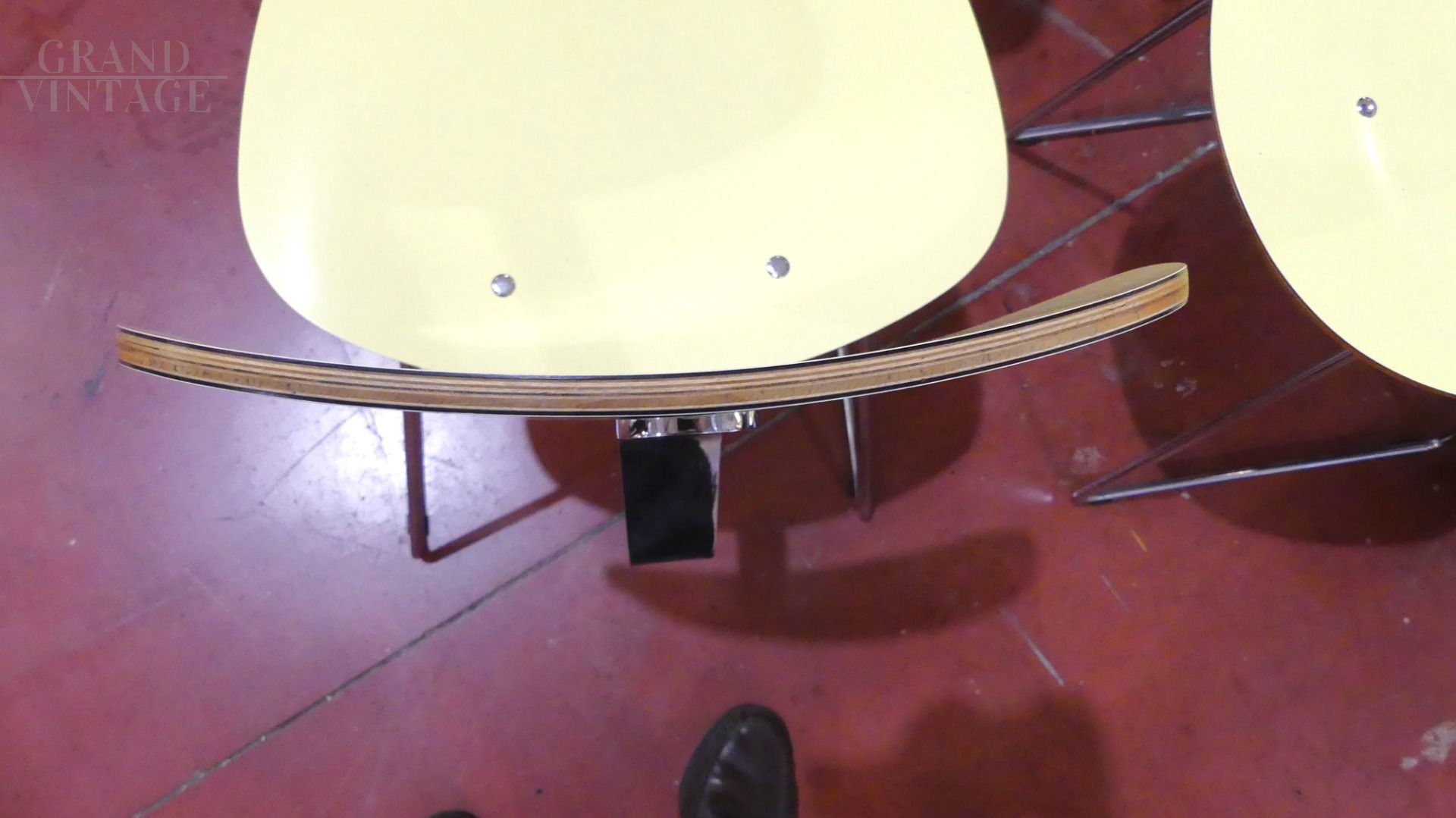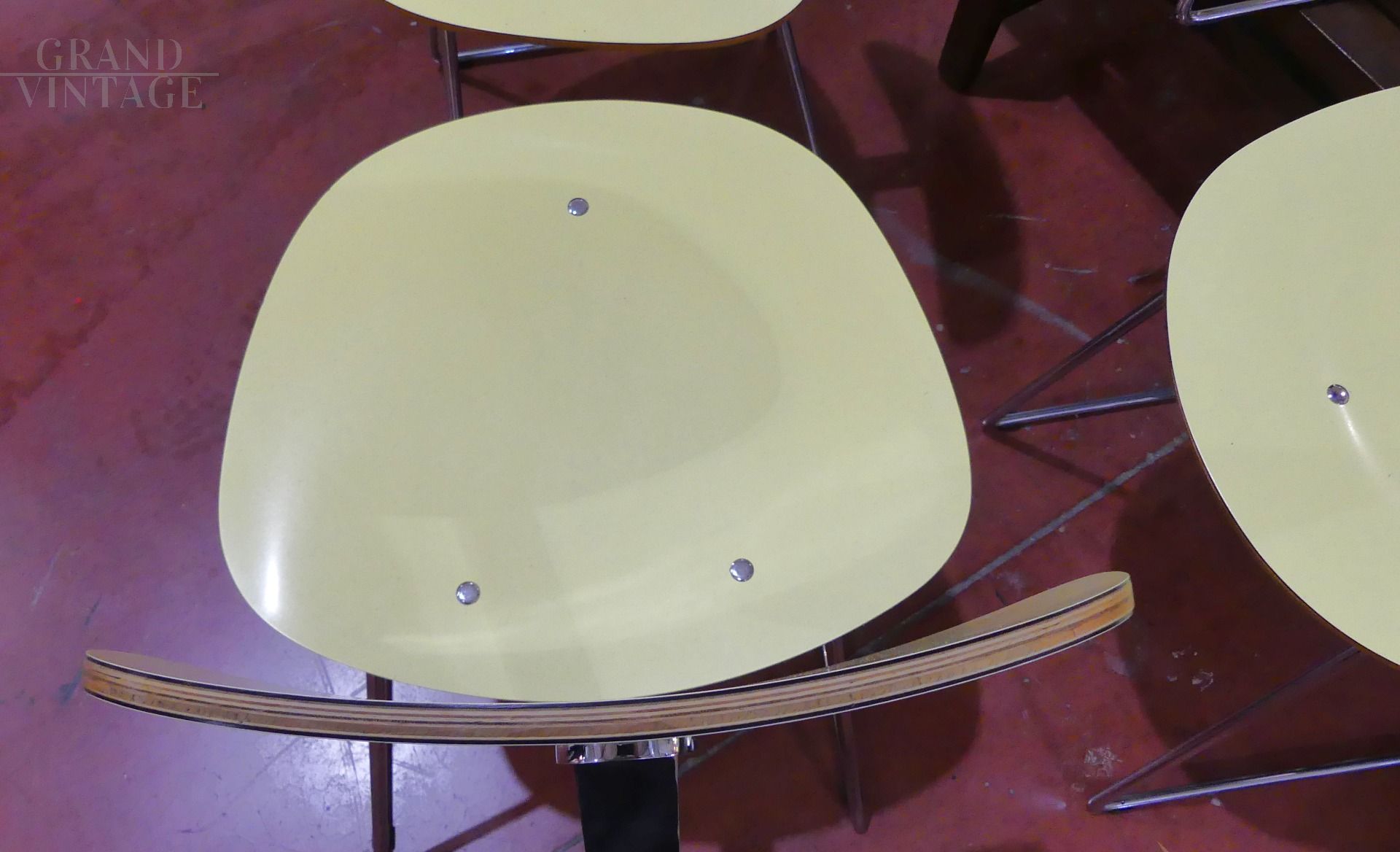 Set of 4 design chairs by Georgs Coslin with iron structure and seat and back in thick formica in pastel yellow color, 1970s, the formica is in perfect condition. The chairs are complete with rubber feet.