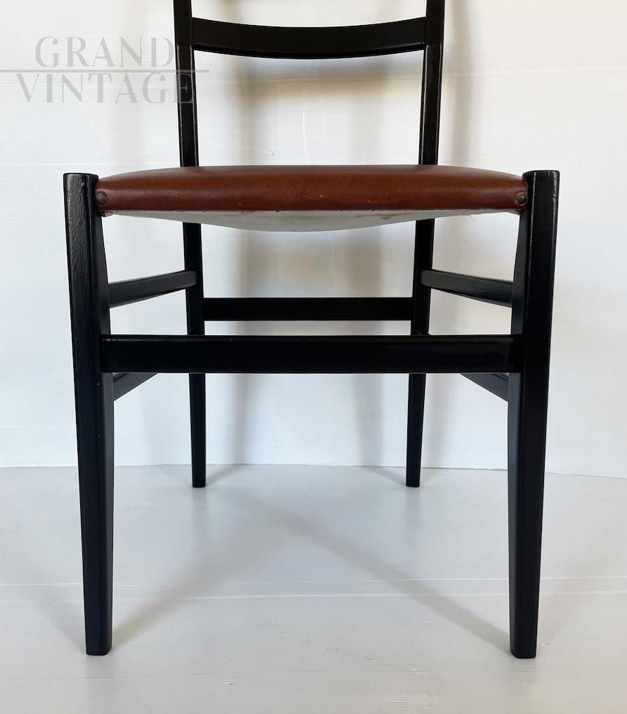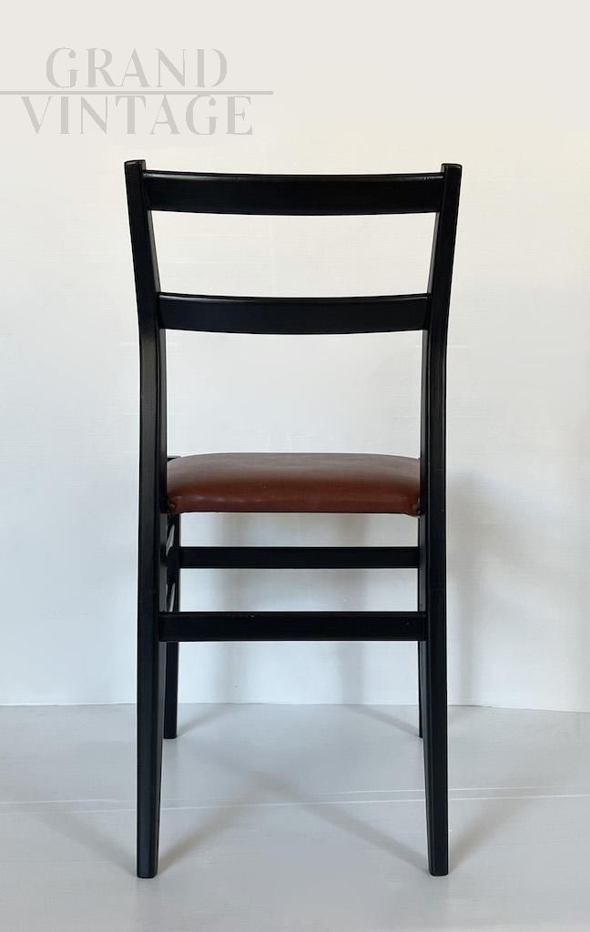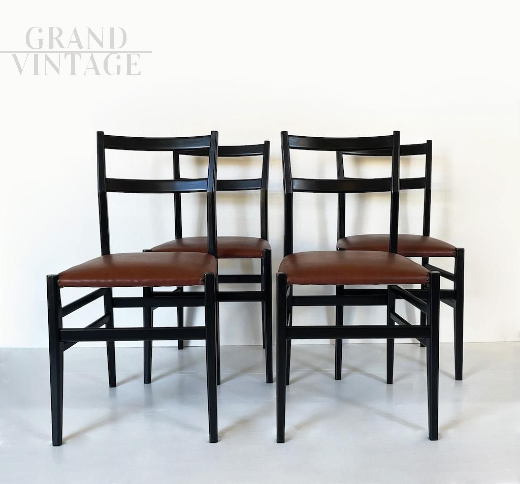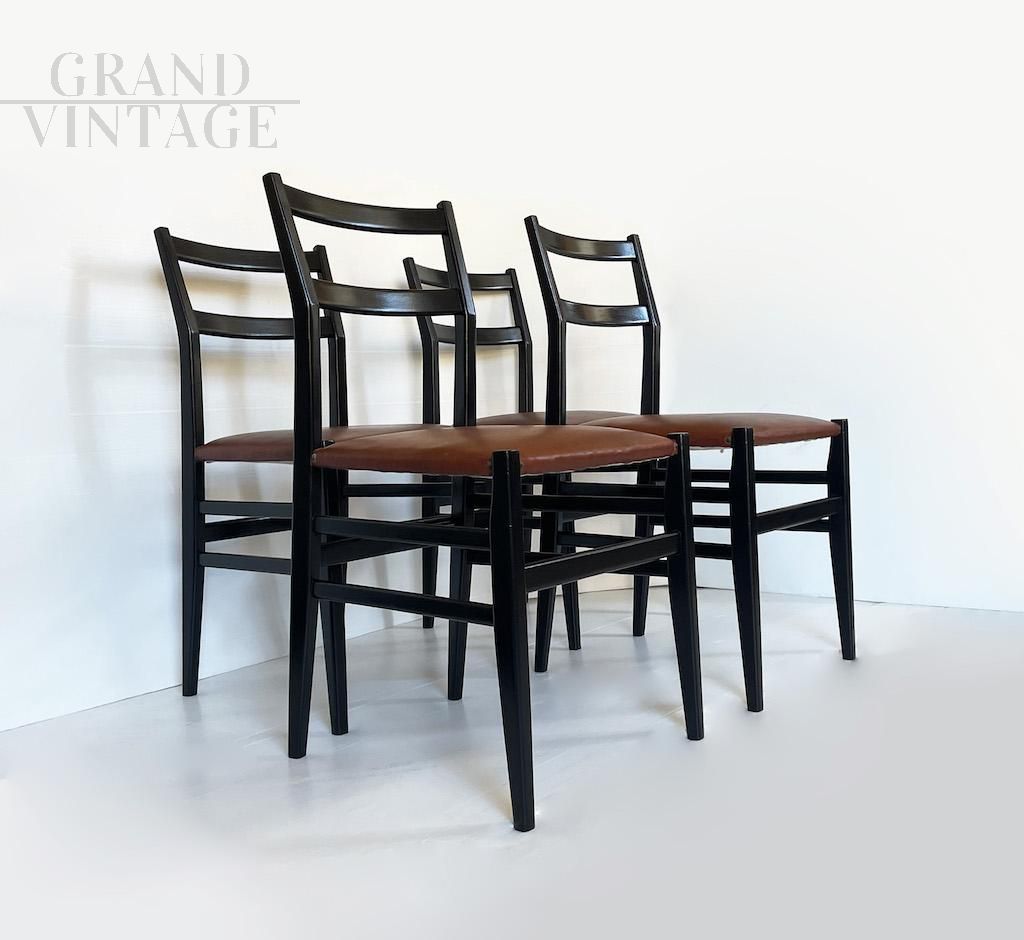 Set of 4 original Leggera chairs by Gio Ponti for Cassina from the 1950s, in perfect condition, with structure entirely in black lacquered ash wood and seat upholstery in original burgundy-brick colored skai from the time. This chair model is a true icon of Italian design.