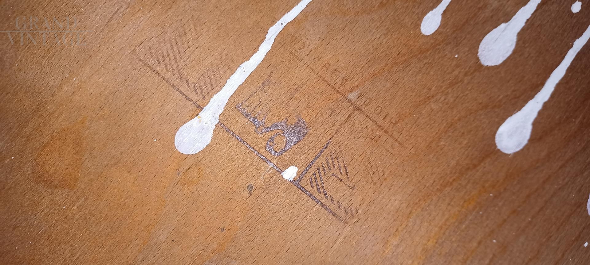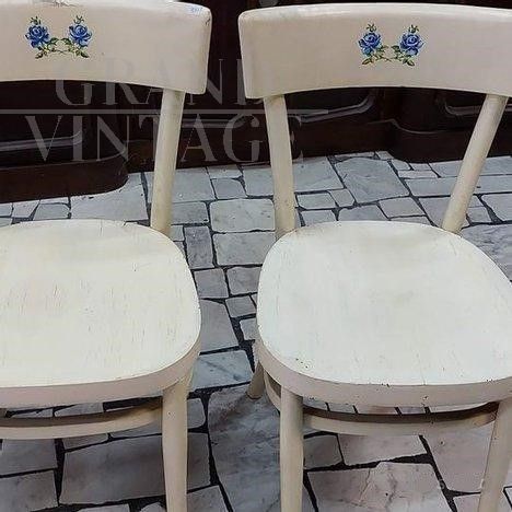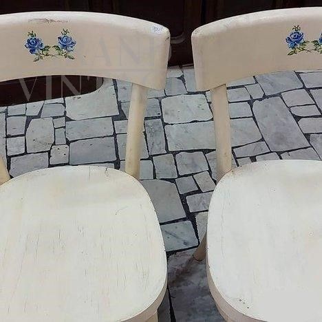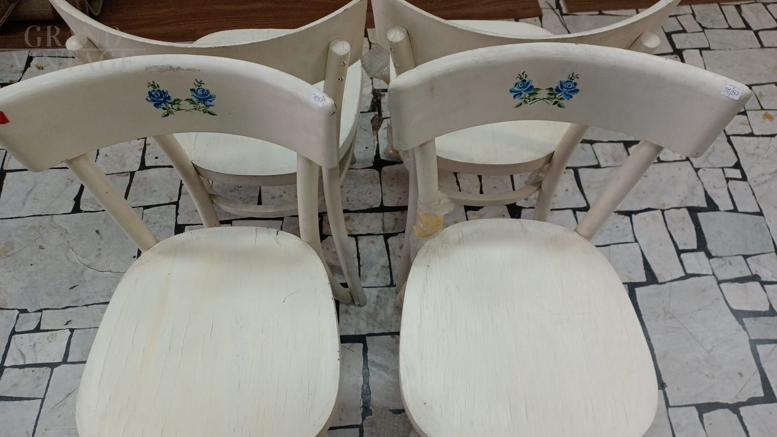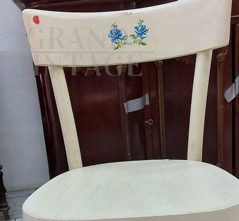 Set of 4 Sautto and Liberale chairs, all with original brand, in white lacquered beech with blue floral designs on the back.