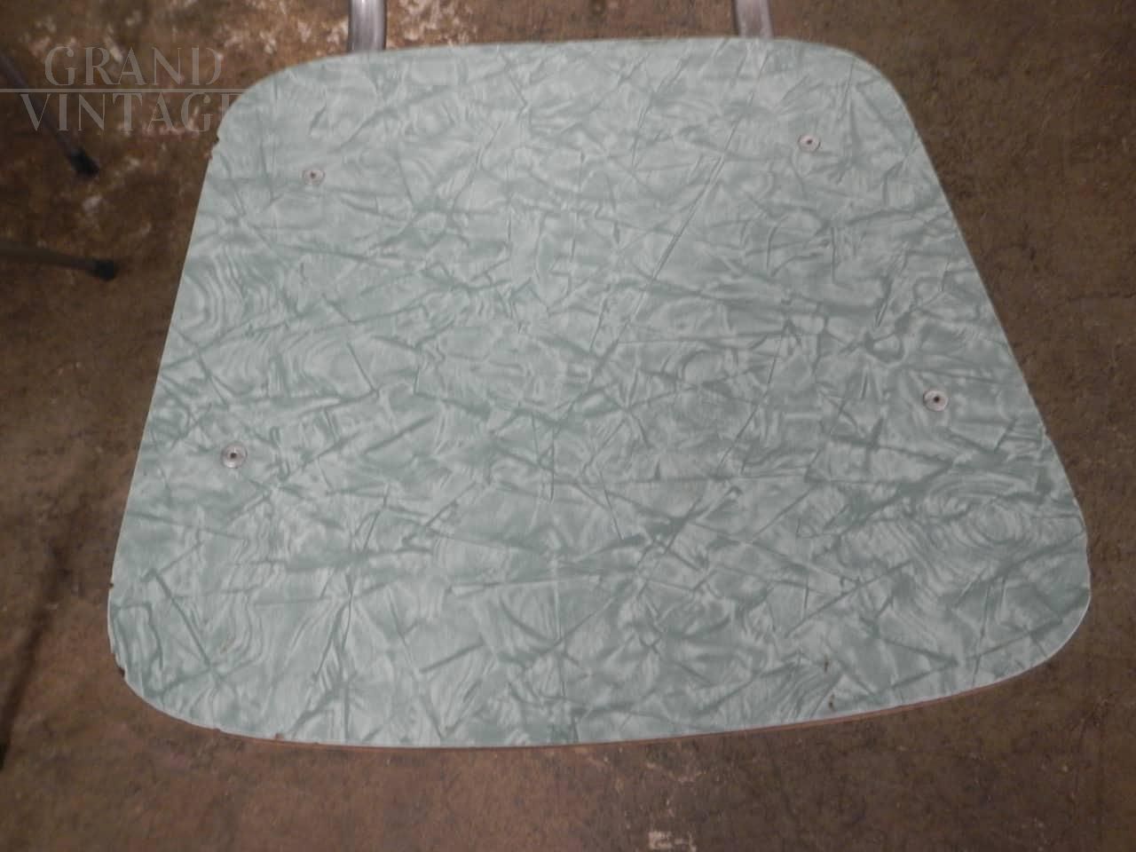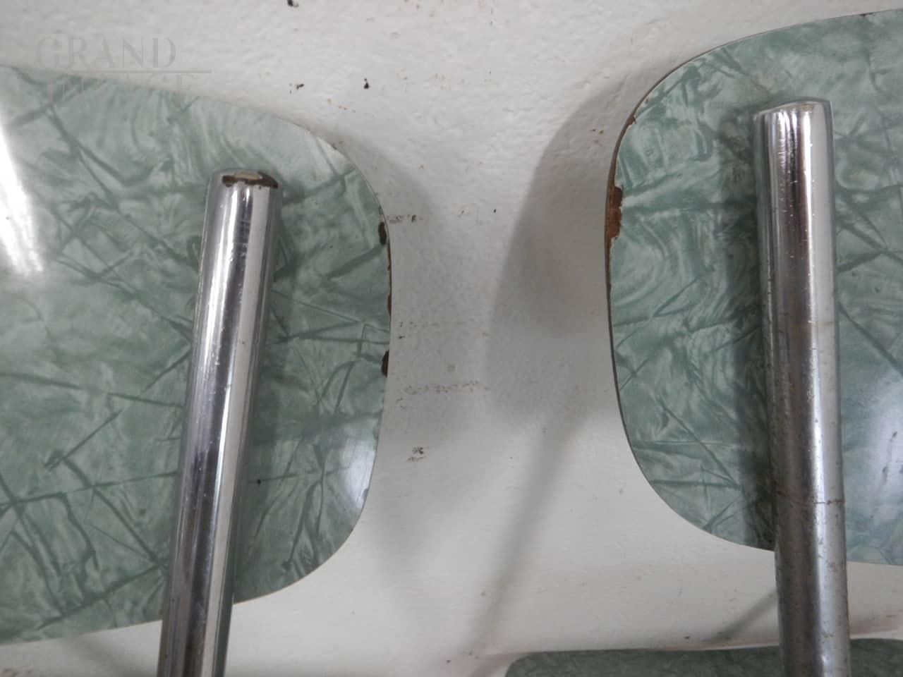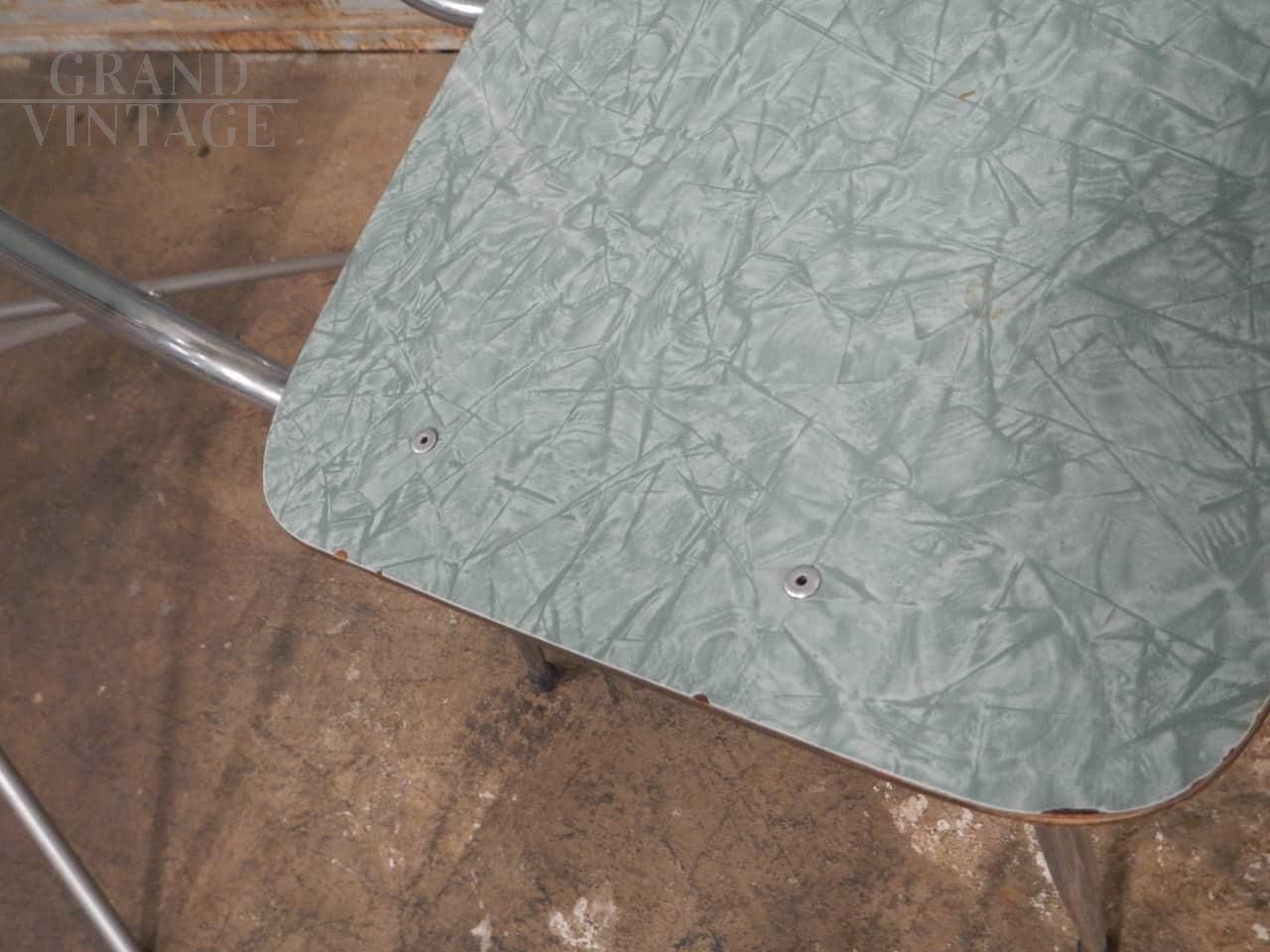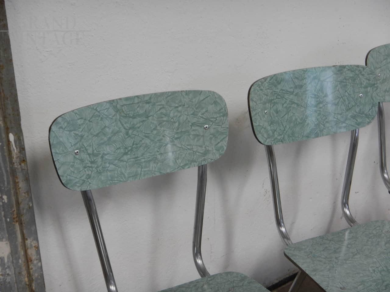 Set of 4 speckled green formica dining chairs with gray painted metal structure. Few defects, highlighted in the photos. The seat measures 45 cm.