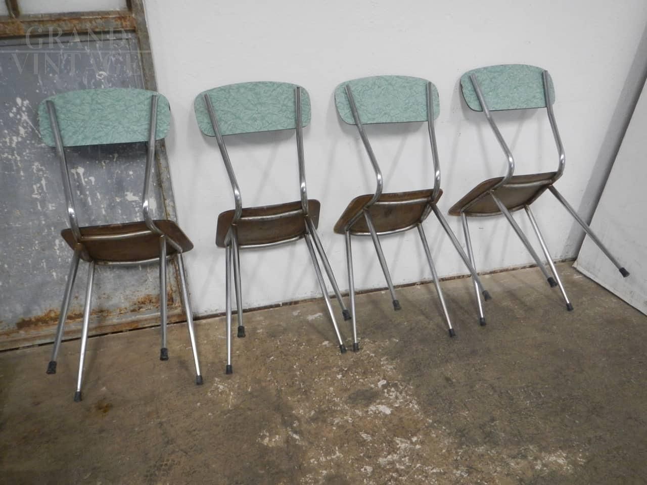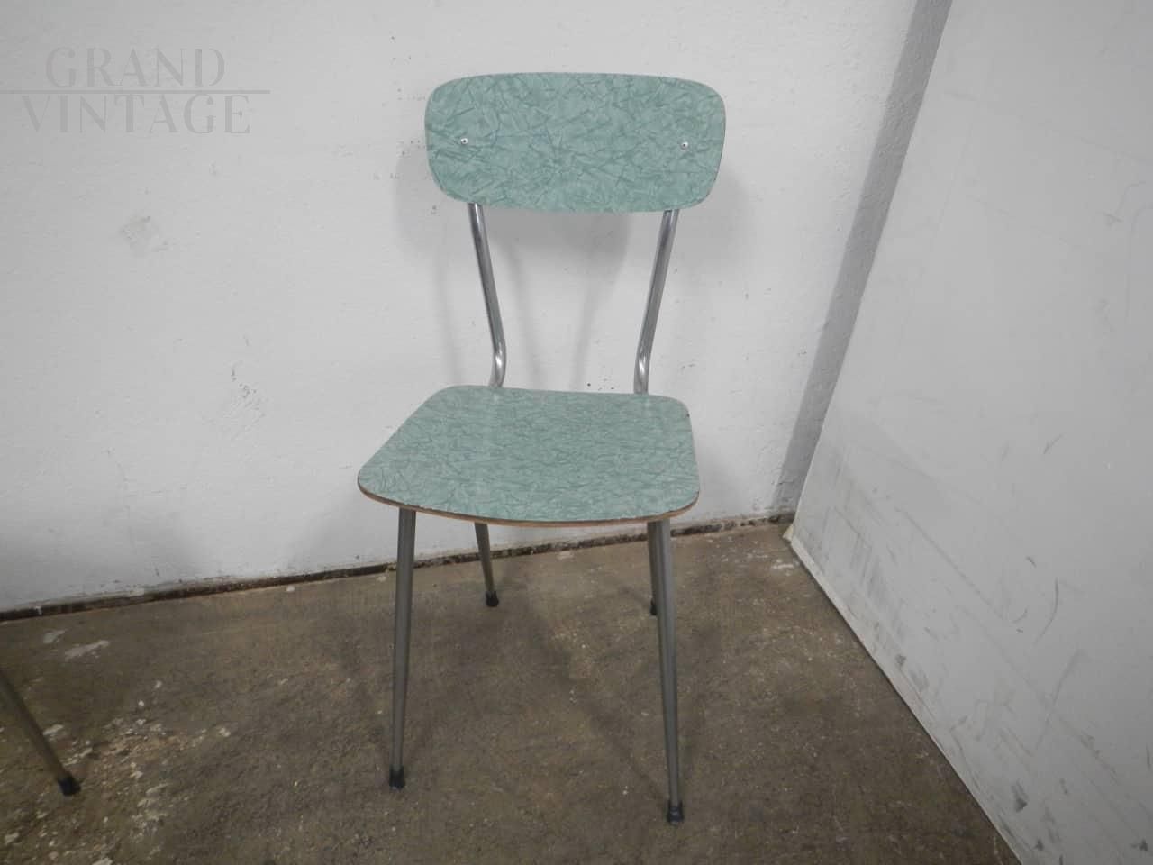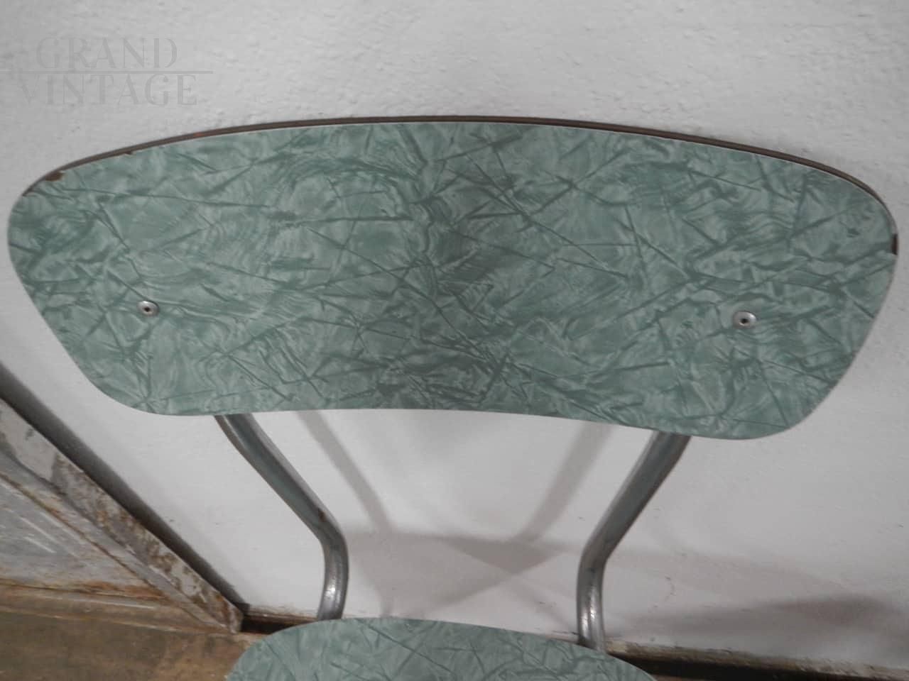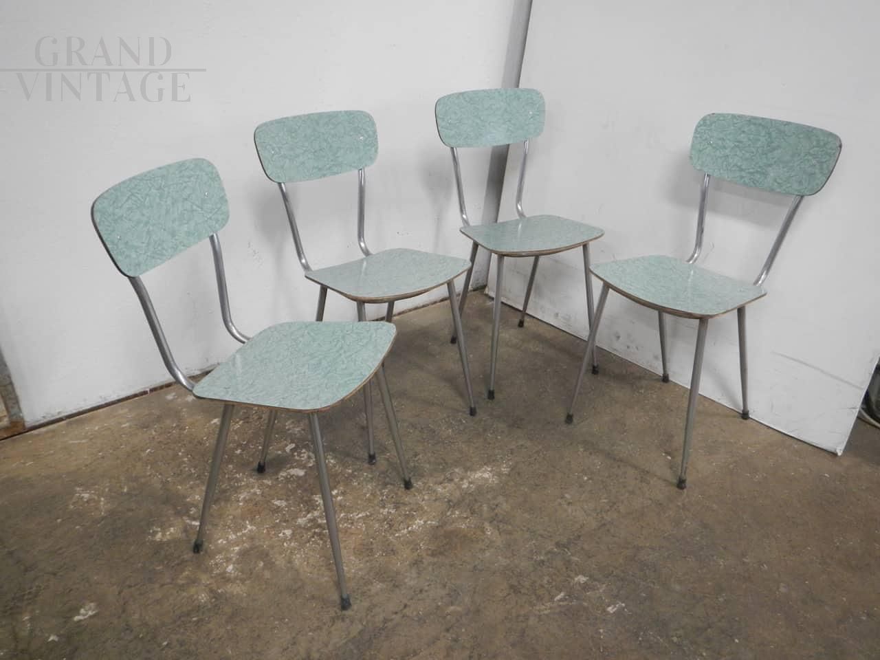 Set of 4 vintage speckled green formica dining chairs with gray painted metal frame. Slight defects highlighted in the photos. The seat measures 45 cm.