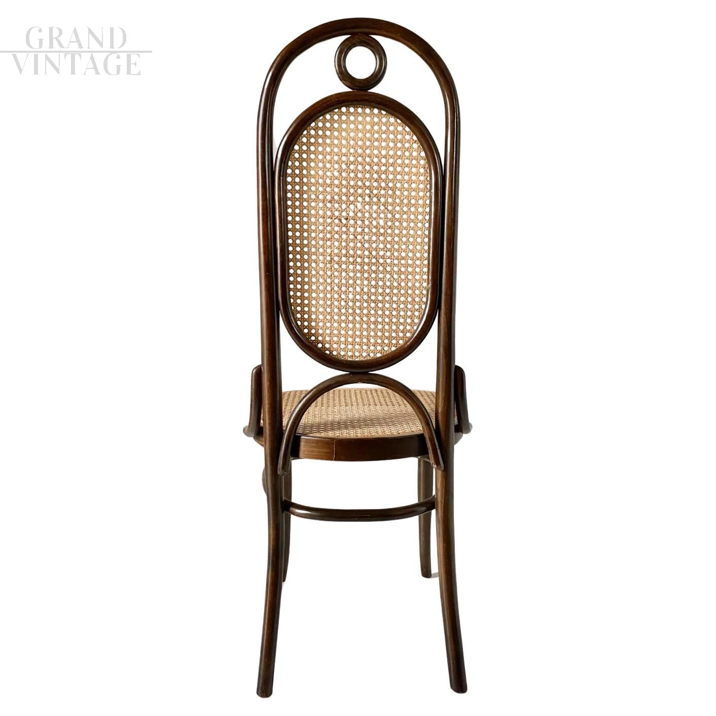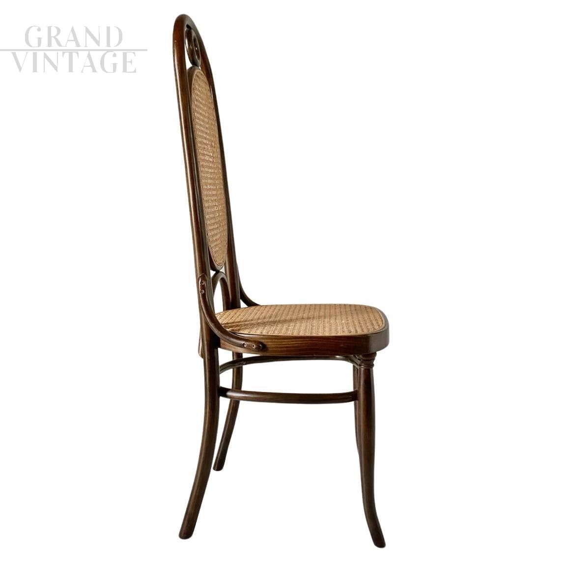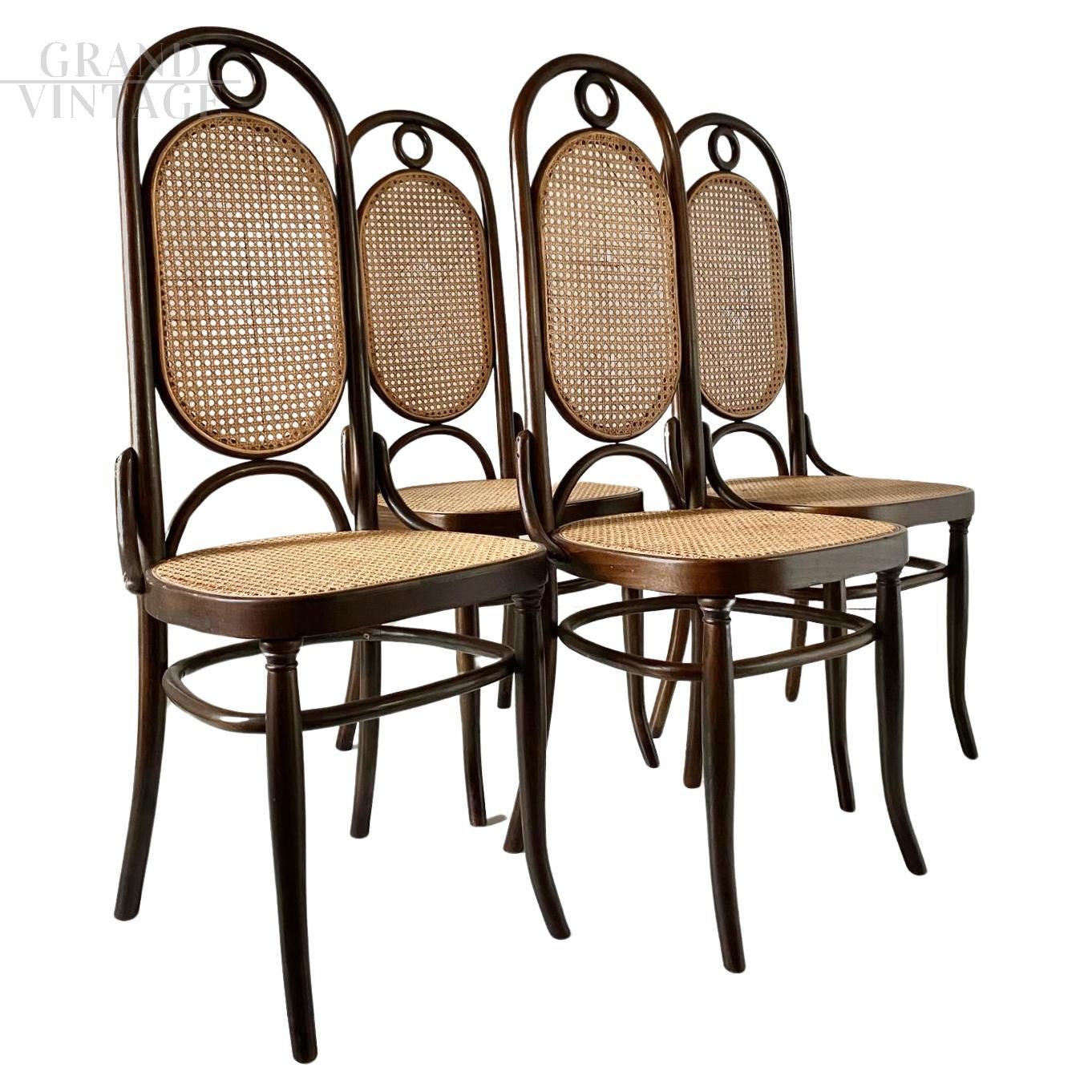 Set of four Thonet 207 Long John chairs with high backrest, in curved walnut wood, 1970s. In very good condition, with only small signs of aging. Completely restored. Seat in very good condition. Seat height 47 cm.