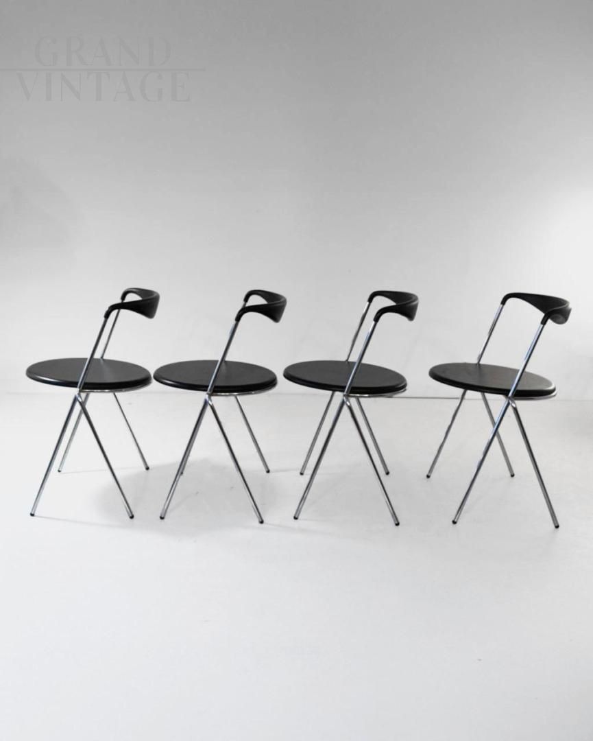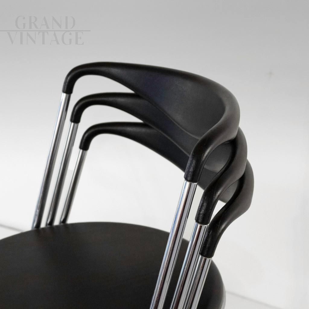 An elegant set of four dining chairs, an example of refined Italian craftsmanship from the 1970s. These chairs embody the clean lines and functional elegance typical of the Space Age and Rationalist styles. Each chair features a polished chrome tubular steel frame, paired with a rounded seat and curved backrest in durable black molded plastic. The chairs are stackable, making them convenient to store and transport, ideal for both residential and commercial spaces. Recently polished and professionally refinished by our team, the chairs are in excellent vintage condition, with a polished chrome finish and only light, age-appropriate wear on the plastic surfaces. They are structurally sound, comfortable, and ready to use.