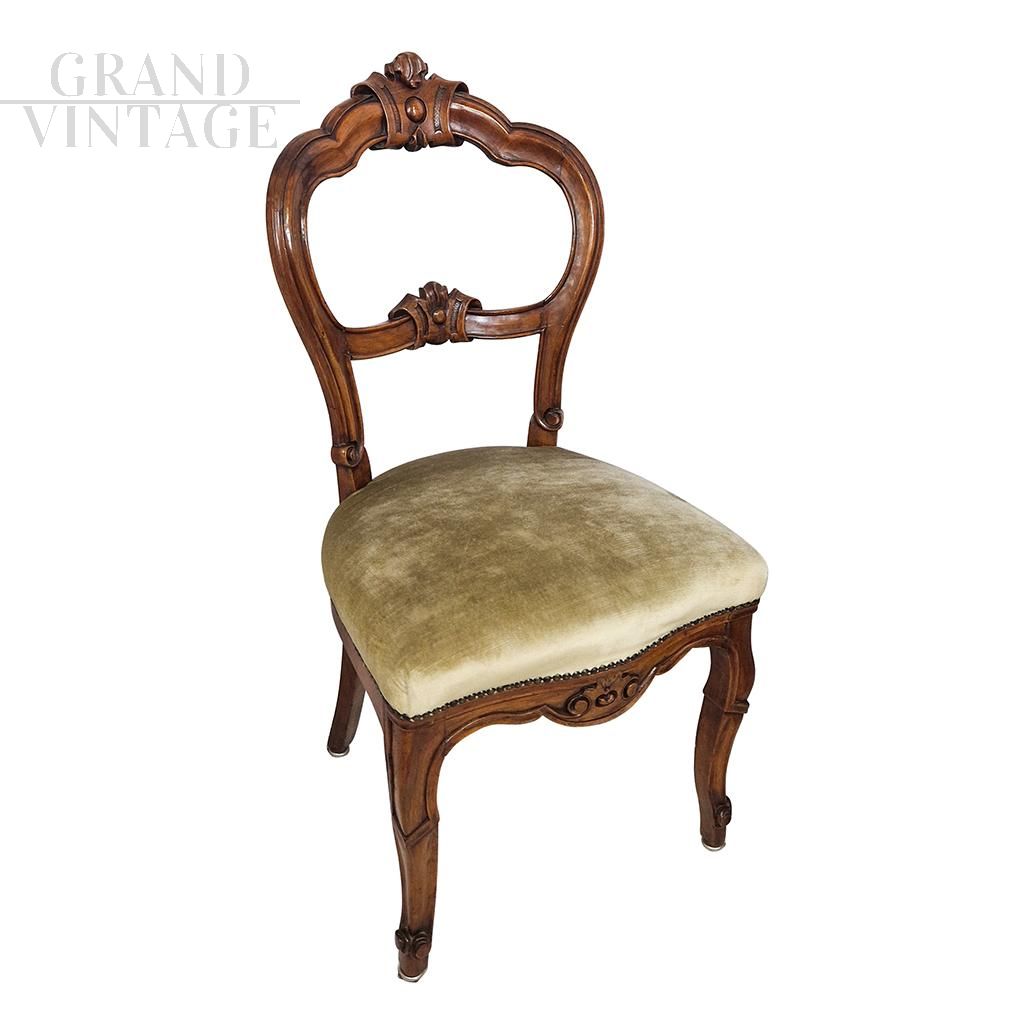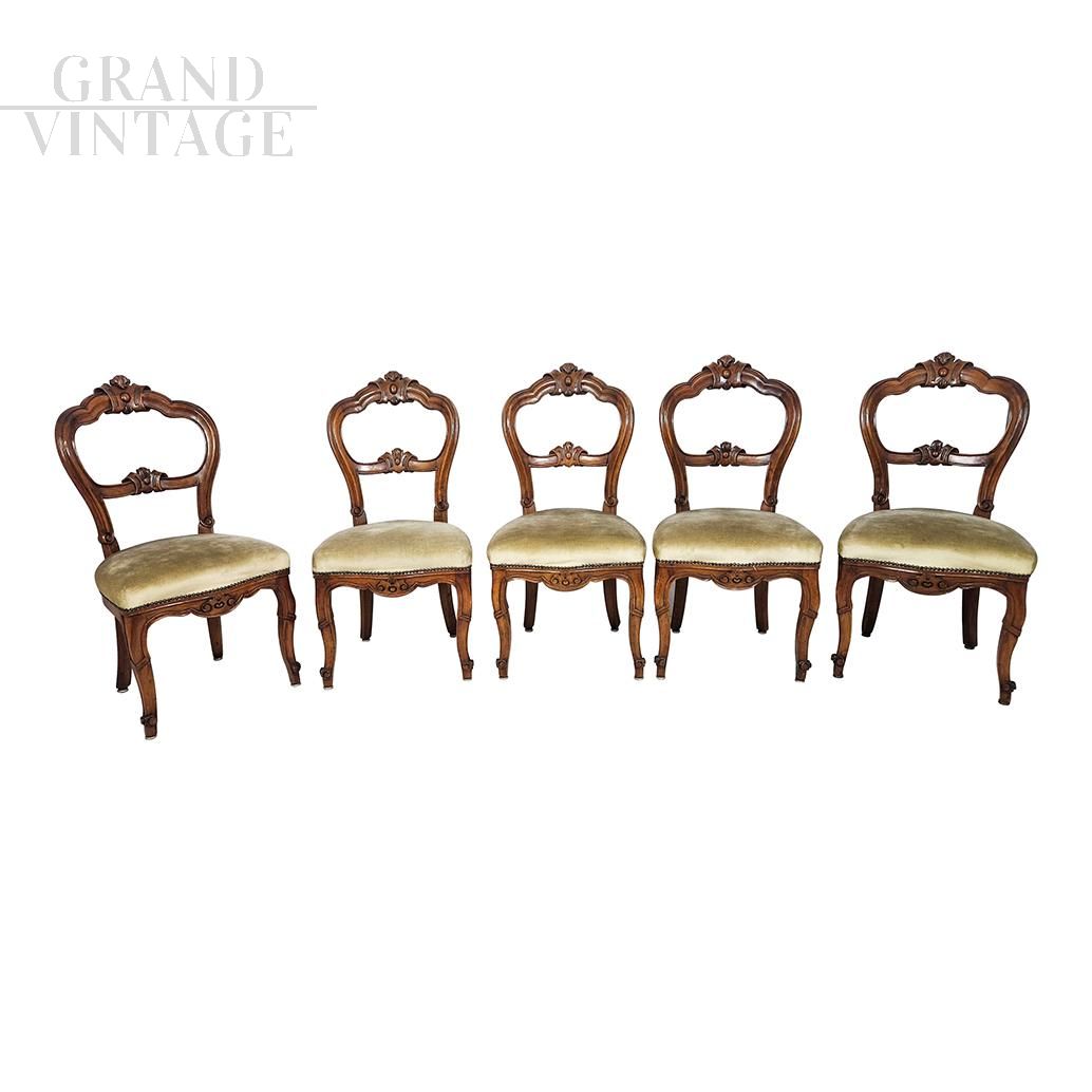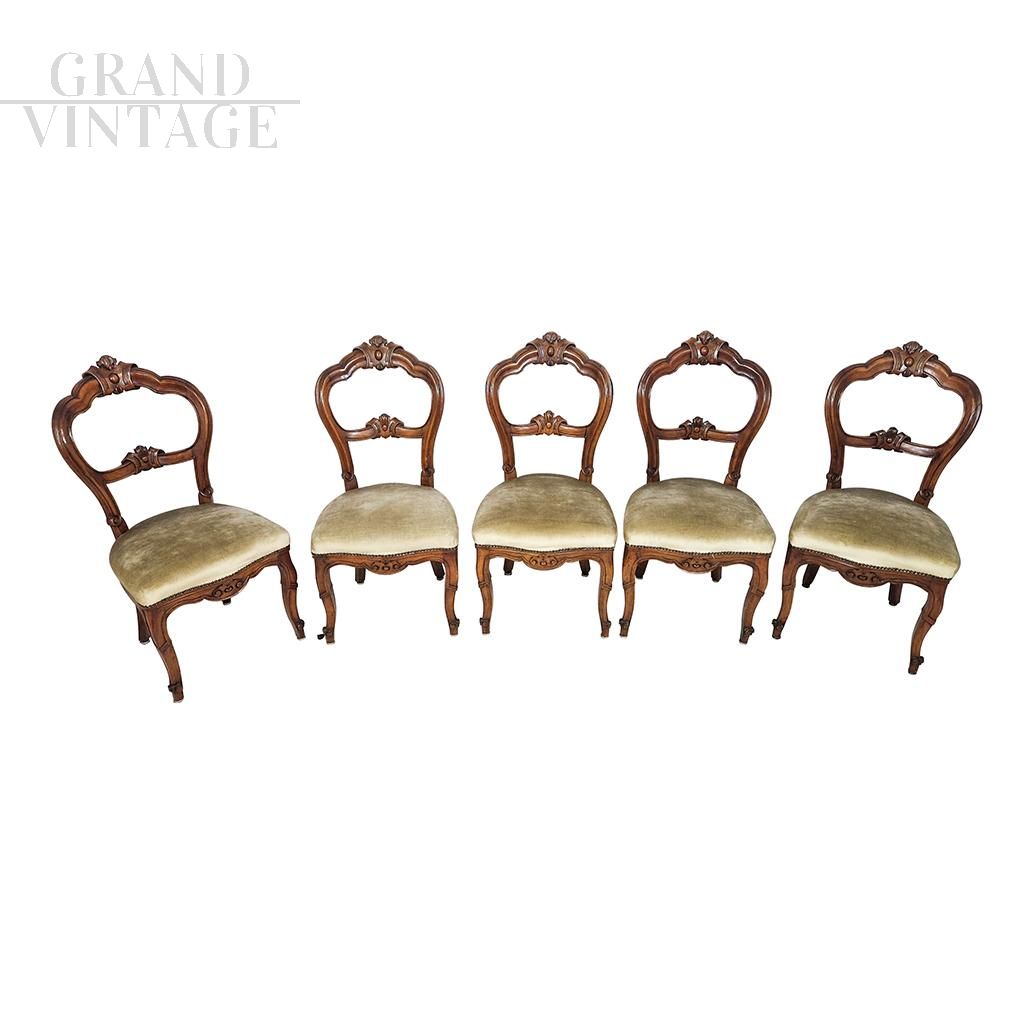 Set of 5 antique Louis Philippe style wooden chairs with upholstered seat in original fabric of the time.