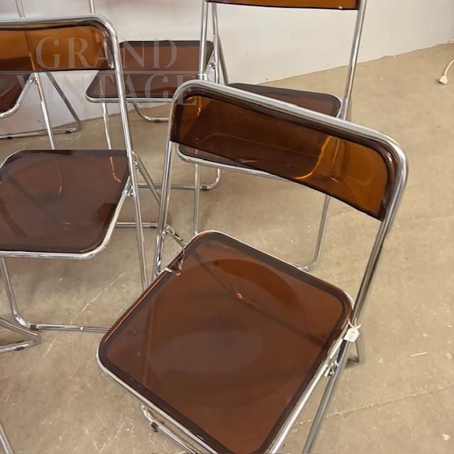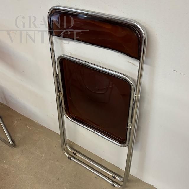 Set of six vintage folding chairs in metal and smoked plexiglass in the classic brown color of the era, Italian mid-century modern design from the 1970s. In good overall condition, with minor signs of normal wear due to age. Original items.
