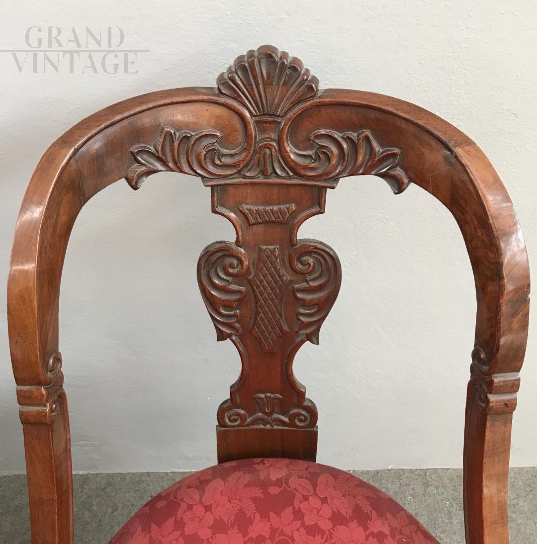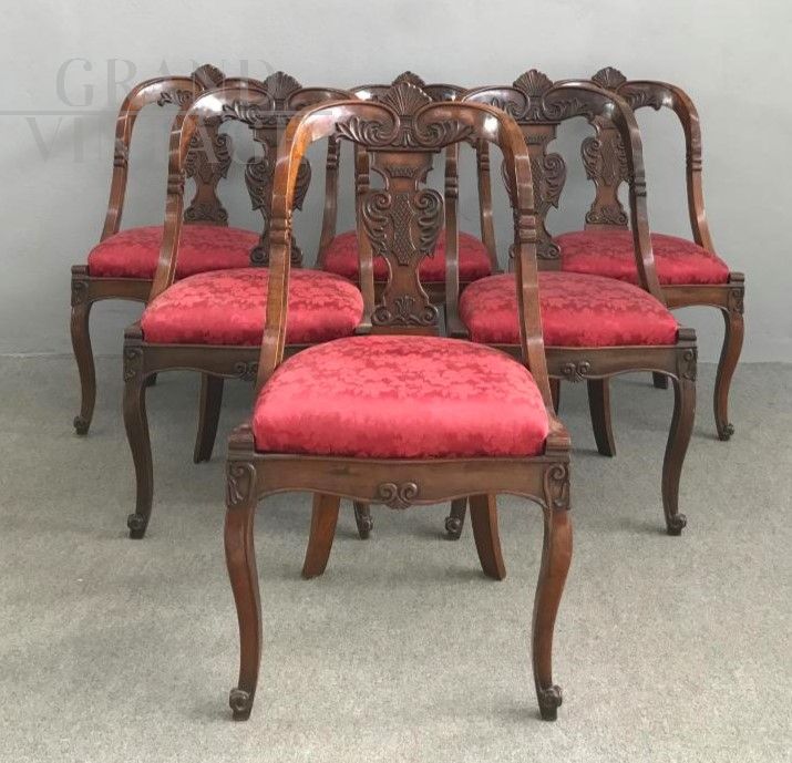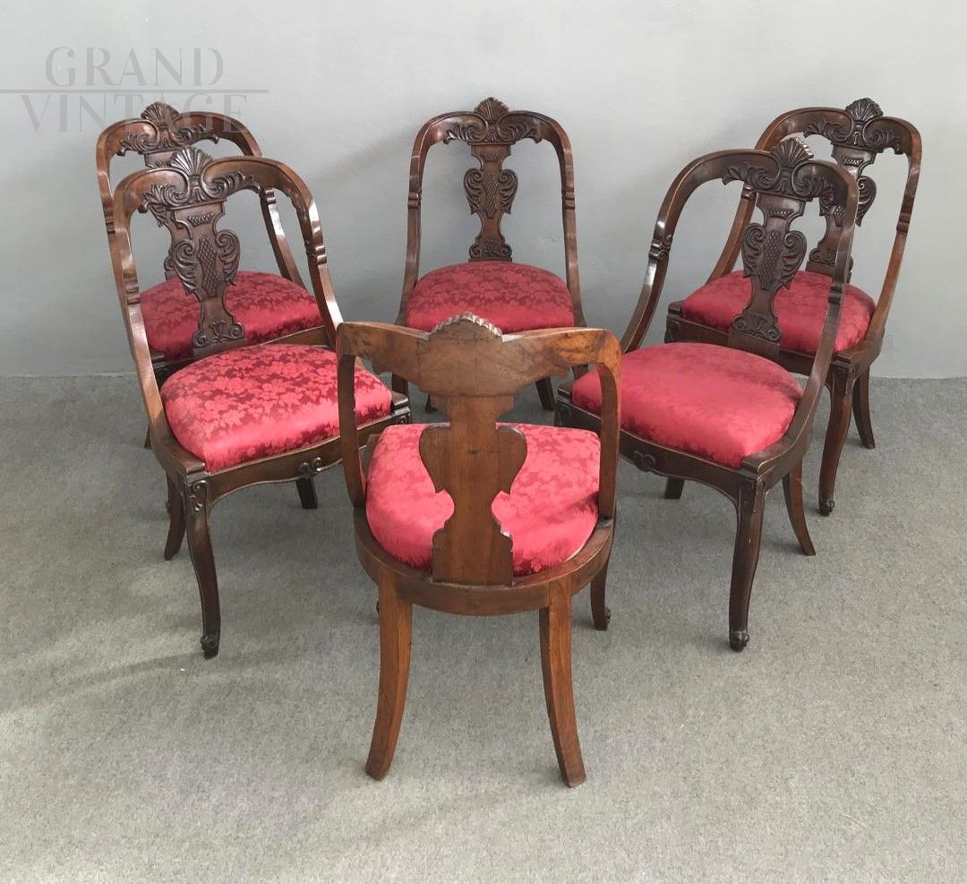Set of 6 antique gondola chairs in walnut, Empire period 19th century, finely carved in solid wood, upholstered seats covered with damask fabric.