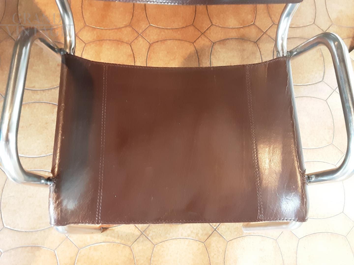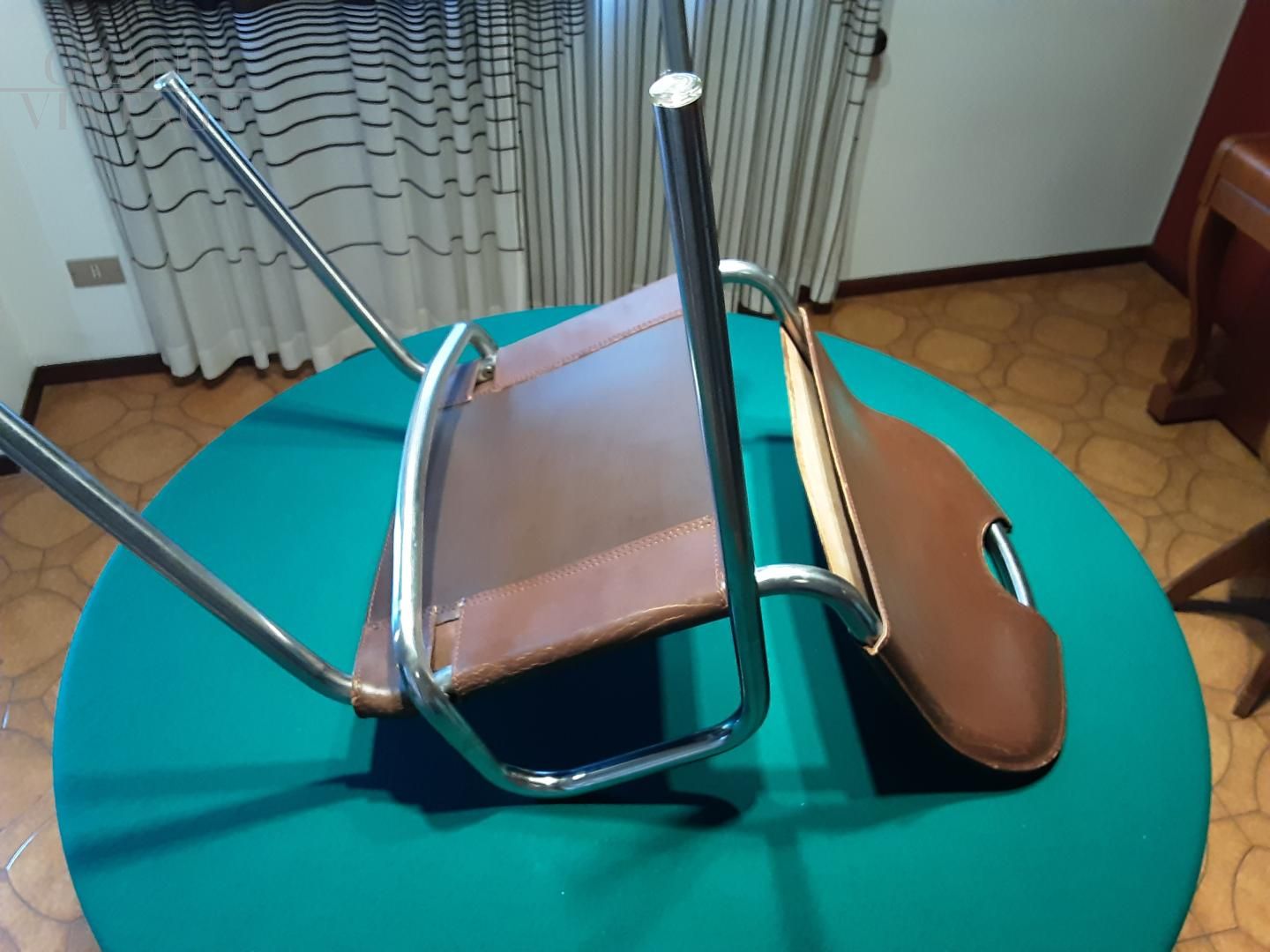 Set of 6 Castiglia chairs by Zanotta in brown full grain leather, with tubular stainless steel structure. They feature the brand both on the steel structure and on the seats, as shown in the photo. The original purchase invoice from 1975 also guarantees the originality of the set. Given their age, some of these seats show normal signs of wear, as shown in the photos. Others are in good condition, almost new, as they are on display. The chairs are stackable.