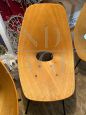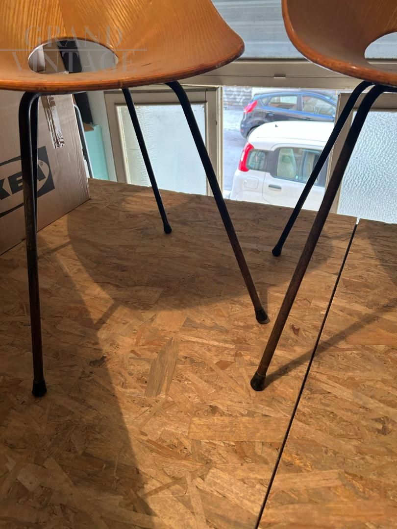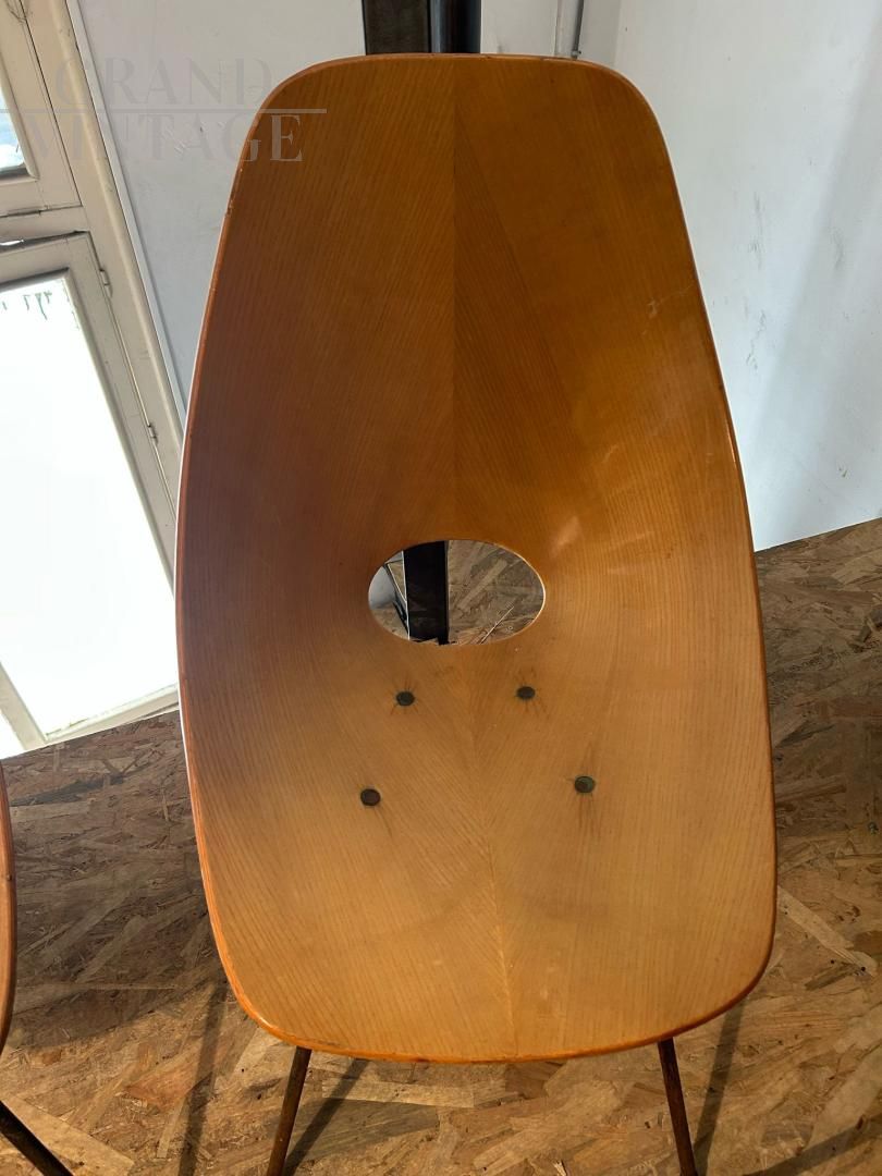 Set of 6 Medea chairs by Vittorio Nobili for Tagliabue from the 1950s in fine maple wood with legs formed by an iron structure. The chair is made of a single piece of thermoformed wood, 4 brass buttons allow the seat to be anchored to the metal structure.