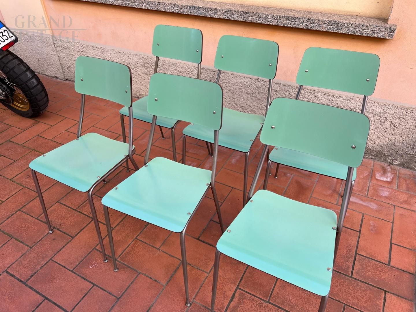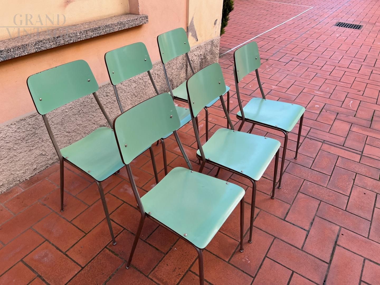 Set of 6 vintage chairs in aqua green Formica with metal structure, stackable and in good condition, with small physiological defects due to age. The seat is 45 cm high from the ground.