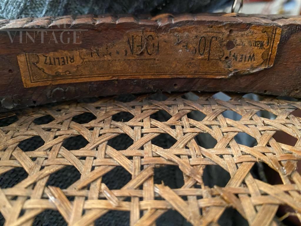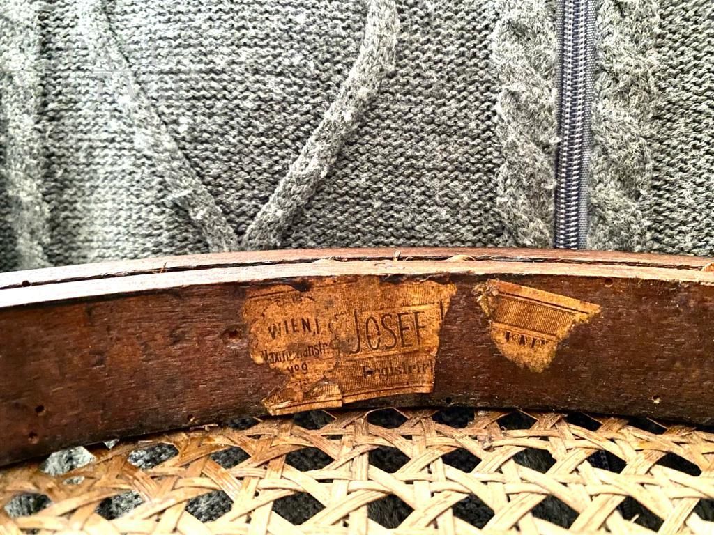 Set of eight dining chairs in bent beech and Vienna straw produced by Joseph Hofmann, Austria 1900. The structure has been strengthened and repaired, the original cane seats have been preserved, intact and in excellent condition. The wood has been refinished. In excellent condition, with signs of aging. Seat height: 48 cm.