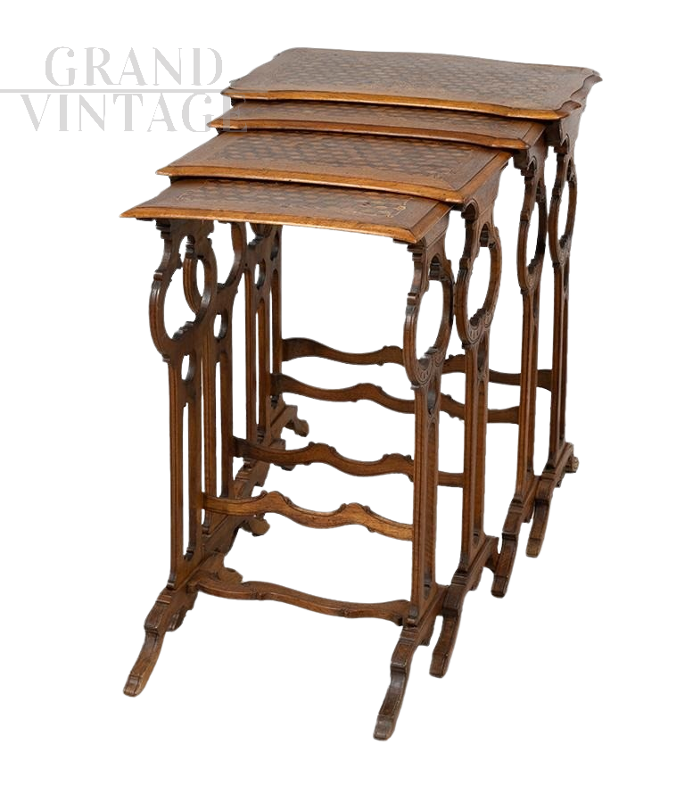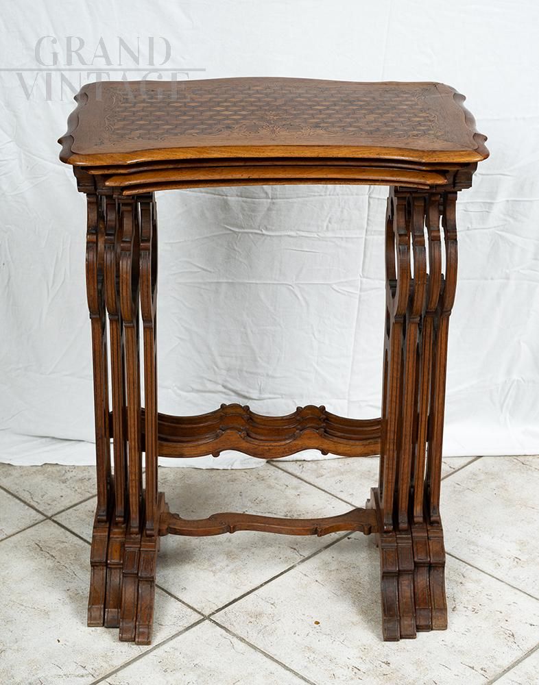 Set of four stackable nesting coffee tables in walnut with top inlaid with geometric motifs. The four tables are fitted together to recover as much space as possible. The tops have a curvilinear shape with a geometric inlay in the center surrounded by an inlay of racemes and flowers. The feet are fratinated and are connected by a mixed-line cross.