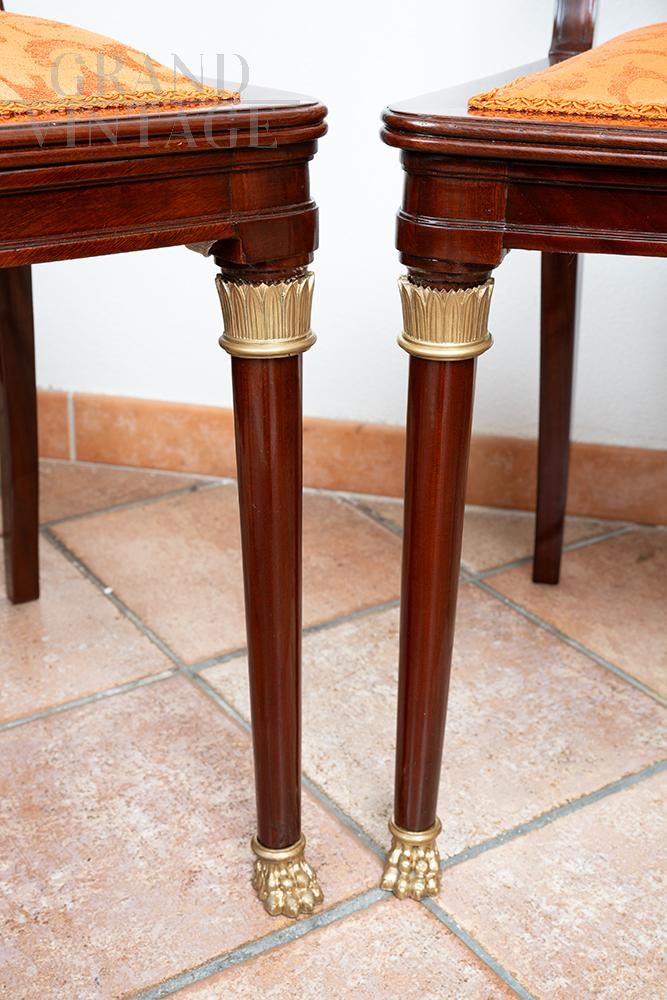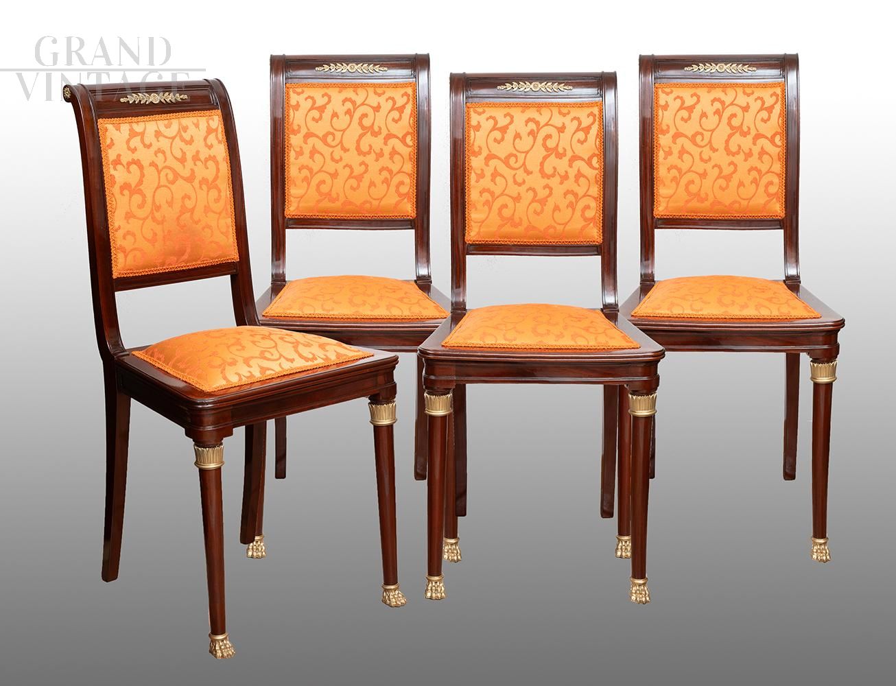 Set of four antique French chairs in solid mahogany and orange fabric, belonging to the second half of the 19th century. The quadrangular-shaped backrest is embellished with a bronze leaf element. The feet are truncated cone-shaped and end with clawed paws. Conditions: Restored and upholstered by master craftsmen using the traditional method. Provenance: 19th century France.